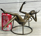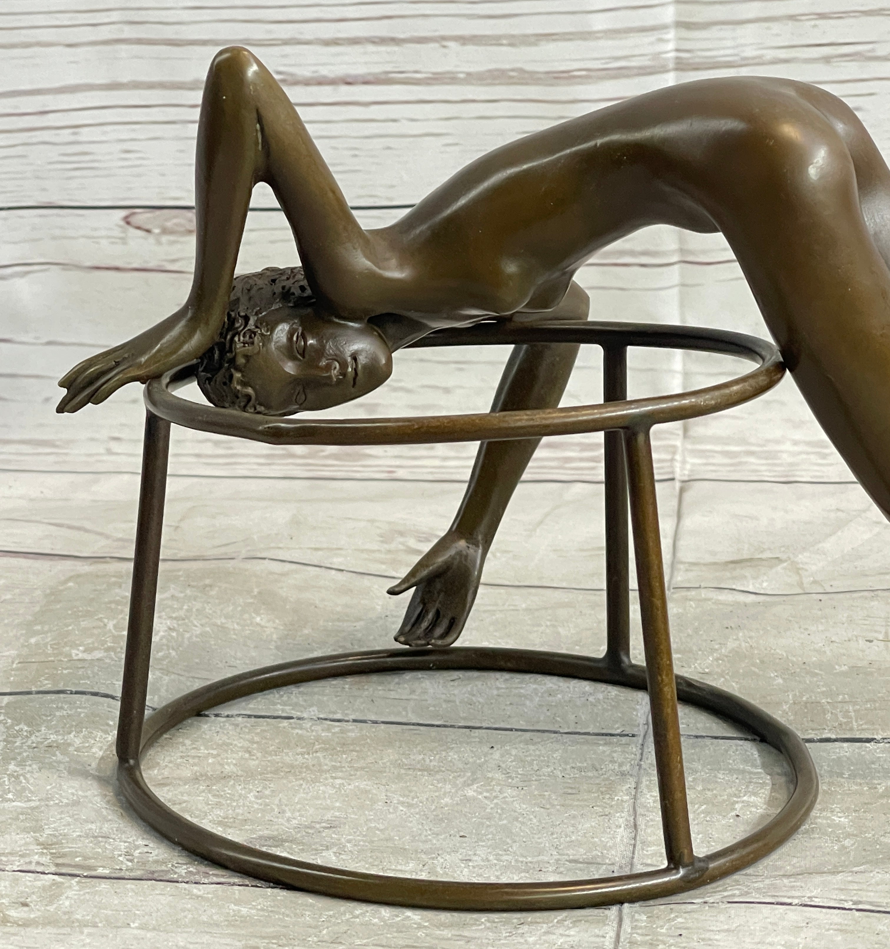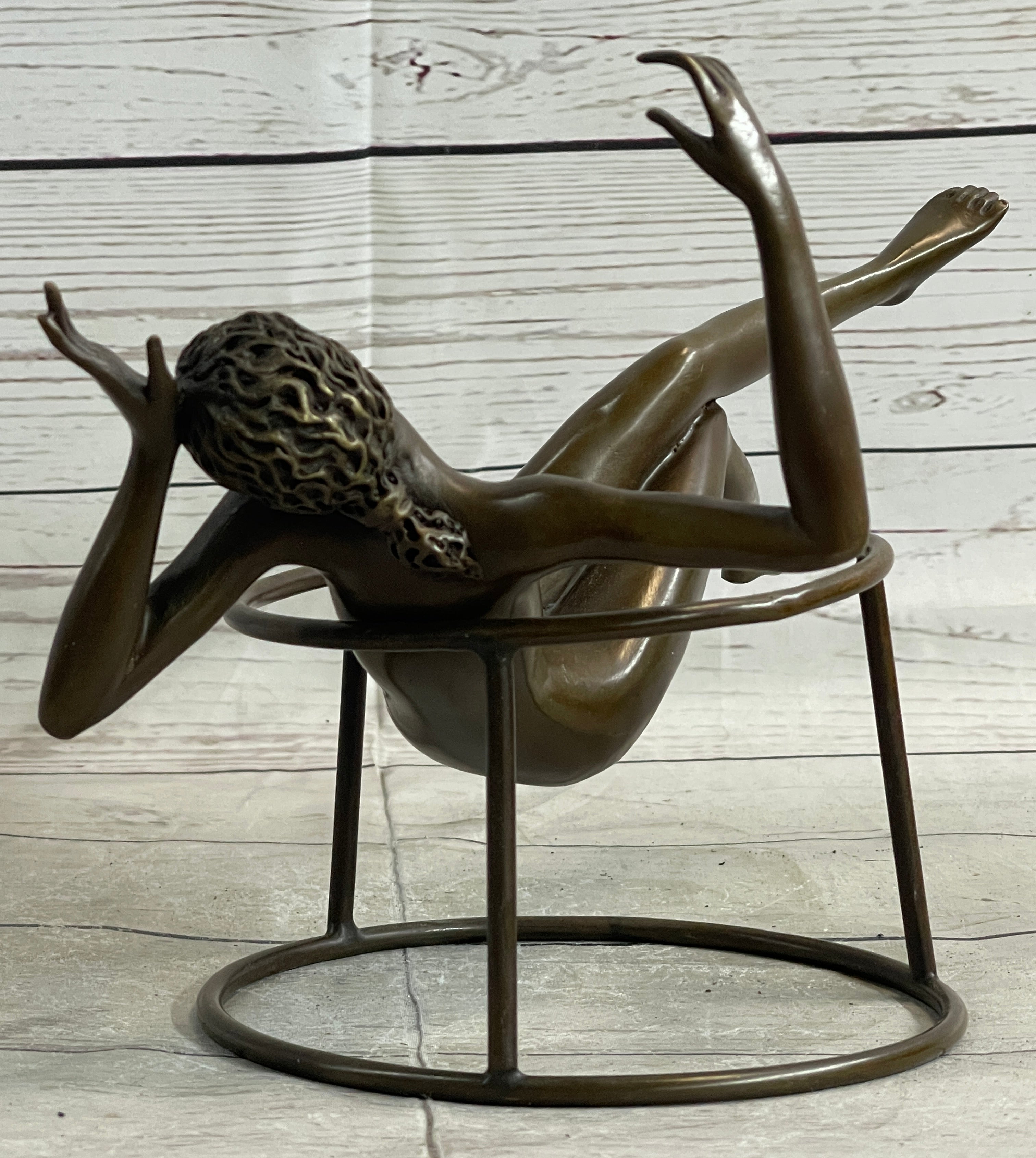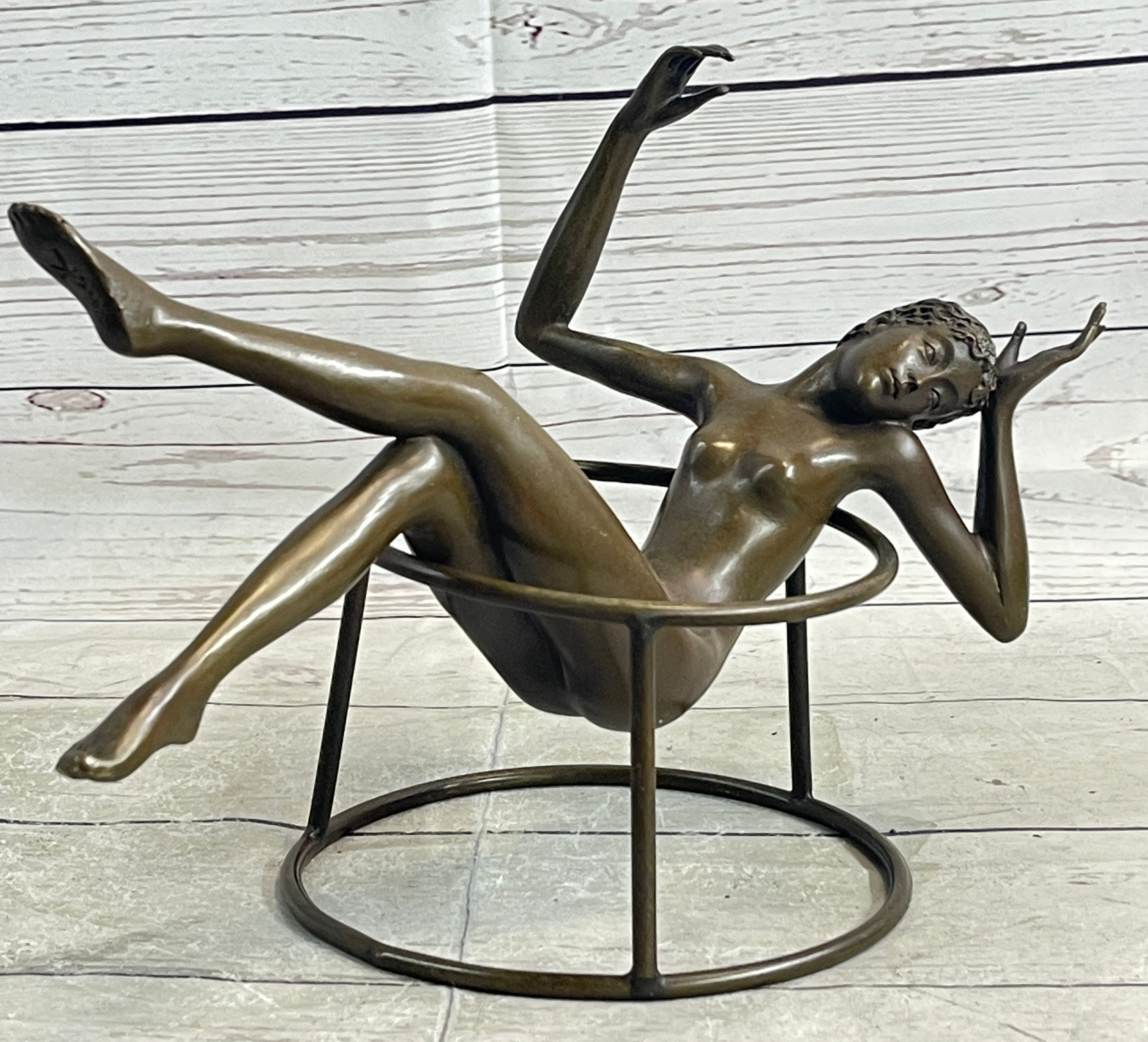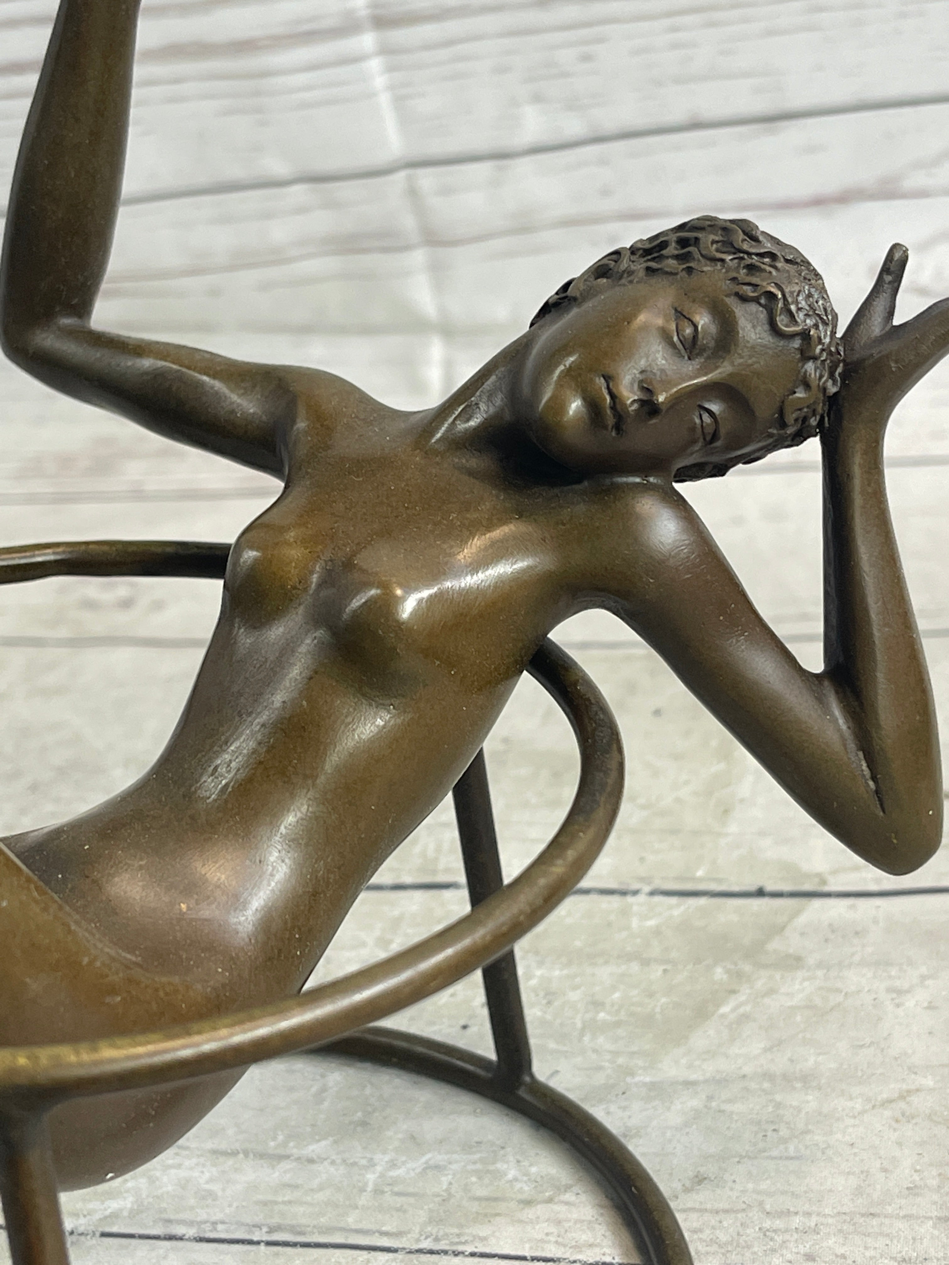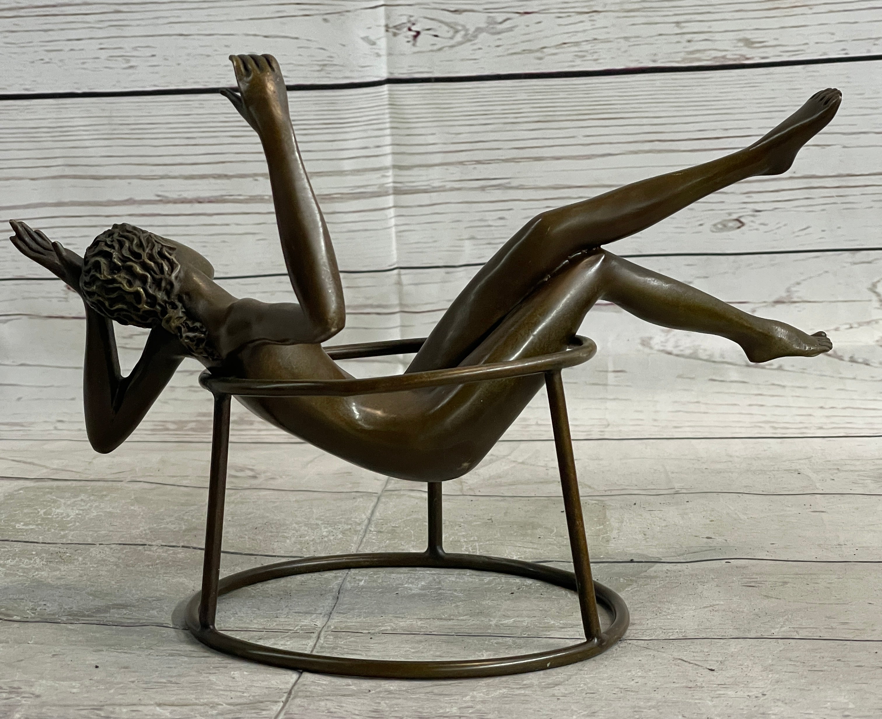 This exquisite bronze sculpture portrays a serene moment as a woman lays down for a deep sleep, basking in the warm sunlight on a comfortable beach chair. Her nude form radiates a gentle glow, accentuated by the skillful craftsmanship of the sculpture. With a calm expression and hair delicately framing her face, she removes her bowed top, revealing her breasts, as if embracing her vulnerability and self-reflection.