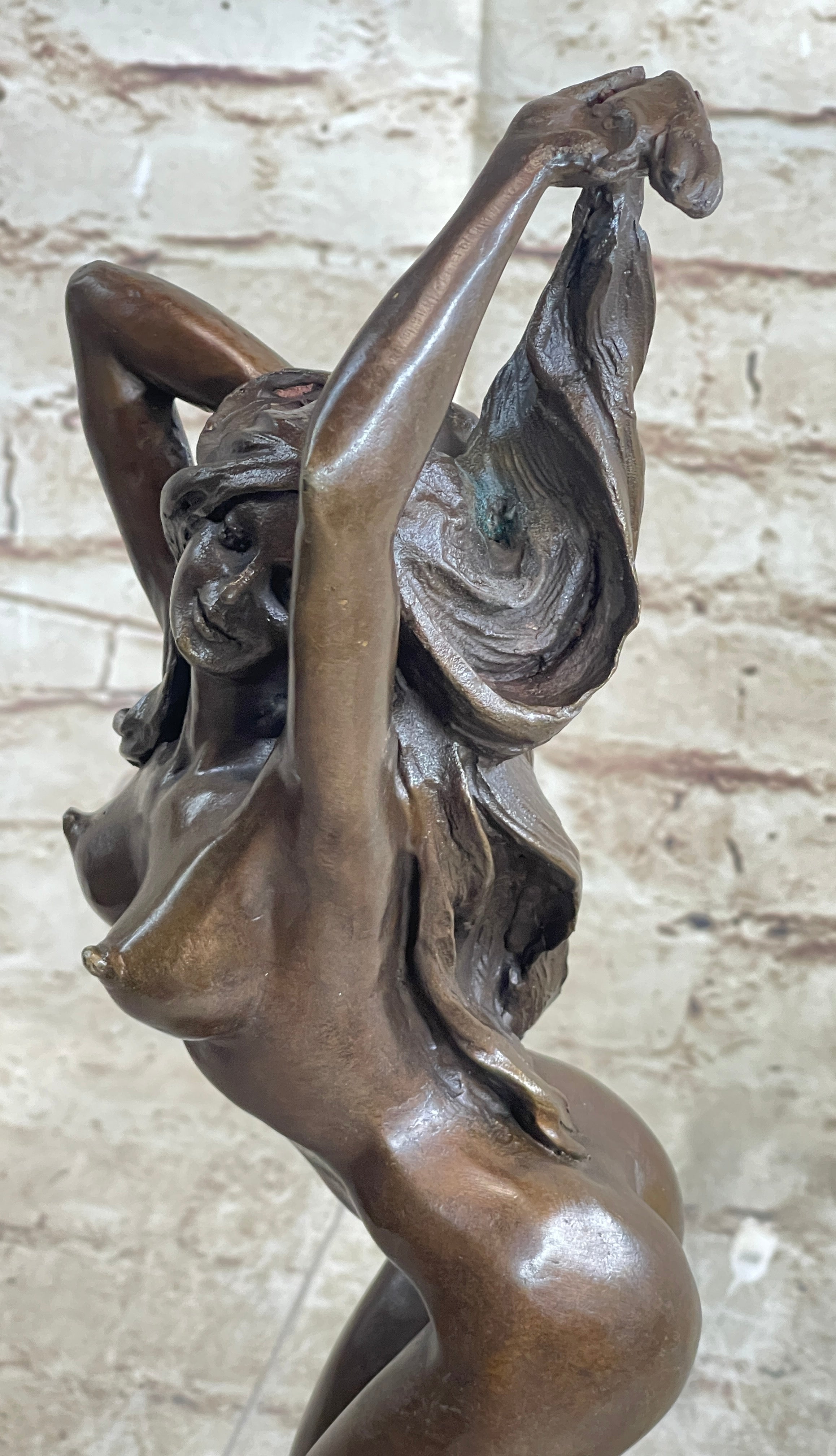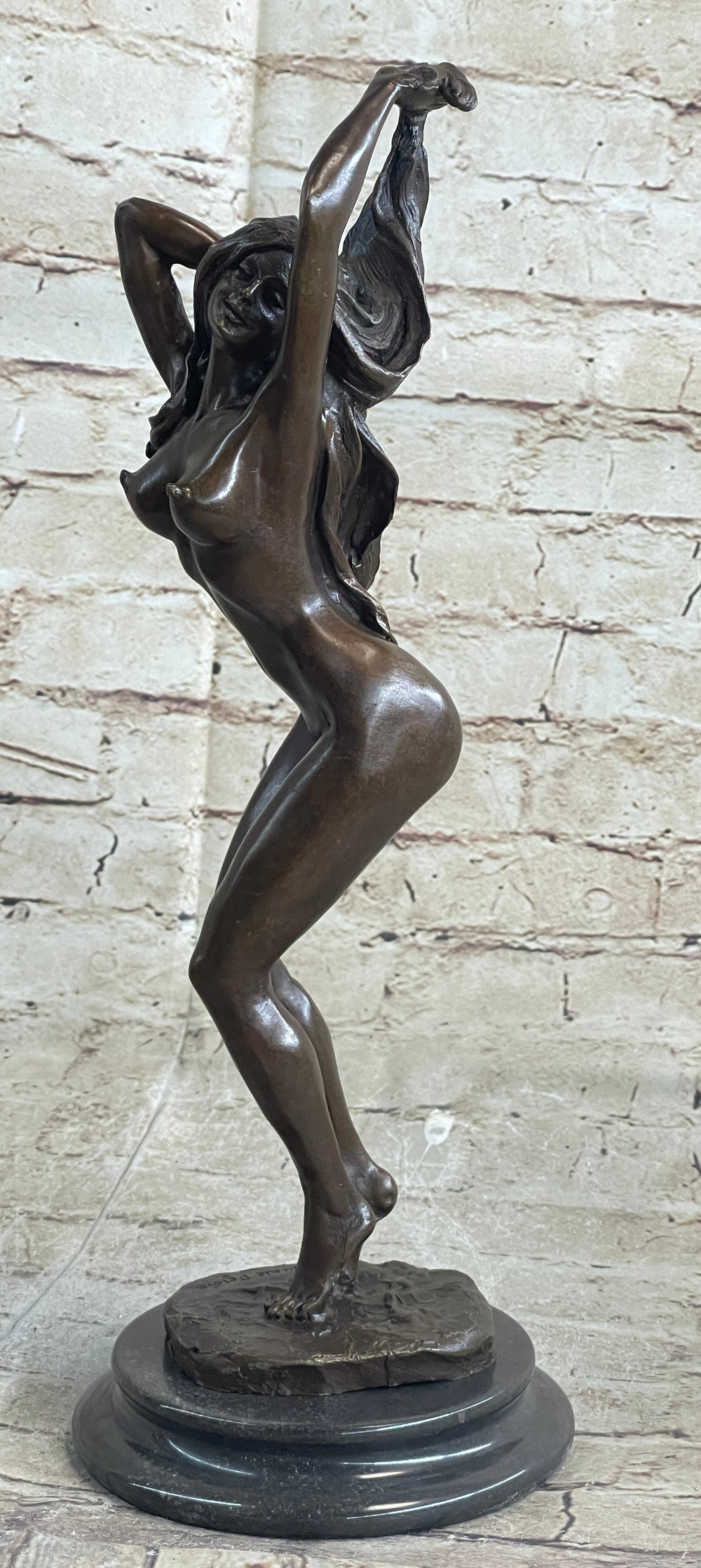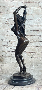 This bronze sculpture captures the essence of provocative sensuality in a mesmerizing dance. The slender, alluring woman is depicted in a passionate, uninhibited performance. She sways and twists her body with grace, shedding each article of clothing until only her undergarment and high heels remain. Every curve of her figure exudes confidence and desire as she moves with a profound sense of sensuality.
