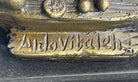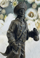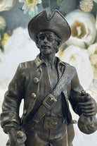 Crafted through the meticulous lost wax method, this sculpture boasts exquisite details and a mesmerizing two-toned brown patina finish, adding depth and dimension to the artwork. Mounted on a sleek black marble base, the sculpture stands as a testament to the skill and artistry of the renowned artist Aldo Vitaleh, whose signature adorns the masterpiece. The juxtaposition of the pirate's bold stance against the backdrop of the marble base enhances the overall aesthetic, making it a striking and visually impactful tribute to the legendary figures of pirate lore.Bronze Dimensions with Marble Base: Height 14" X Length 5"