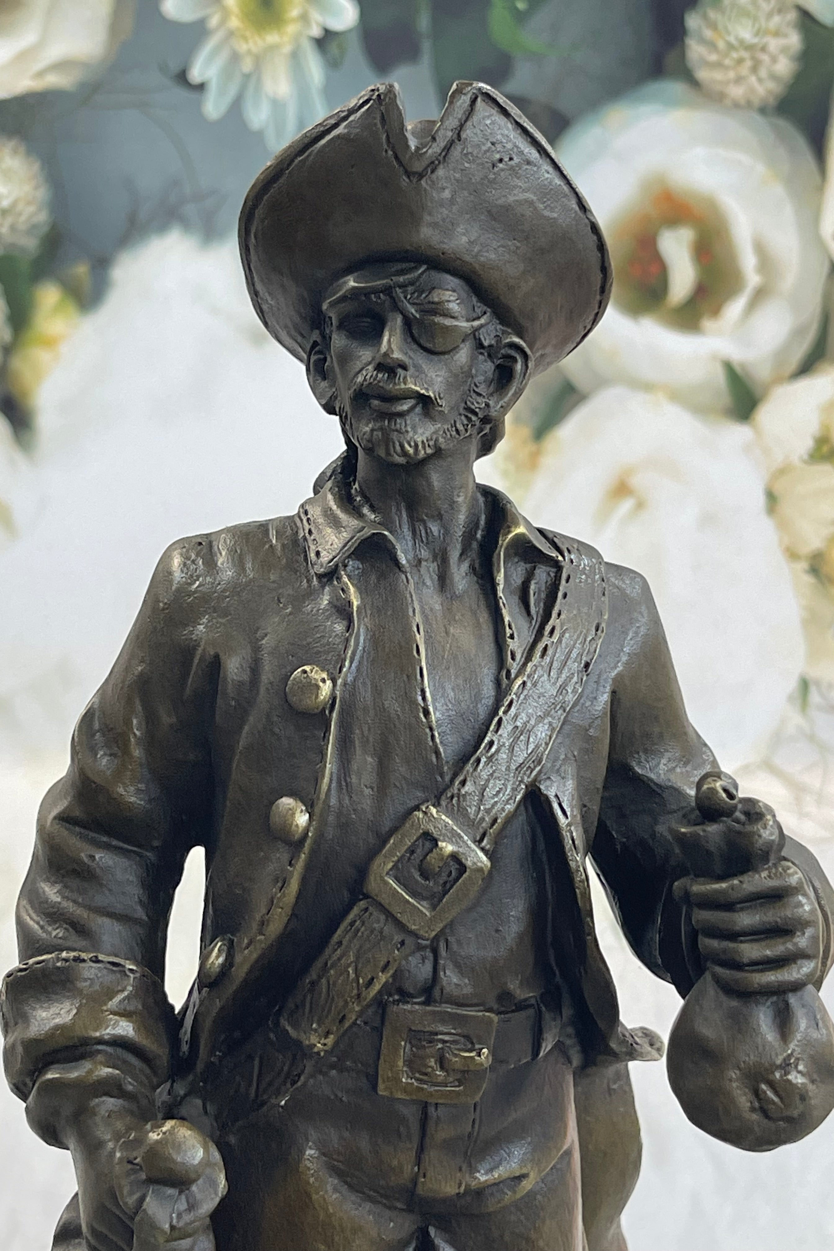 This captivating bronze sculpture vividly captures the audacious essence of a pirate, presenting an imposing figure adorned with a drawn sword, exuding confidence and readiness for imminent action. The intricate craftsmanship is evident in the sculpted details, with one hand firmly grasping the hilt of the sword, while the other confidently clutches a bag brimming with gold coins. Positioned beside him is a box showcasing precious jewels, hinting at the pirate's triumphant exploits in amassing wealth through plunder. The dynamic pose, with one foot casually resting on a coil of rope, enhances the swaggering demeanor of the pirate, creating a compelling visual narrative.