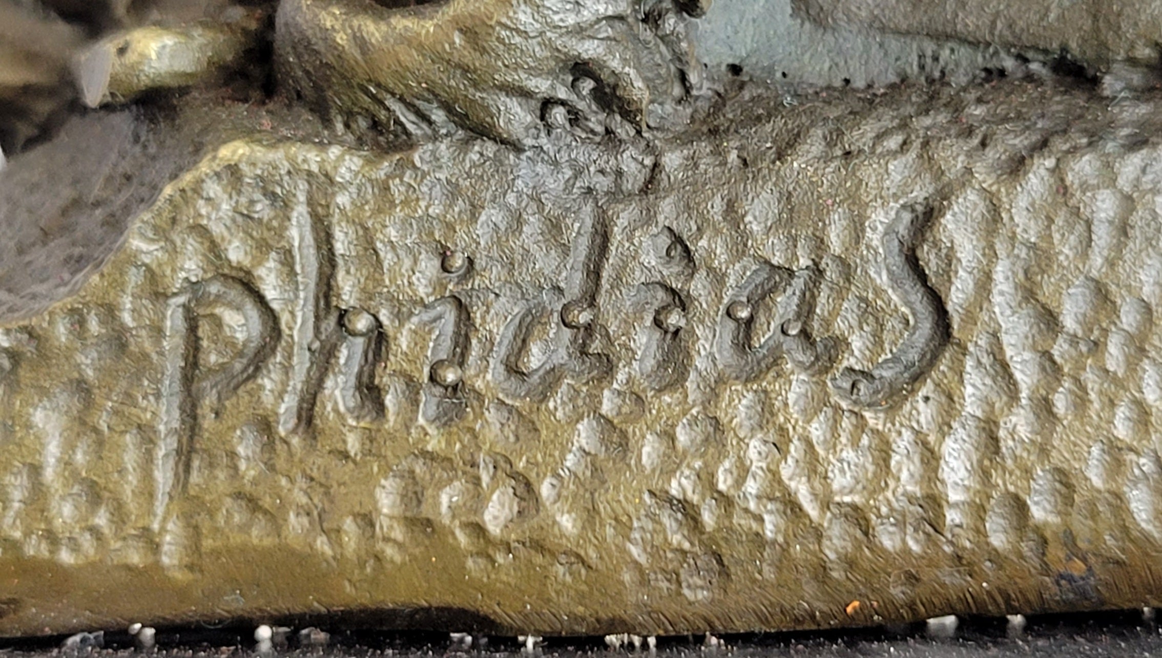 Crafted with meticulous care and precision, this sculpture was painstakingly created using the esteemed lost wax method, ensuring the faithful reproduction of intricate details and the artist's vision. It stands securely on a square black marble base, adding to its visual impact and stability. The sculpture bears the signature of Phidias, signifying its quality and artistic value.