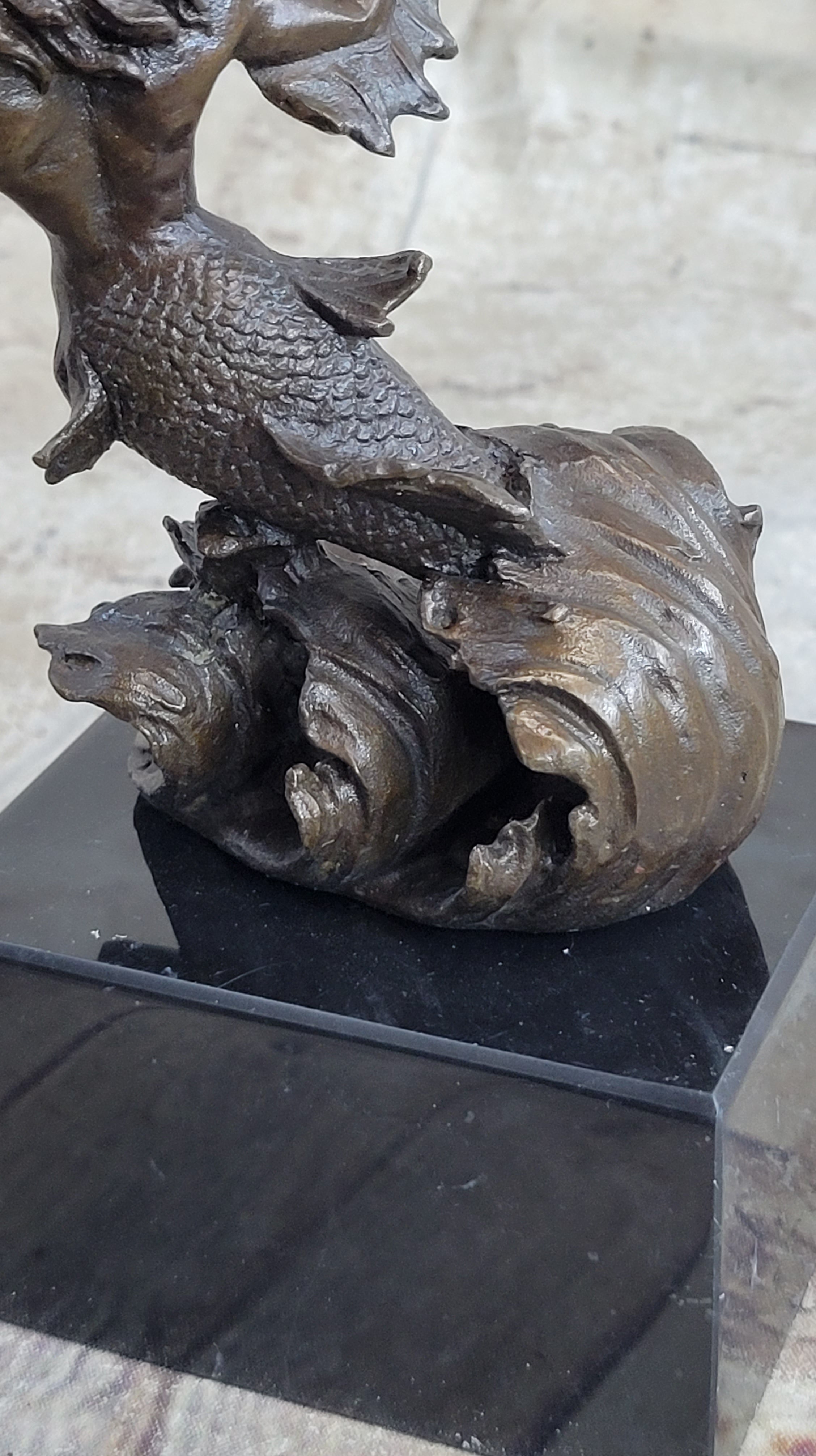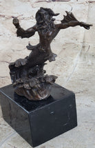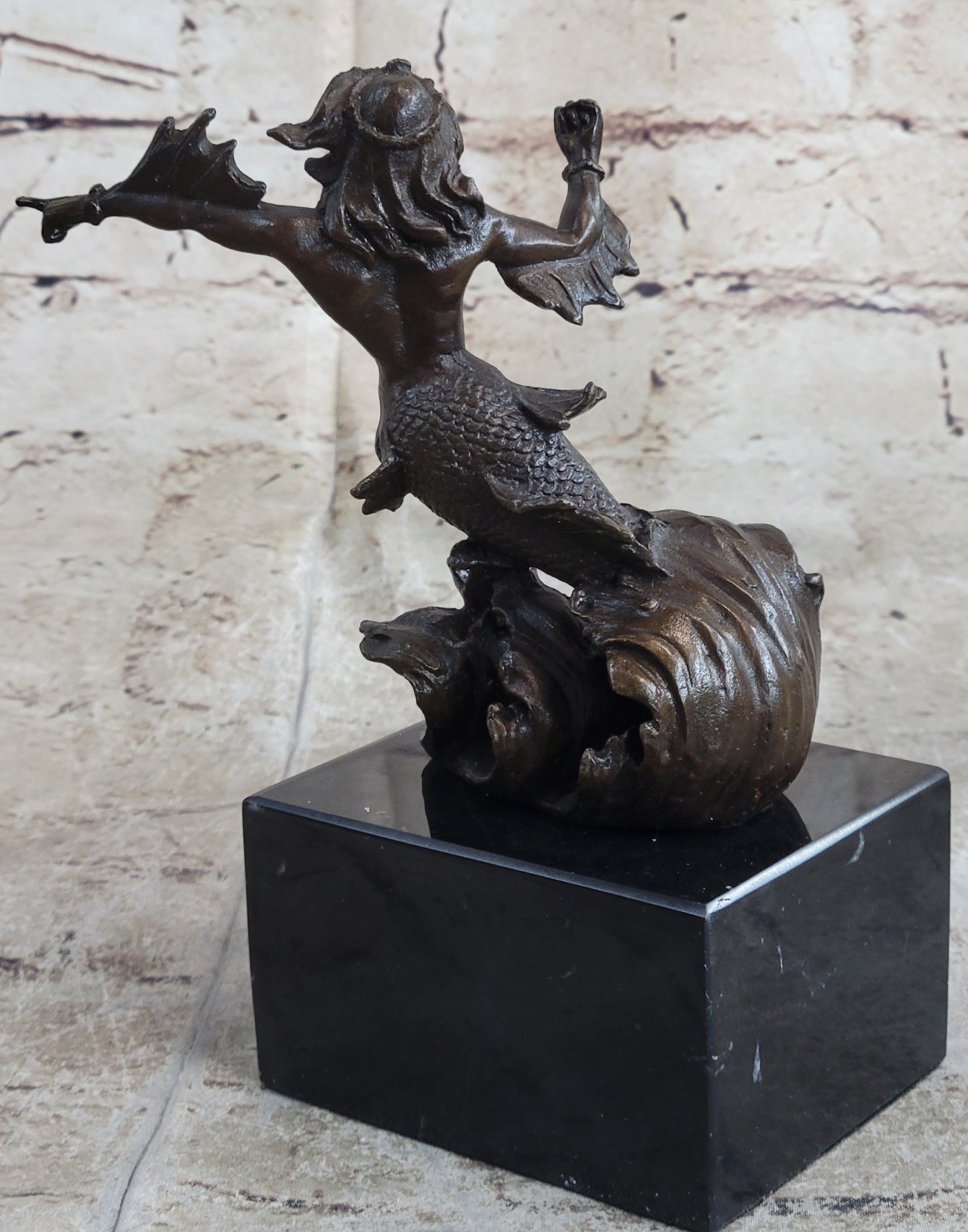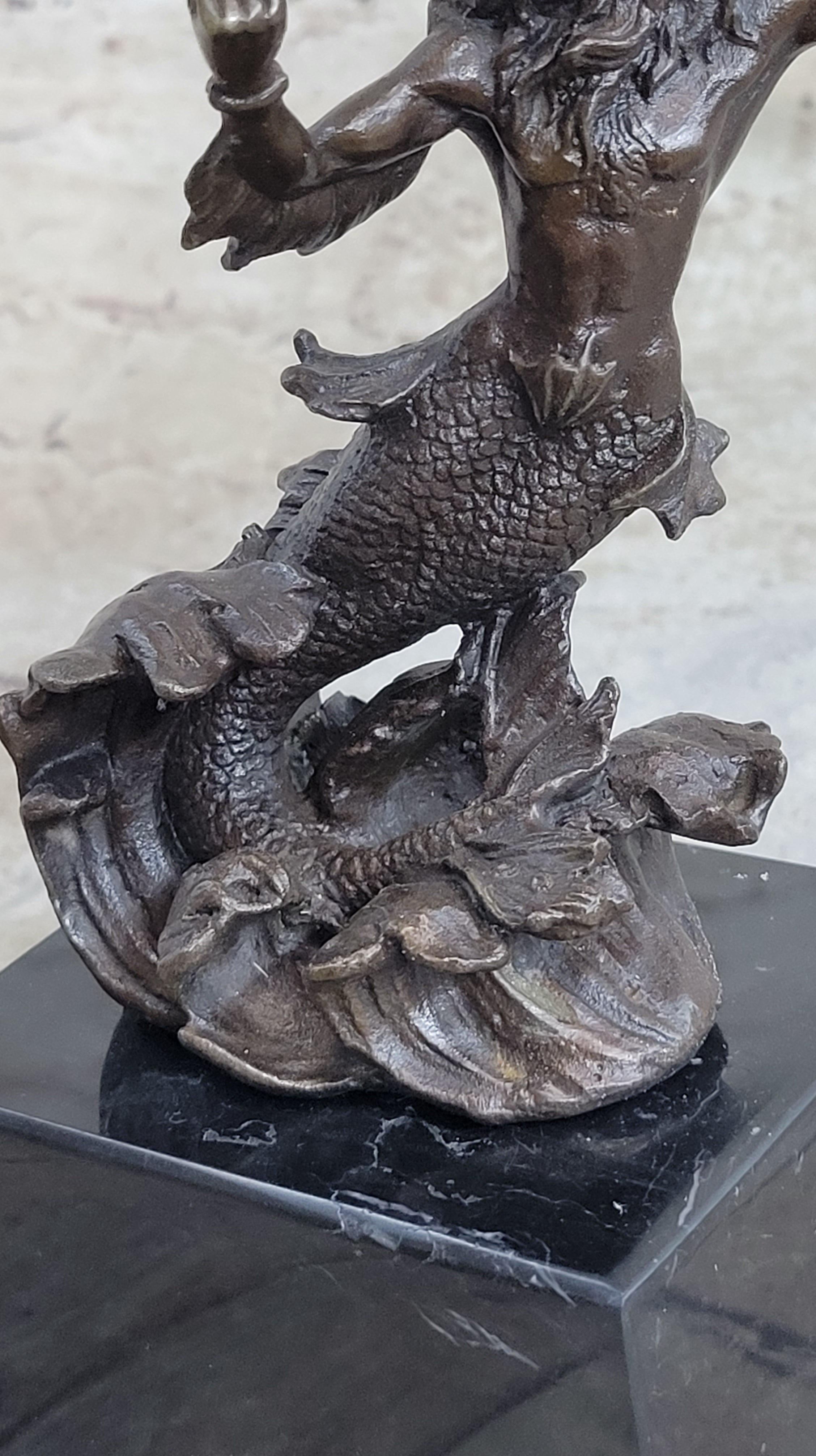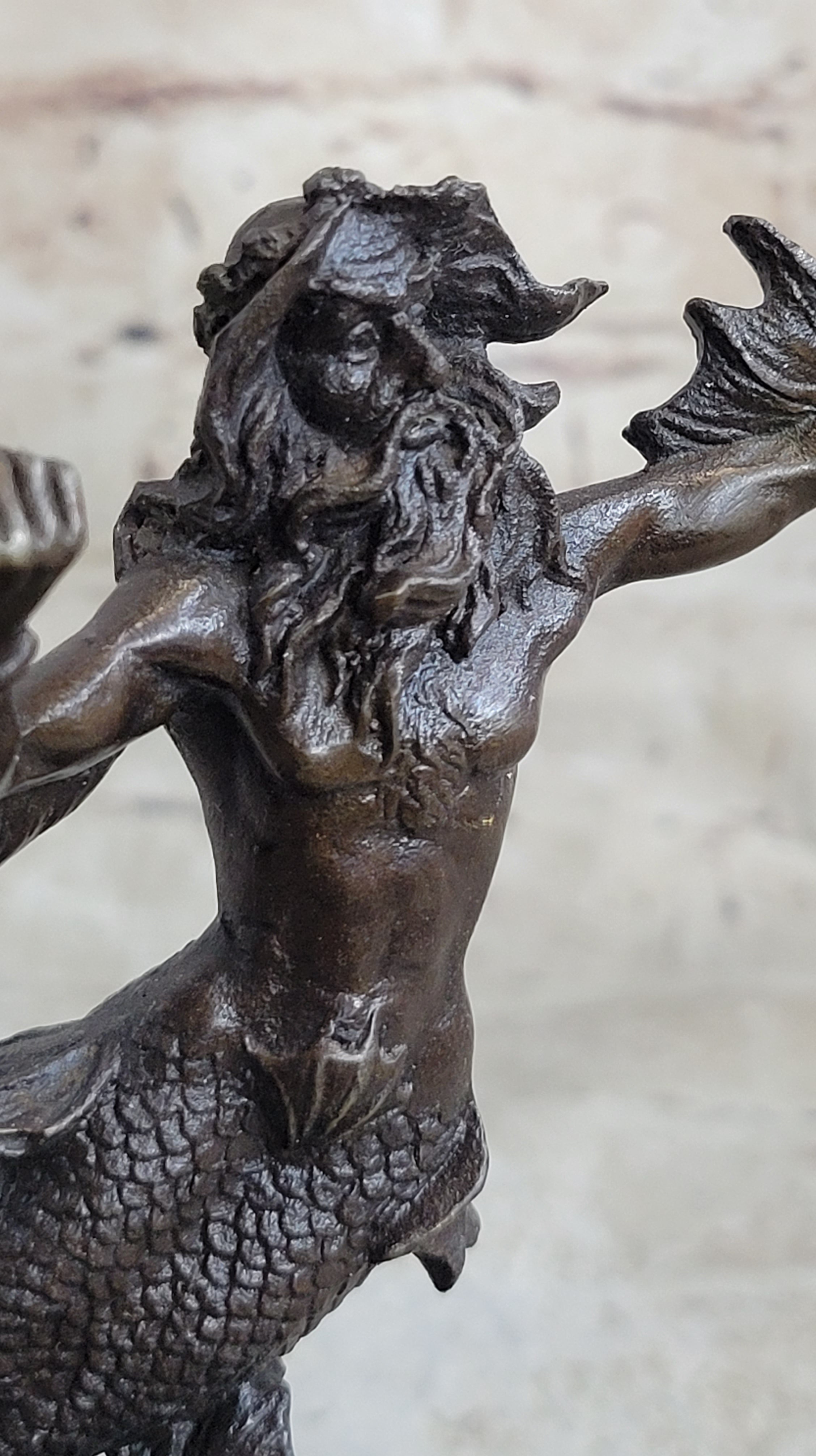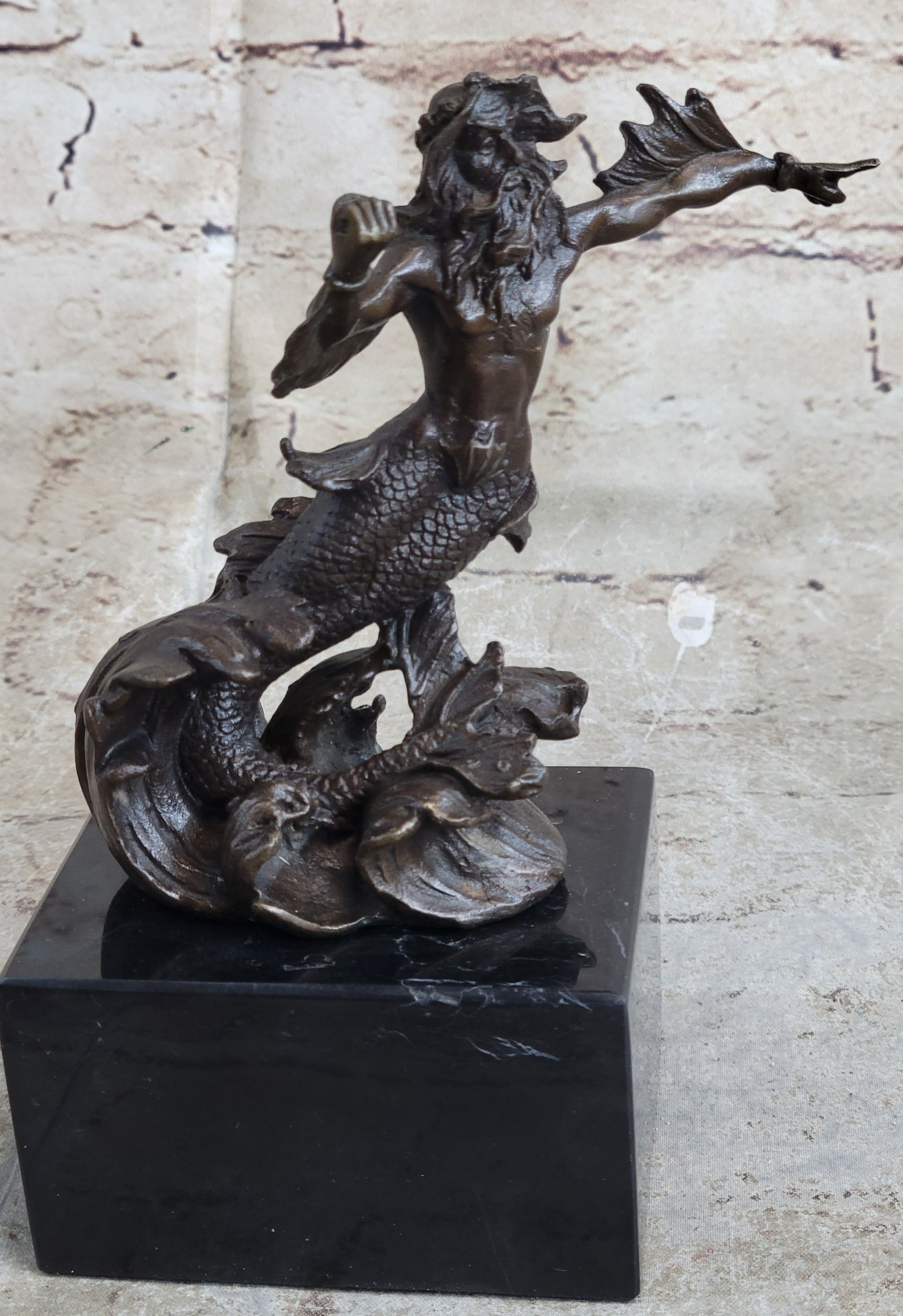 With its portrayal of Poseidon as a merman, this sculpture offers a unique interpretation of the deity, blending elements of human and sea creature to convey his divine power and authority over the maritime realm. Whether displayed as a centerpiece in a collection or as a standalone piece of art, it serves as a reminder of the awe-inspiring forces of nature and the enduring mythological narratives that continue to captivate our imagination.Bronze Dimensions with Marble Base: Height 7" X Width 4"
