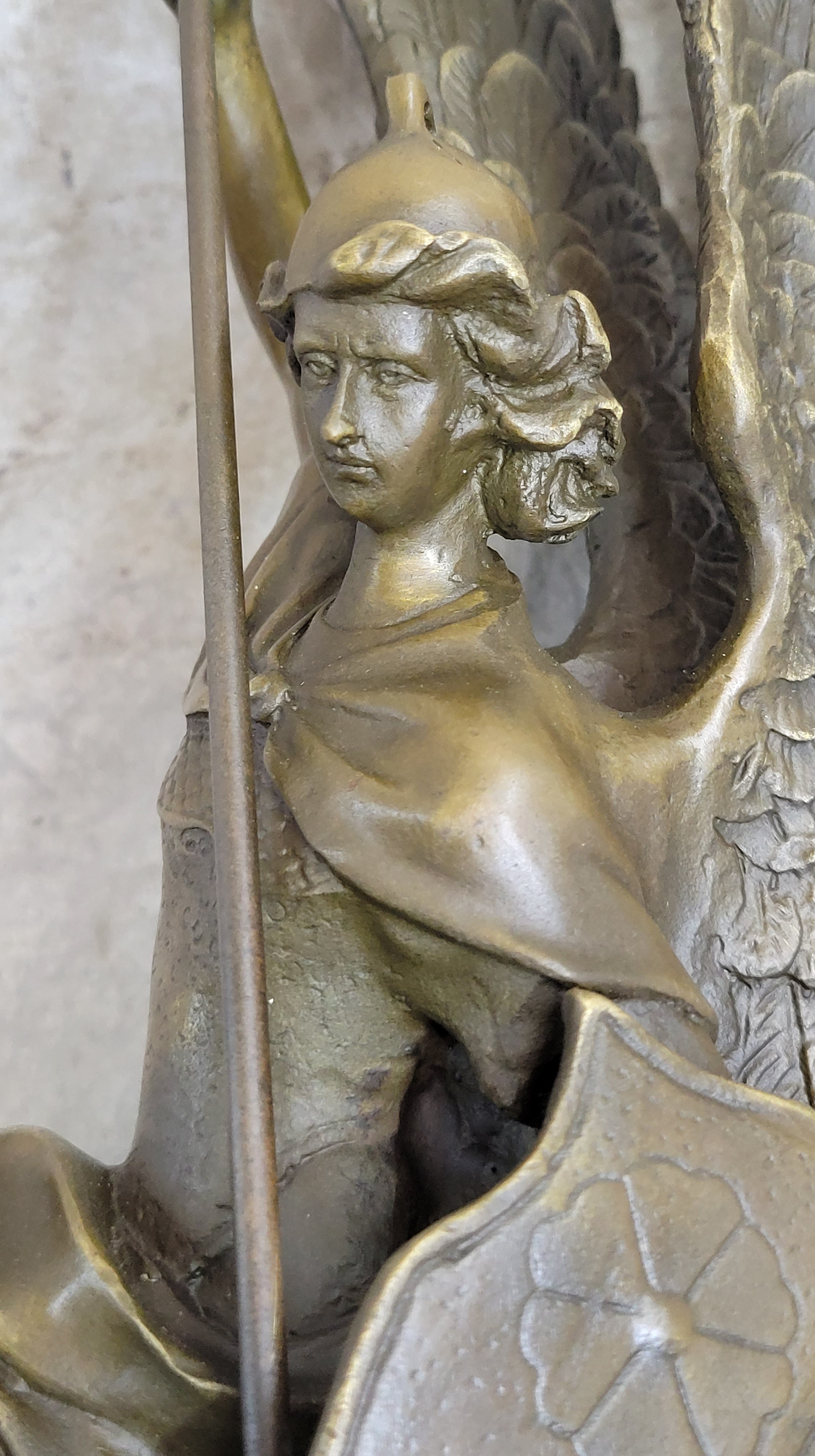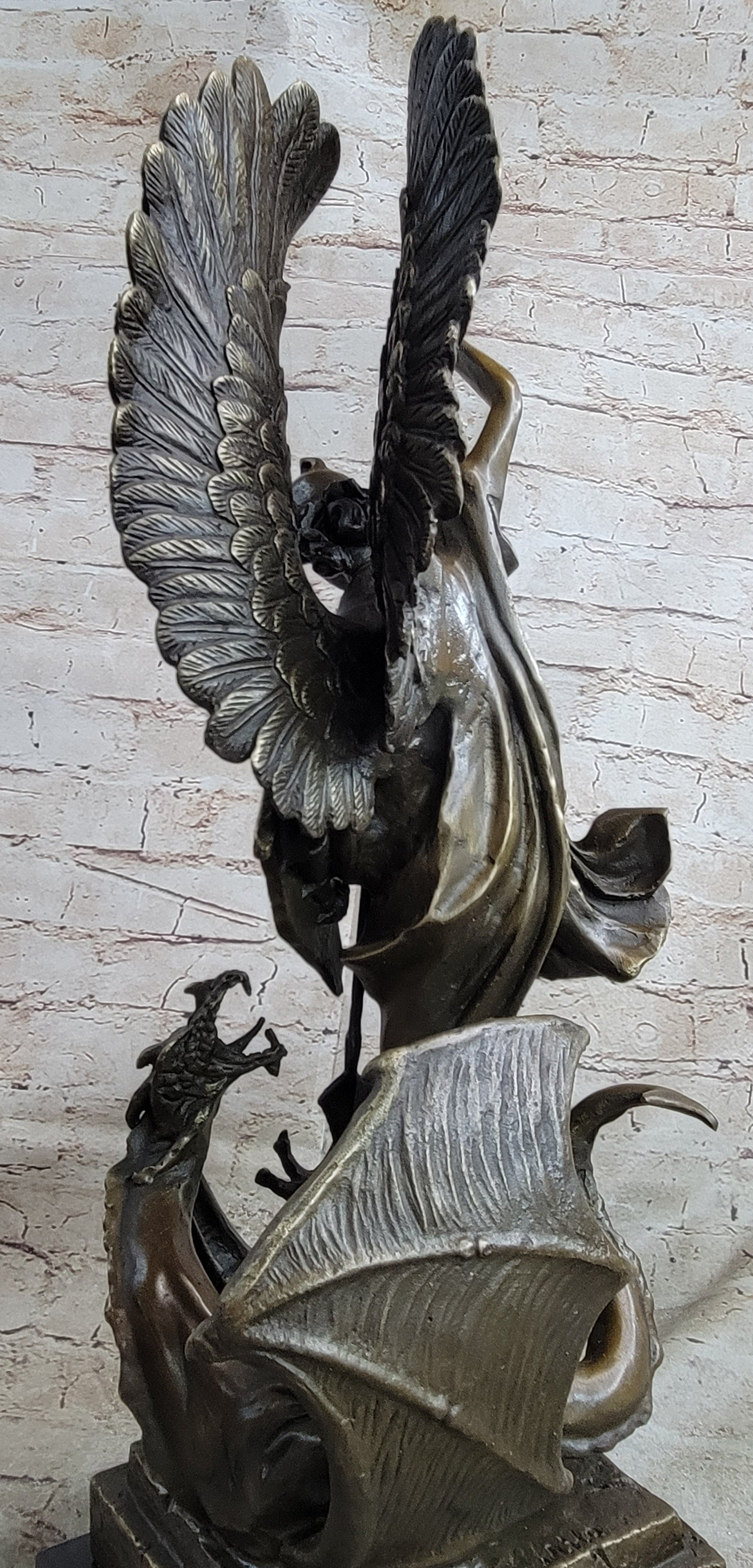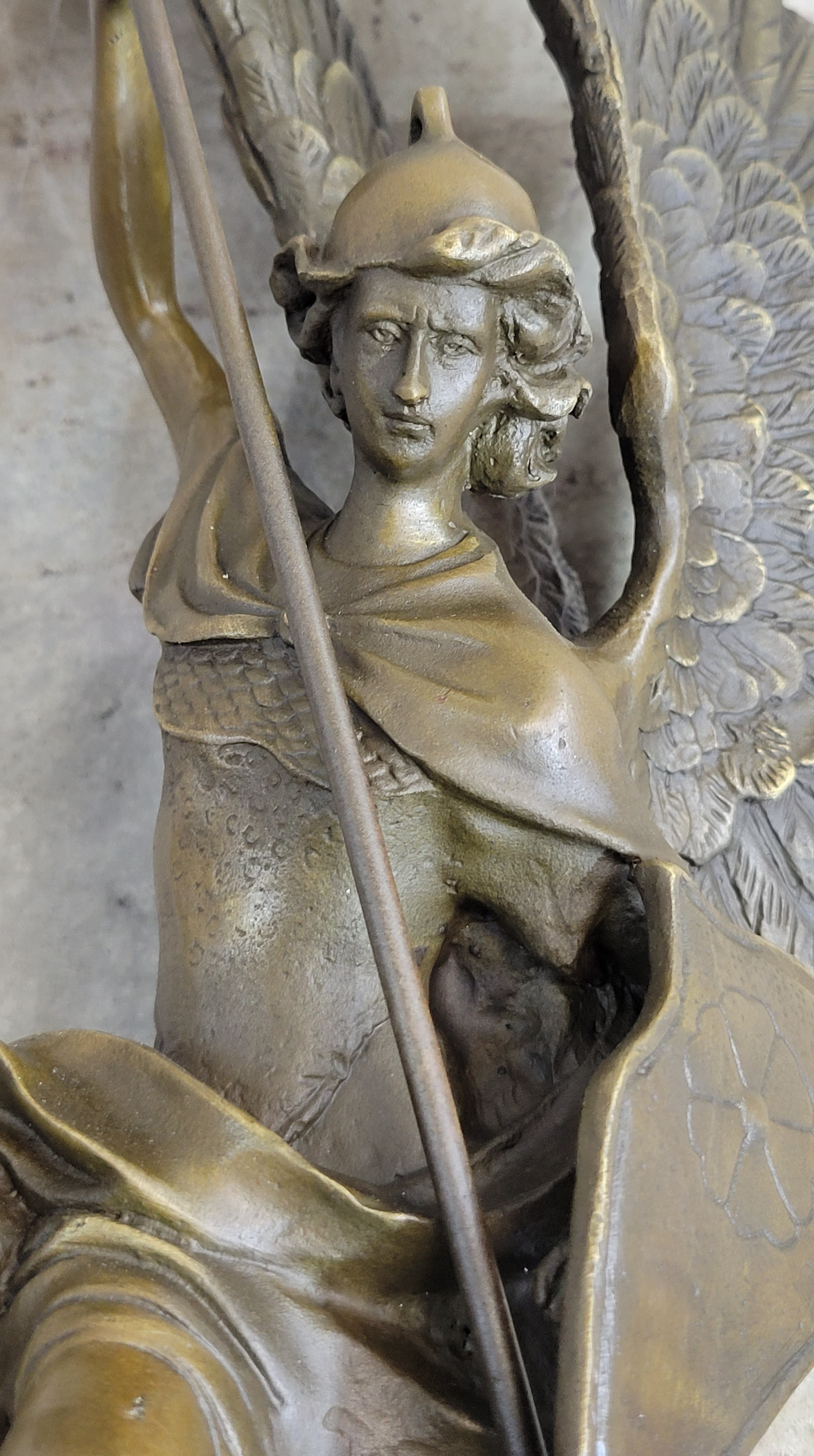 This monumental bronze sculpture of Saint Michael depicts the revered archangel in his iconic role as the dragon slayer, capturing a powerful moment of divine triumph. Saint Michael is shown with a dynamic stance, wings spread wide, and sword raised, as he subdues the menacing dragon beneath him. His expression radiates strength and determination, embodying the essence of protection and victory over darkness.
