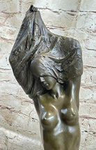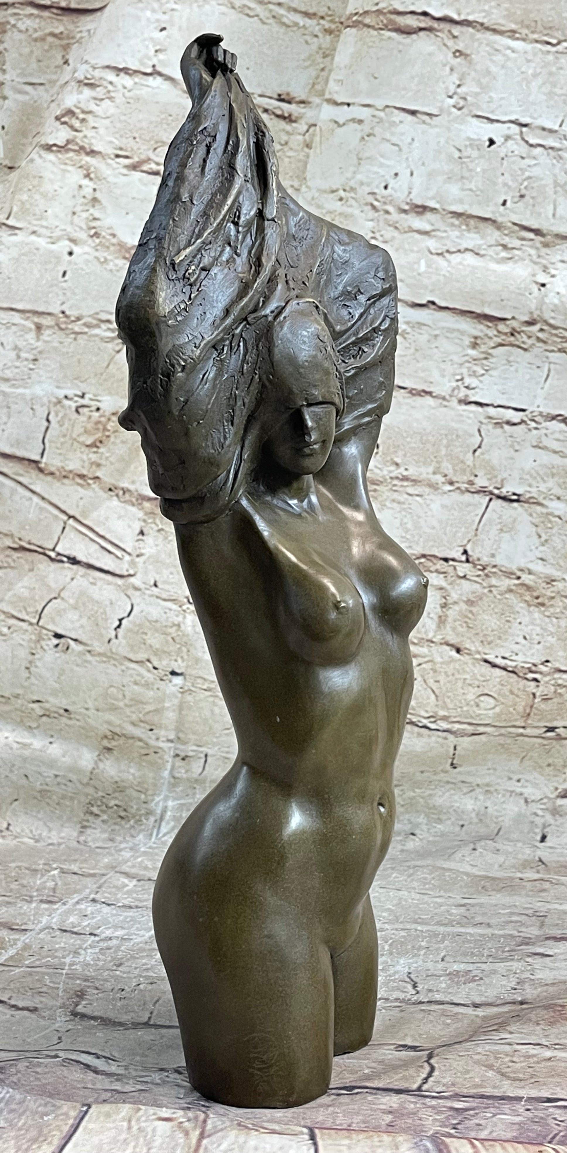 Her slender physique, from her humble curves to her sculpted stomach, is meticulously crafted, highlighting the beauty of modern form and expression. The two-toned brown patina in her hair enhances the depth and layers, adding a sense of movement and energy to the piece. Every detail is brought to life through the ancient lost wax casting method, ensuring a 100% handmade and authentic representation of artistic mastery.