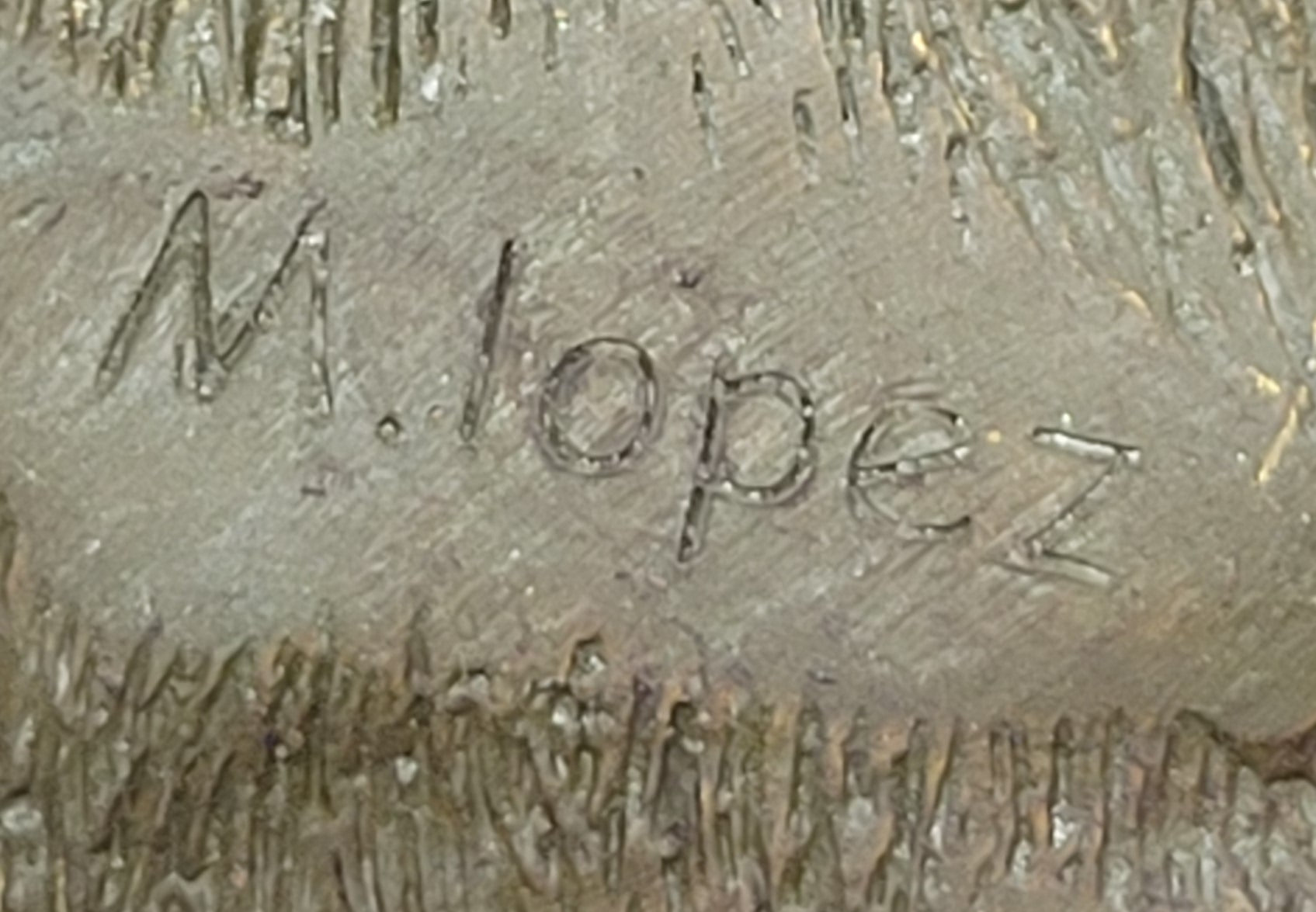 Signed by artist M. Lopez, also known as Milo, the statue is mounted on a sleek black marble base, providing a refined contrast to the warm bronze tones. This elegant and timeless sculpture is a perfect tribute to the loyal and courageous spirit of the English Bulldog.Bronze Dimensions with Marble Base: Height 8" x Length 8"