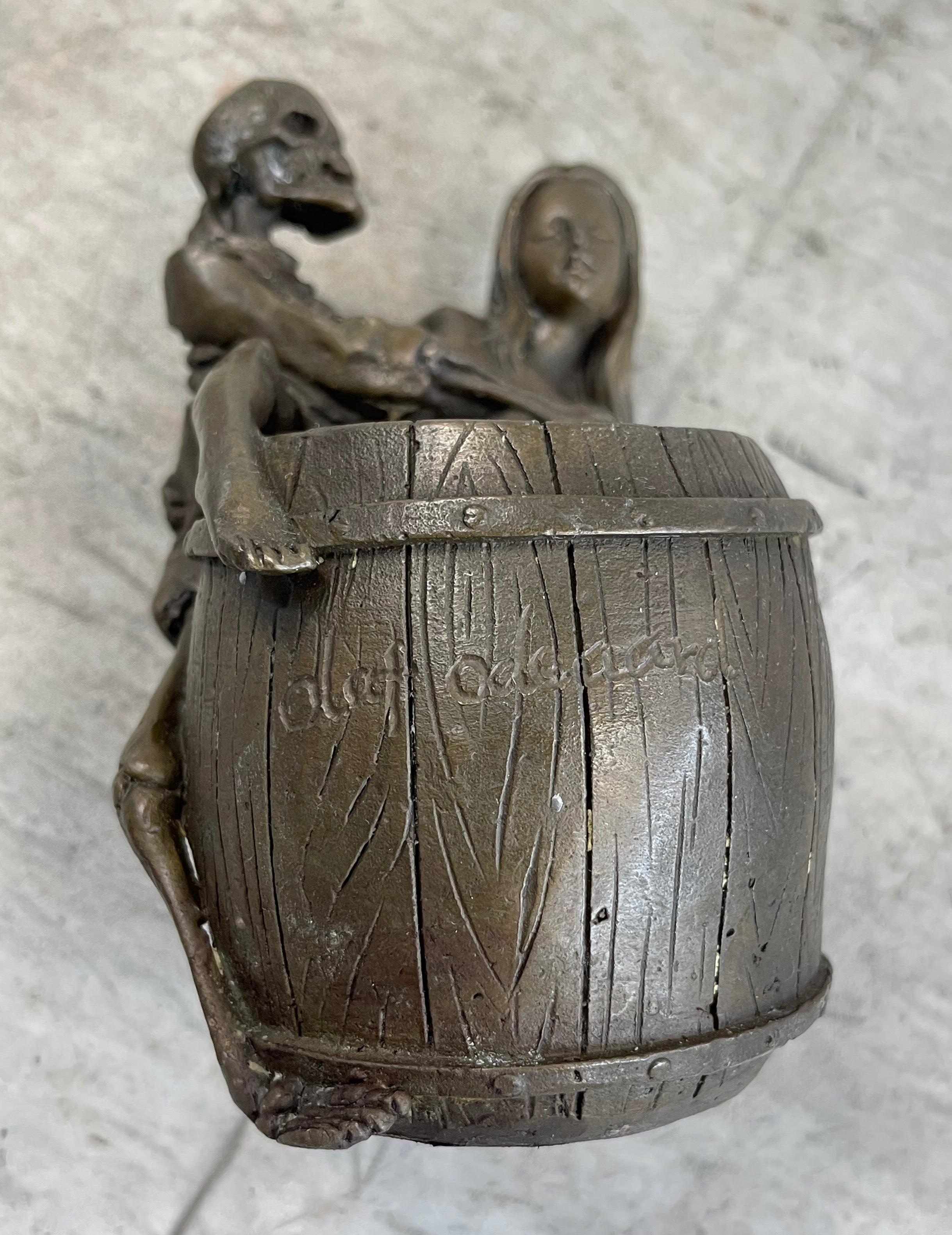 Skeleton holding a nude nymph pen Holder, Cool, Unusual and Creepy item for the morbid of taste. Made to last with pure bronze, bottom covered with felt. In excellent condition. This Bronze Sculpture was casted using the “Lost Wax Method” and has a two tone brown patina. This sculpture is 100% bronze and is handmade. This sculpture is signed By artist Olaf OdegardBronze Dimensions :Height 5" x Width 4"
