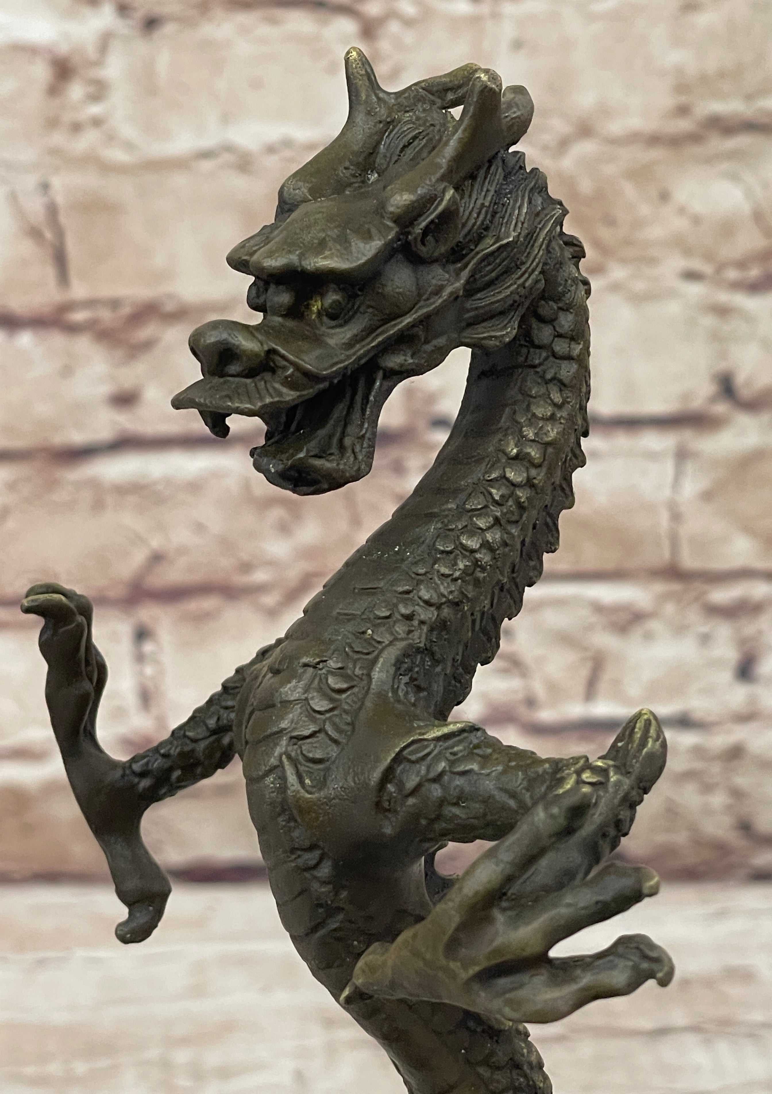 Bring a touch of cultural significance and mythical wonder to your home or office with this signed Chinese Dragon Bronze Sculpture. As a symbol of auspicious energy and prosperity, it serves as both an exquisite work of art and a meaningful representation of ancient traditions. Let this piece become a source of inspiration and fascination, leaving a lasting impression on all who behold it.Bronze Dimensions with Marble Base: Height 10" X Width 7"