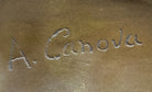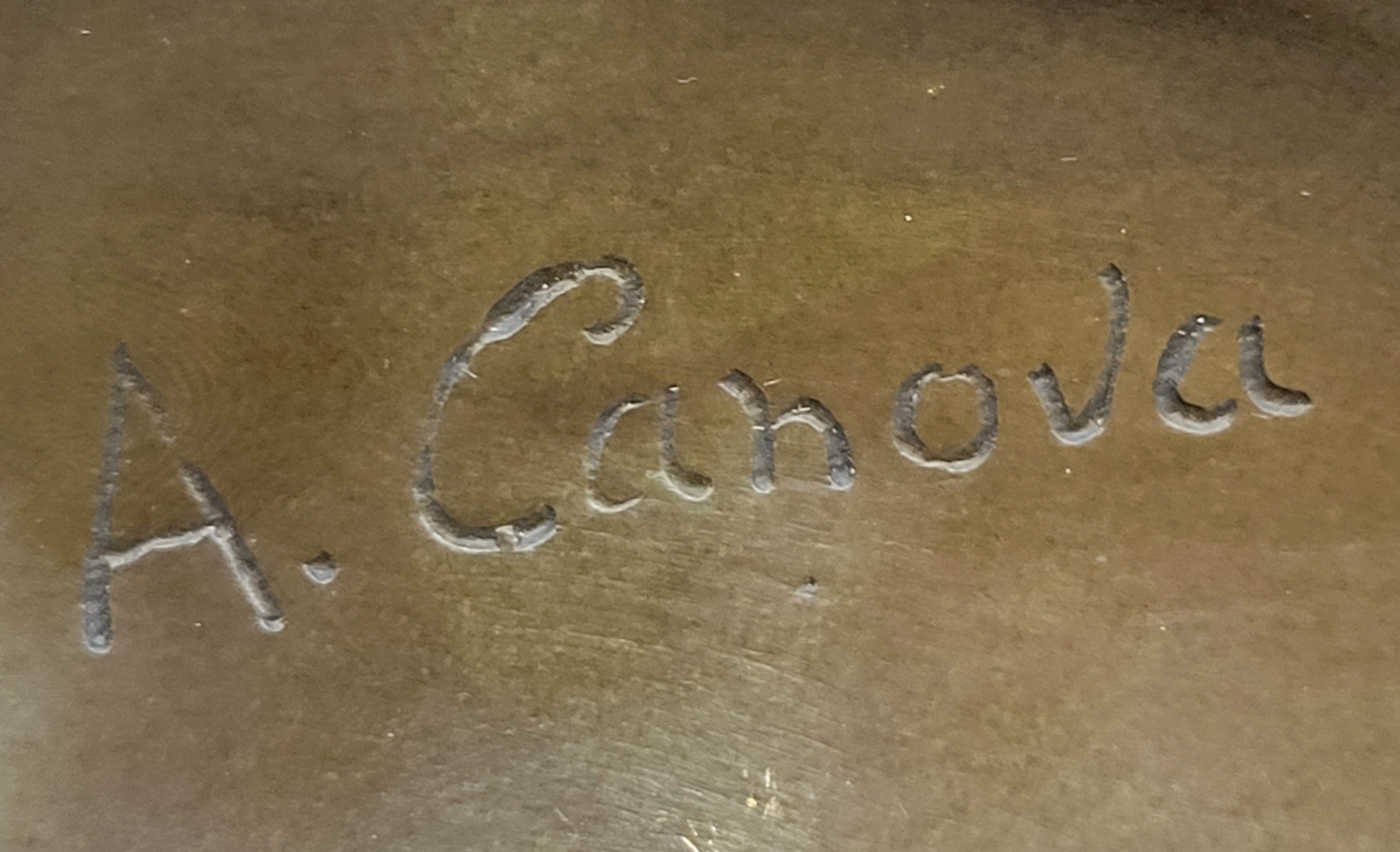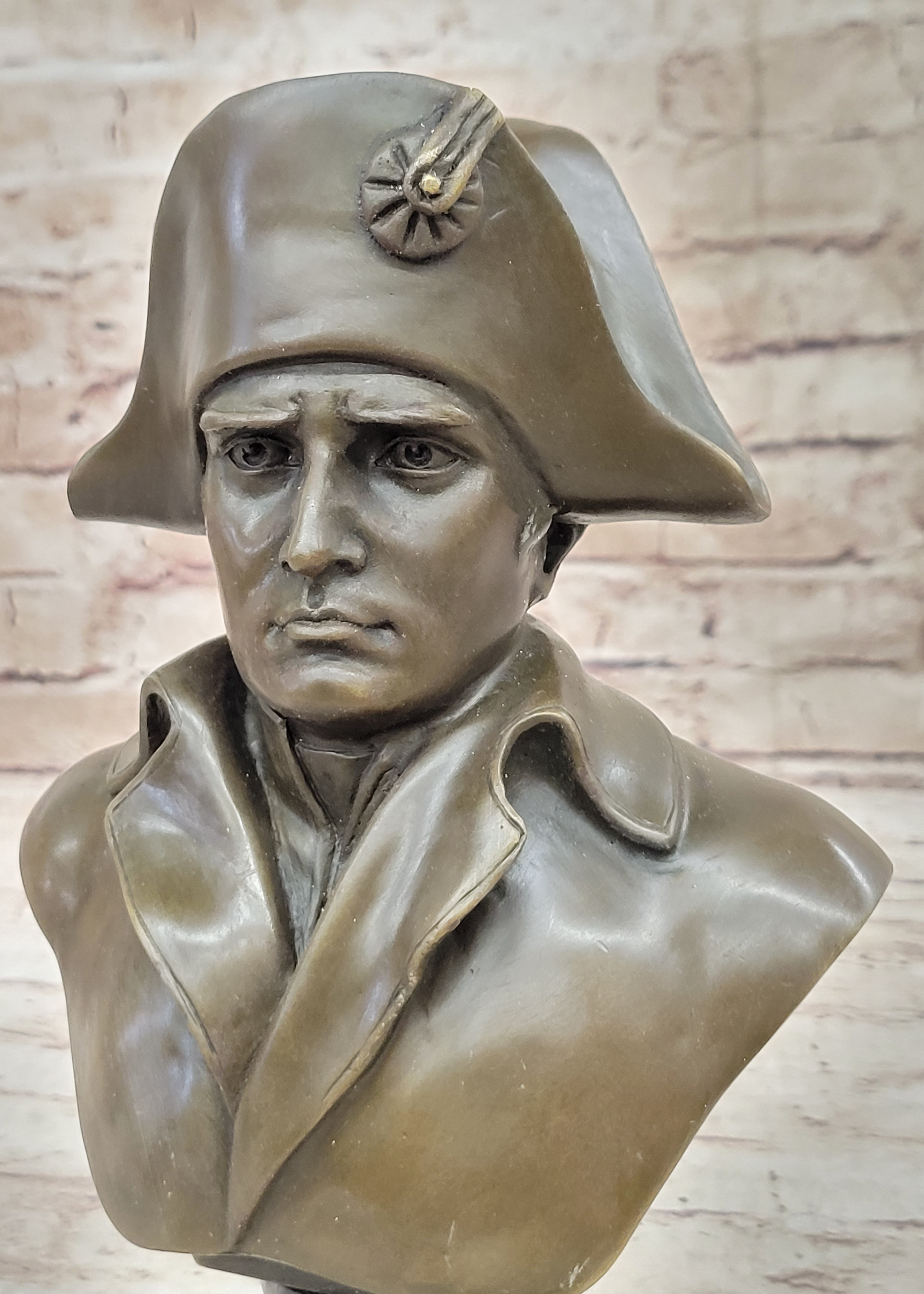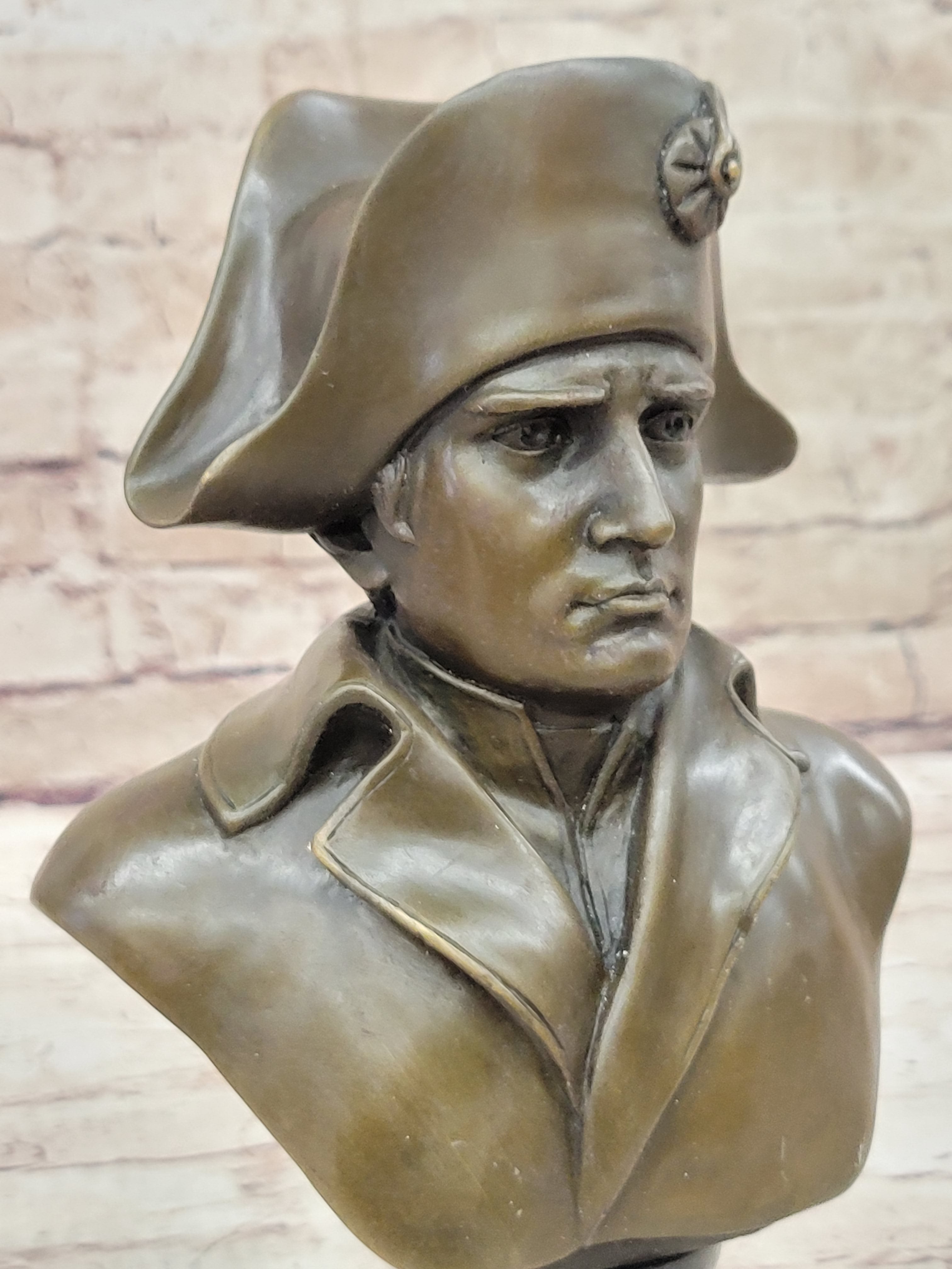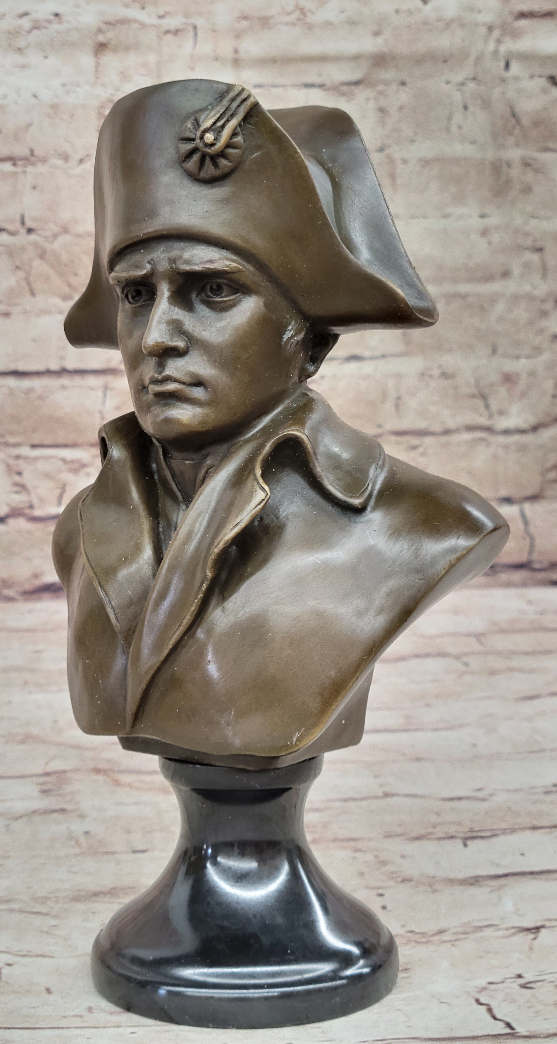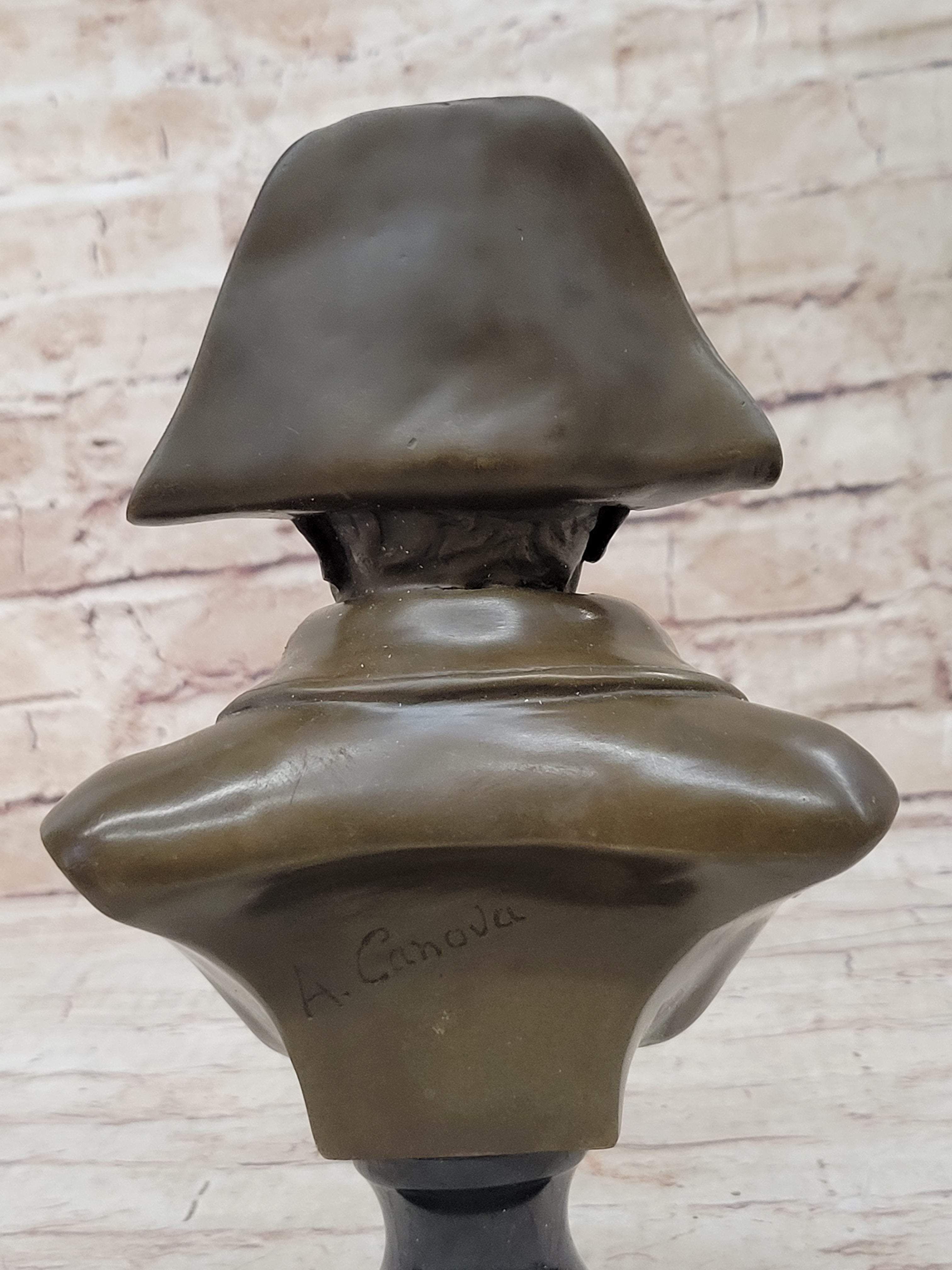 Cast using the revered lost-wax casting technique and adorned with a rich brown patina finish, this artwork not only captures intricate details faithfully but also ensures its lasting preservation. Signed by the esteemed artist Canova, this remarkable bronze bust is a timeless symbol of leadership, ambition, and the enduring impact of one man on the course of European history.Bronze Dimensions with Marble Base: Height 9.5" X Width 6"