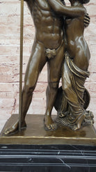 This exquisite bronze sculpture captures a tender moment between a Roman soldier and a woman, skillfully crafted by the renowned artist Ellis. The soldier stands tall, adorned with a decorative feathered helmet symbolizing his power and status. A single leaf delicately placed between his legs adds a subtle touch of realism. Beside him, a woman draped in a cloth that cascades to the base gazes lovingly up at him, her ponytail revealing her expressive face. She embraces him, while he reciprocates with one arm around her and the other holding a tall spear, both sharing a passionate gaze in this intimate scene.