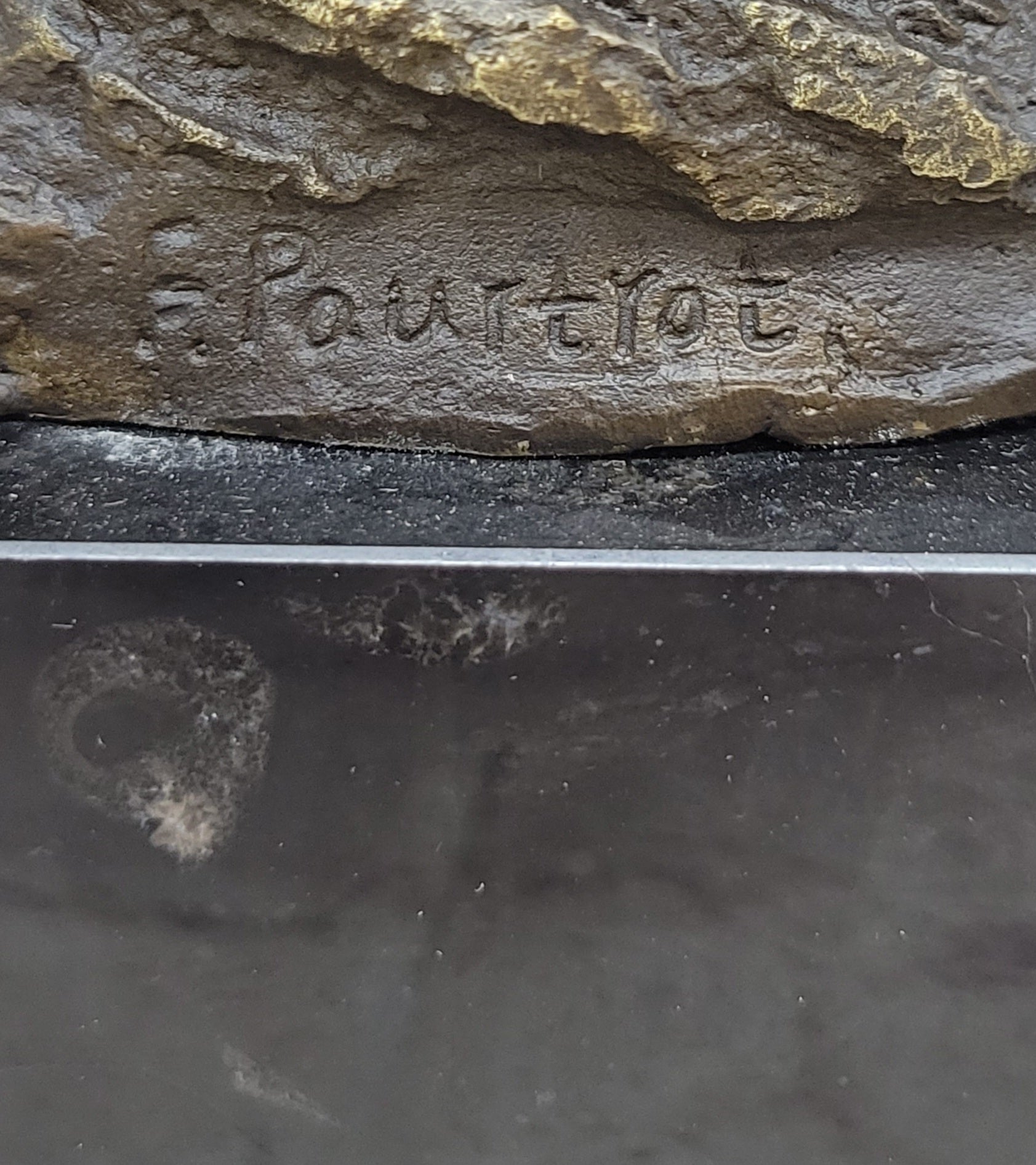 Resting on an elegant orange marble base adorned with subtle white accents, this sculpture is a harmonious blend of form and material. The inclusion of the artist F. Pautrot's signature further emphasizes the quality and value of this piece, making it a true collector's item that pays homage to the grace and allure of the deer family.Bronze Dimensions with Marble Base: 24.5" X 17"