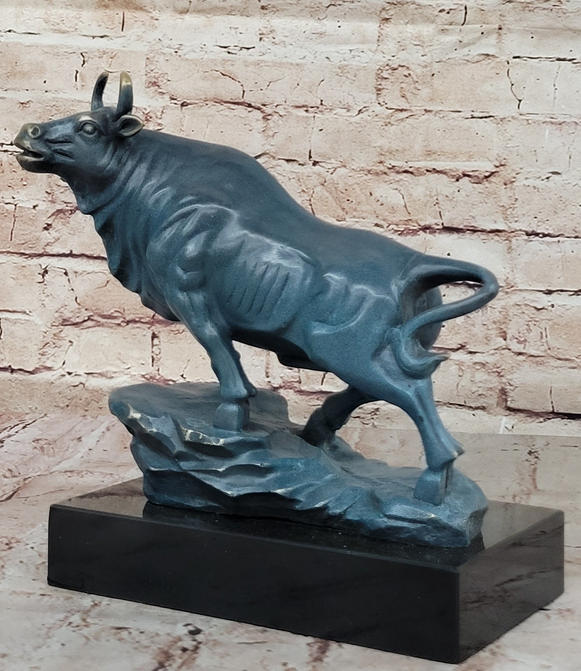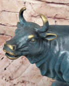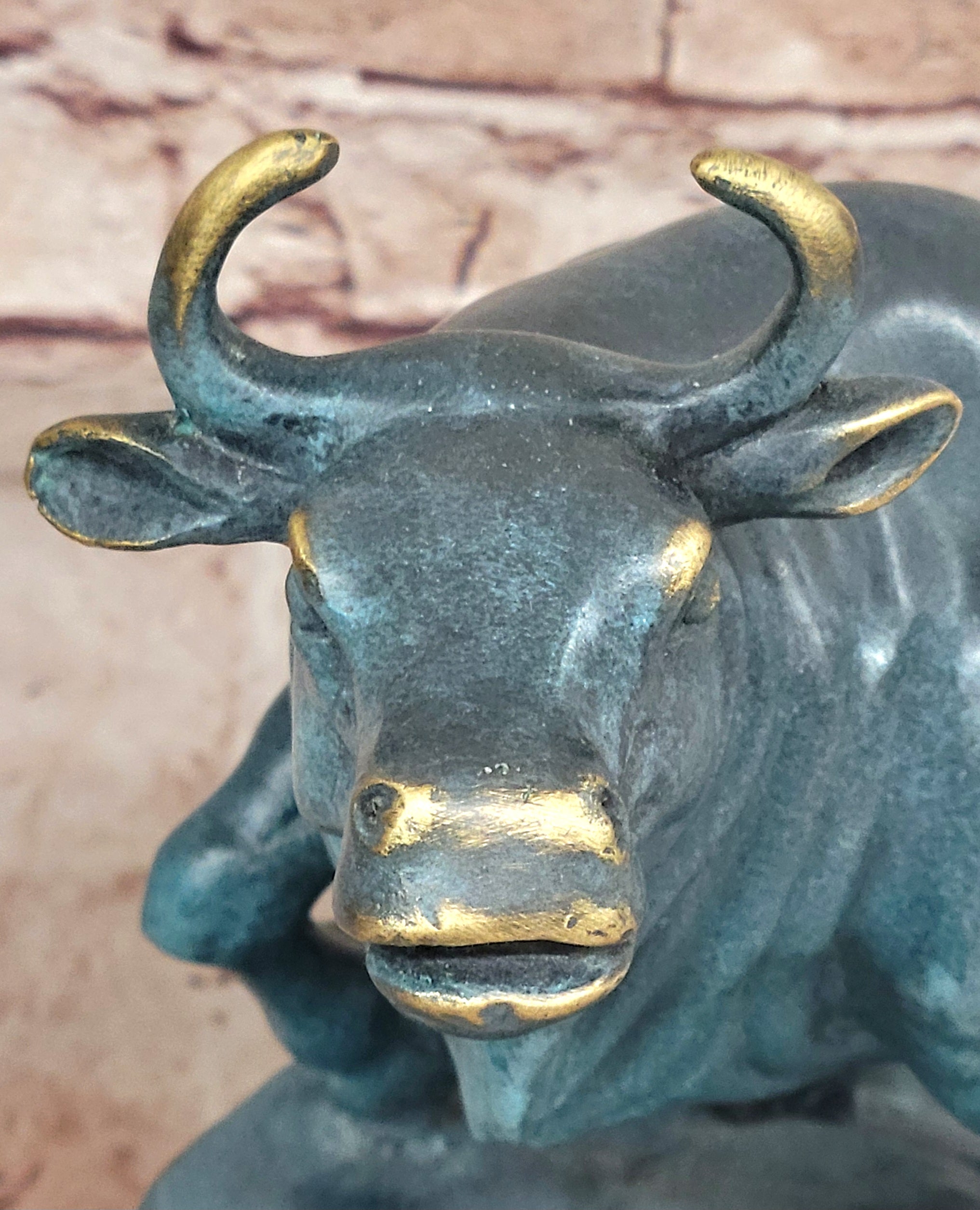 Expertly crafted using the traditional "Lost Wax Method," this piece showcases the intricate detailing of the bull’s form, from the defined musculature to the dynamic posture. The sculpture features a rich green patina, which enhances its visual impact and adds a sense of timeless elegance. The natural tones of the patina bring out the fine textures and lines, giving the artwork a lifelike and dynamic presence.