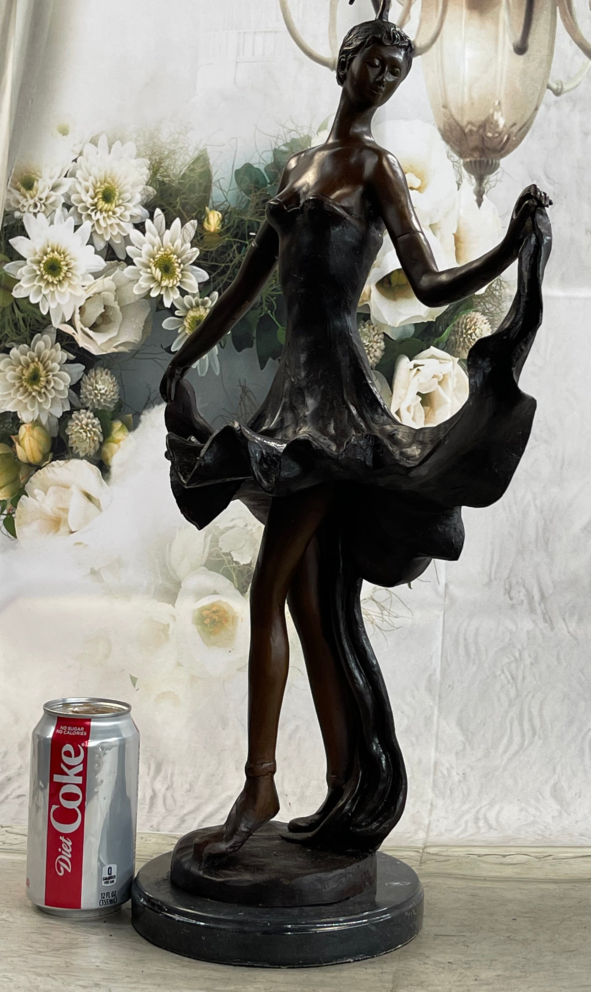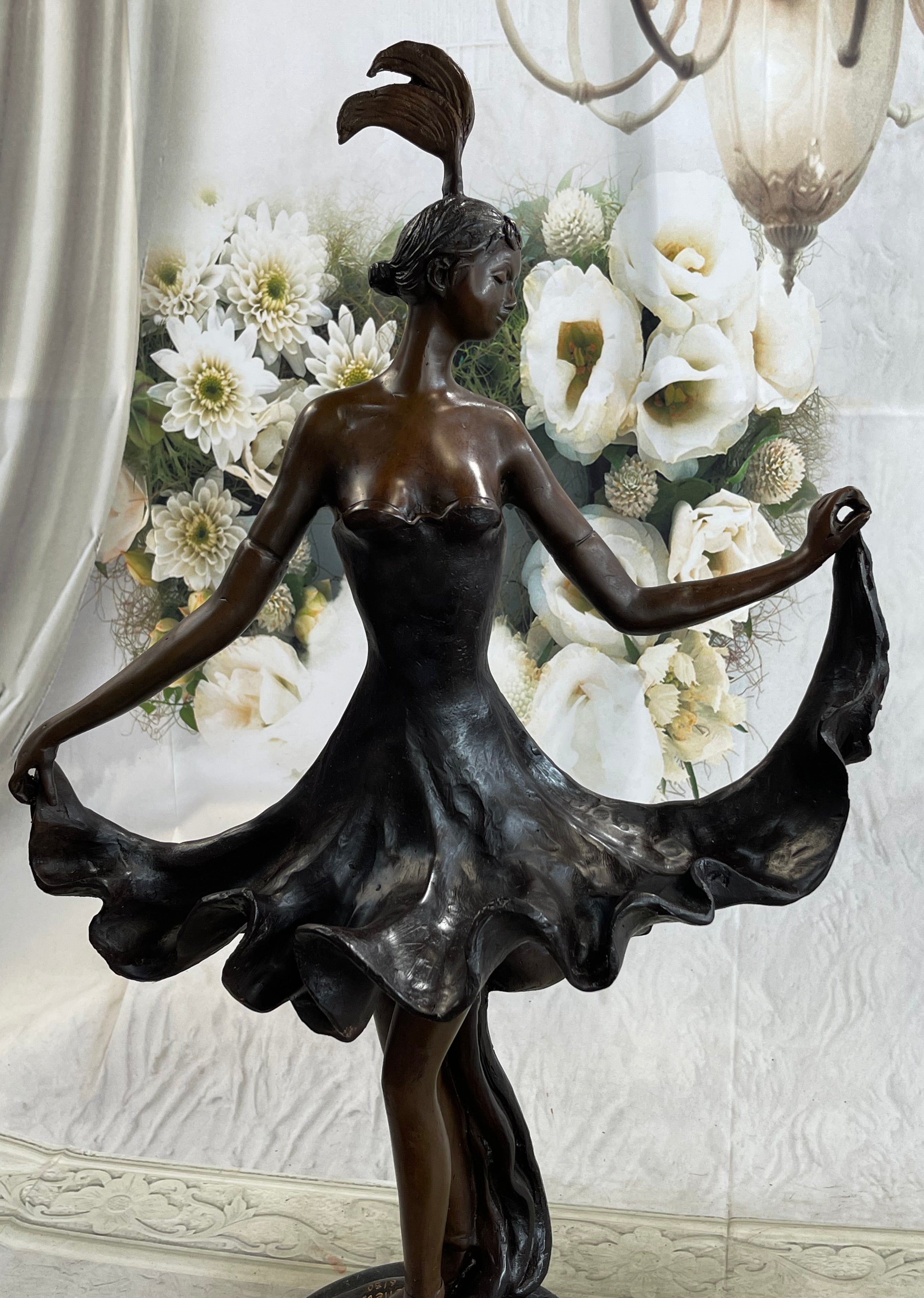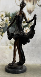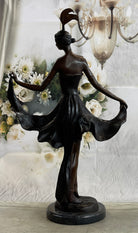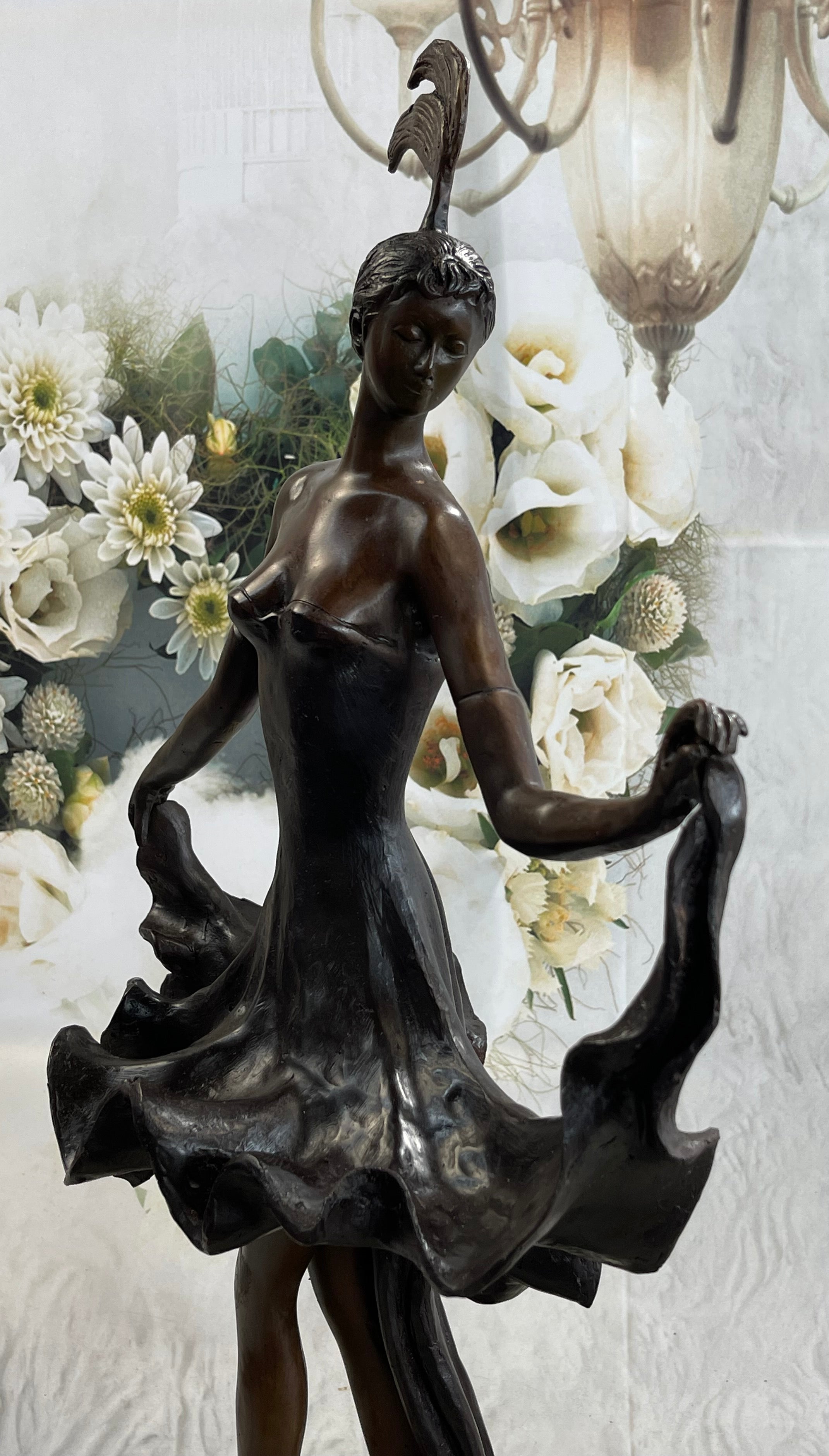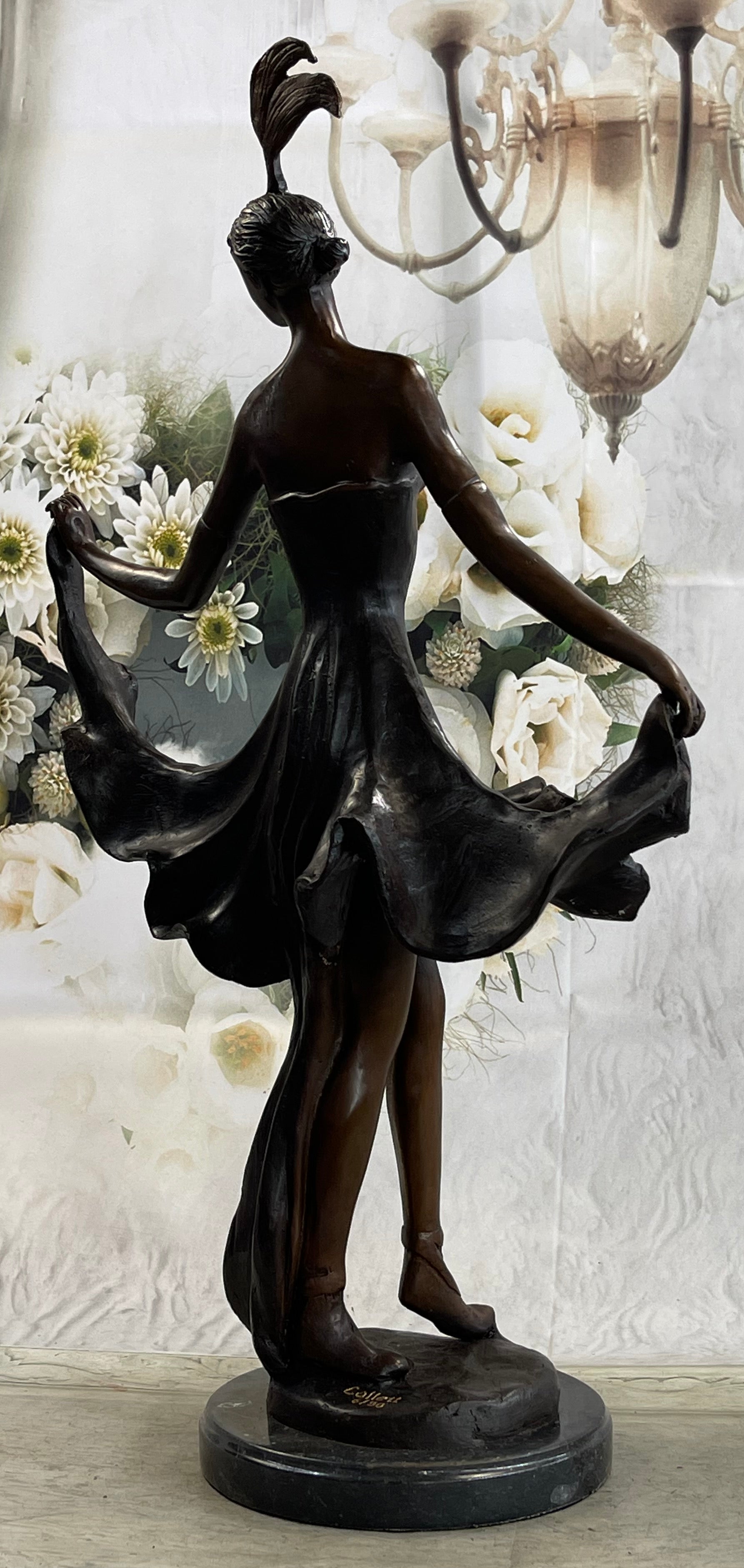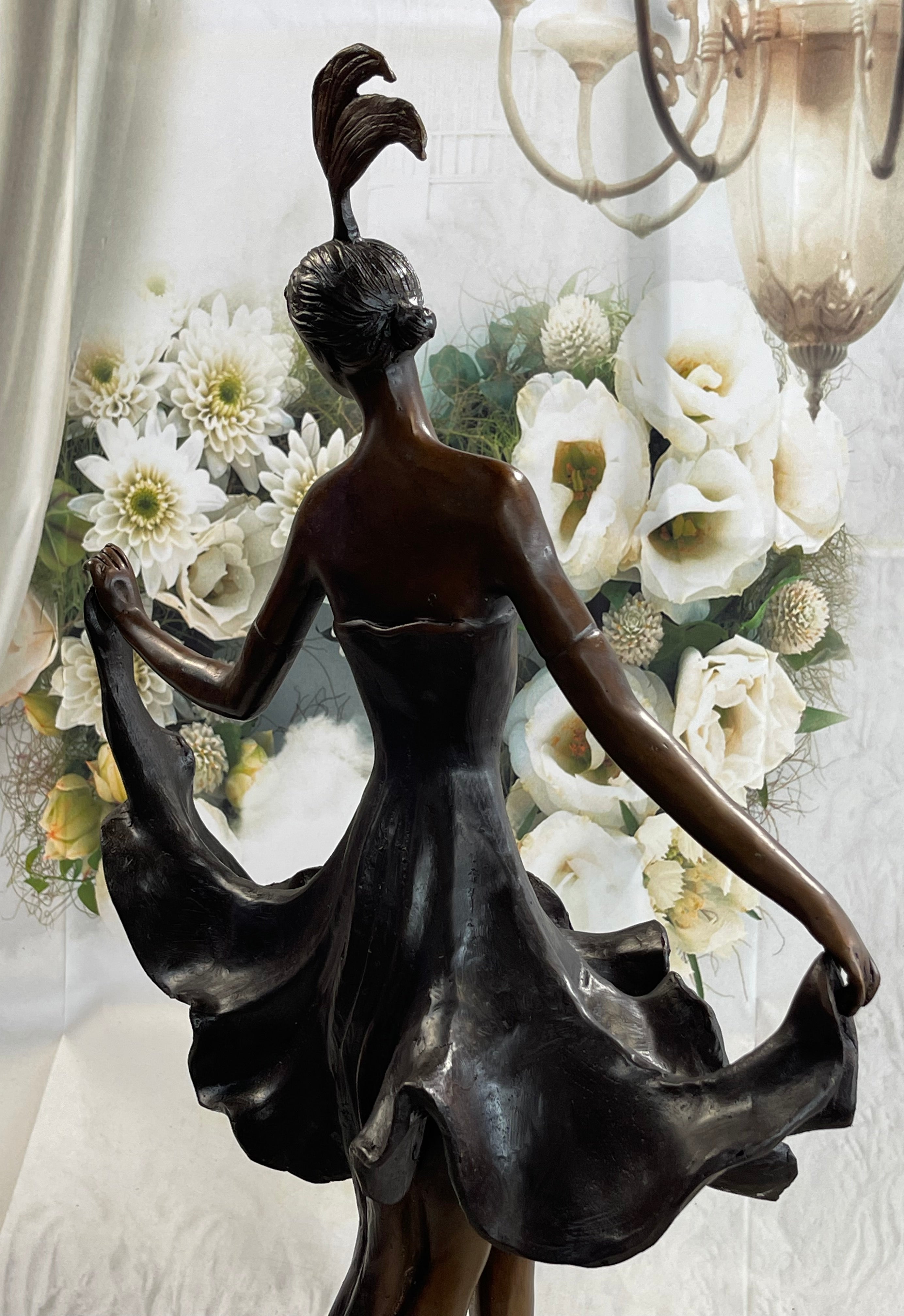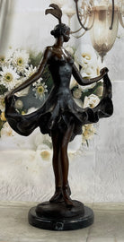 Dancer" by Dimitri Chiparus Marvelous flow in detail captured in Chiparus`s form. Another stunning piece to collect decorate, and behold in your abode or office. Only the highest quality in patina is used to last generations. The brown flesh tones are actually the amazing applications of a patina blend over bronze. This bronze stands 24" Tall 14.5." Wide and 5.5" Deep with an Marble base . Casted in Europe using the lost wax method. Notice the authenticity of this recast of the original sculpture by examining the head torso and hand positions. Poor reproductions do not use the original mold and create their sculptures based on artist`s renditions. Notice the magnificent application of this patina blend which will was fused into the bronze to last for generations.Bronze Dimensions with Marble Base: Height 24" x Width 14"