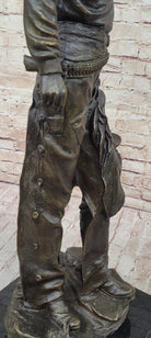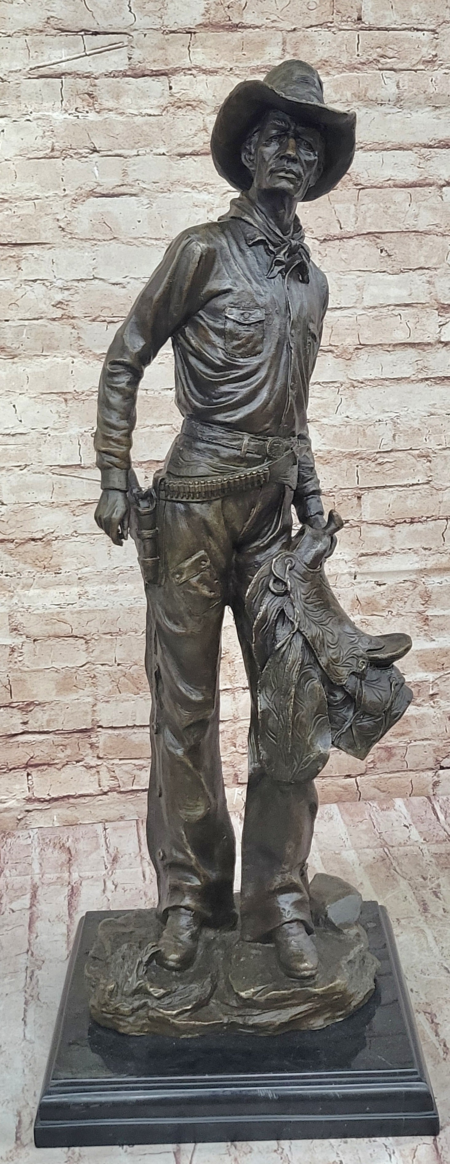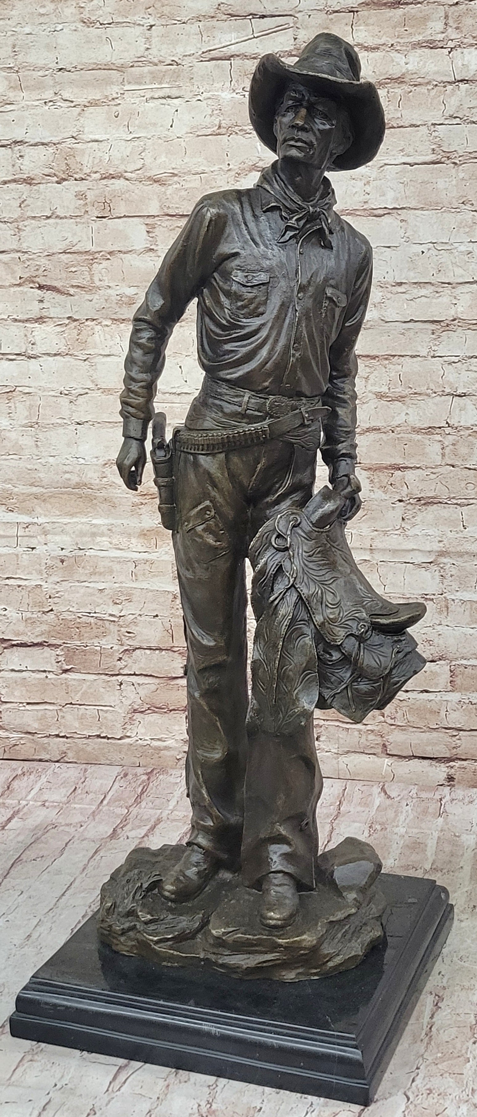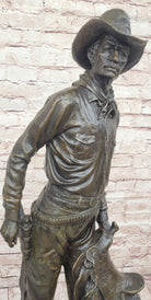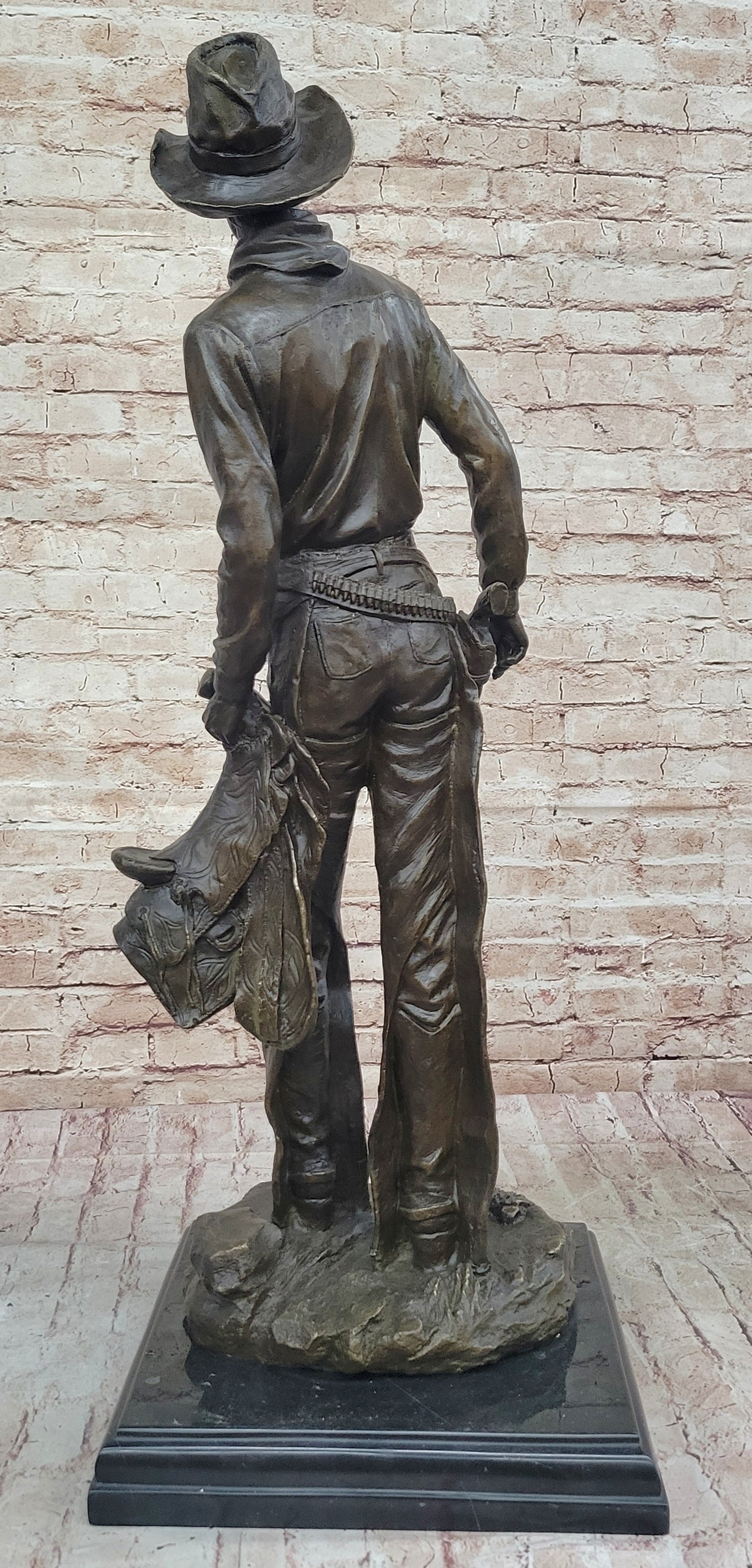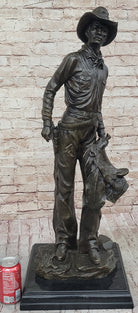Tall Cowboy Holding Horse Saddle - Western Art Decor Bronze Sculpture Statue on Marble Base