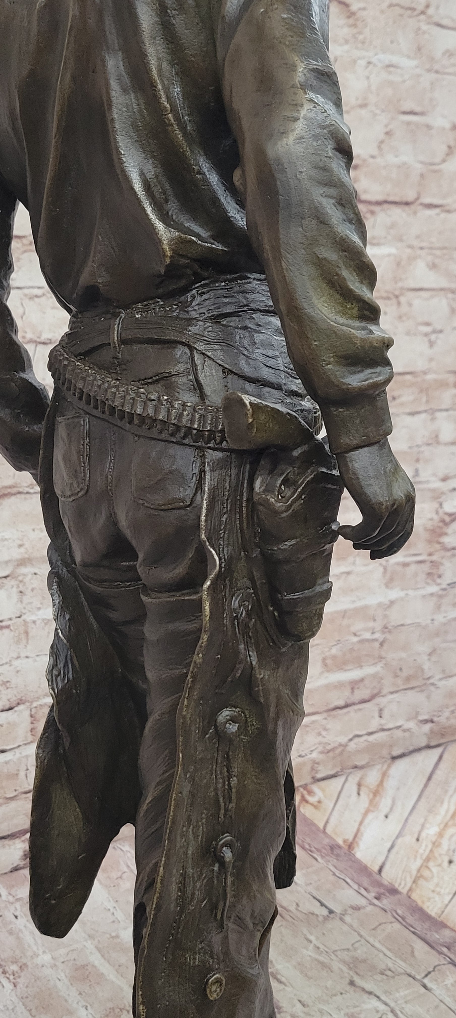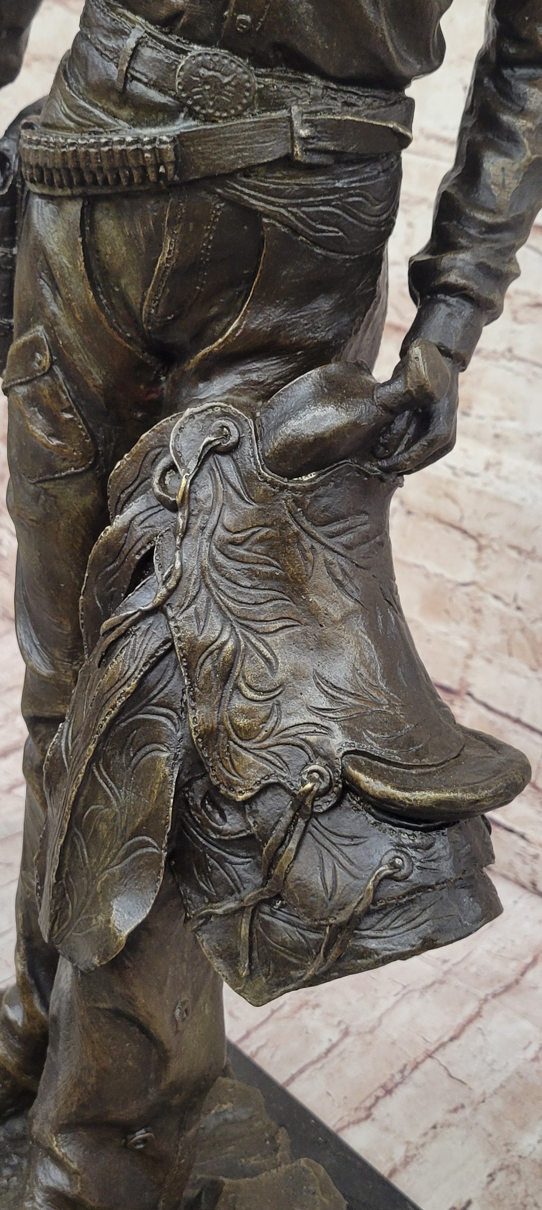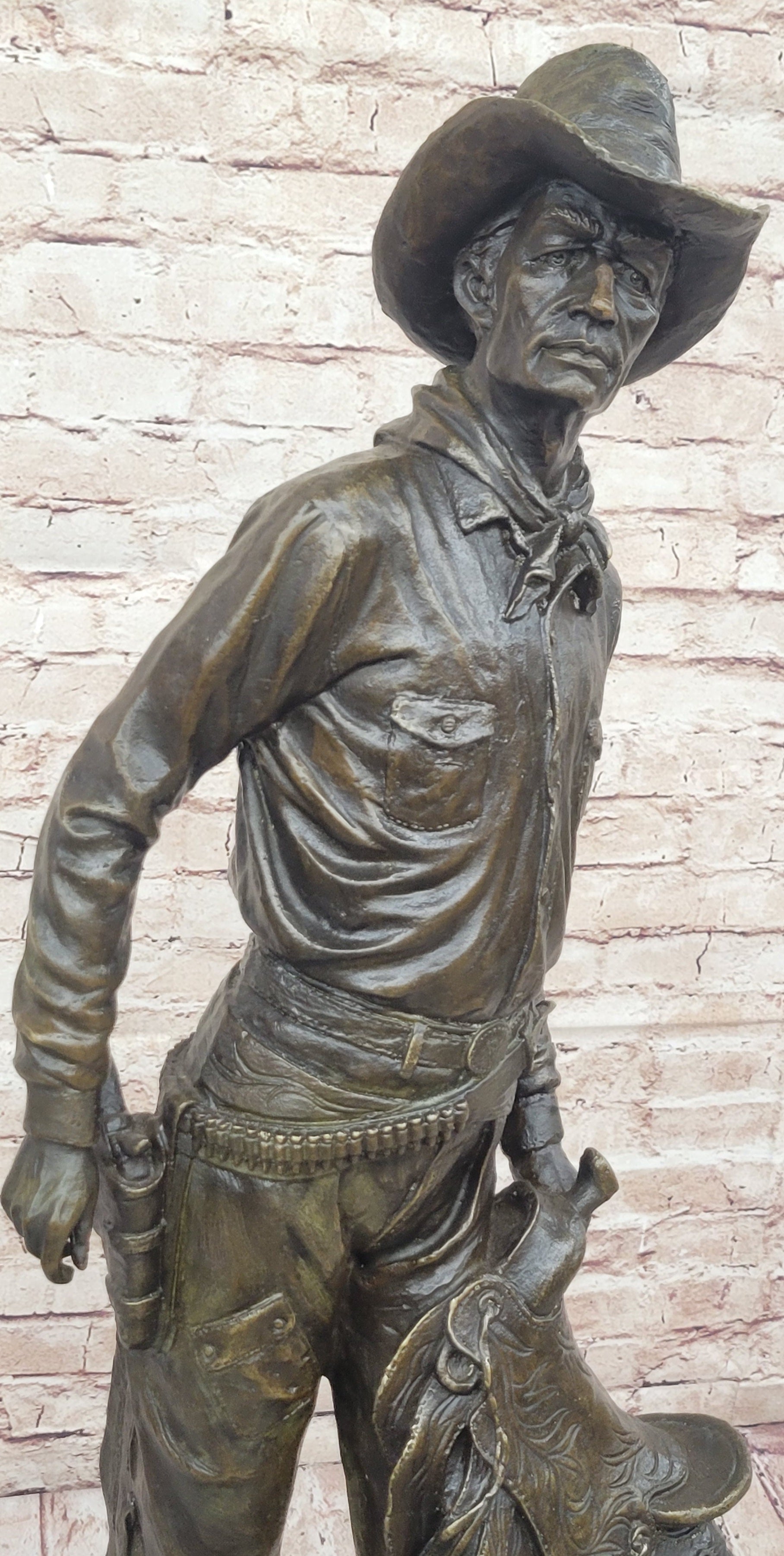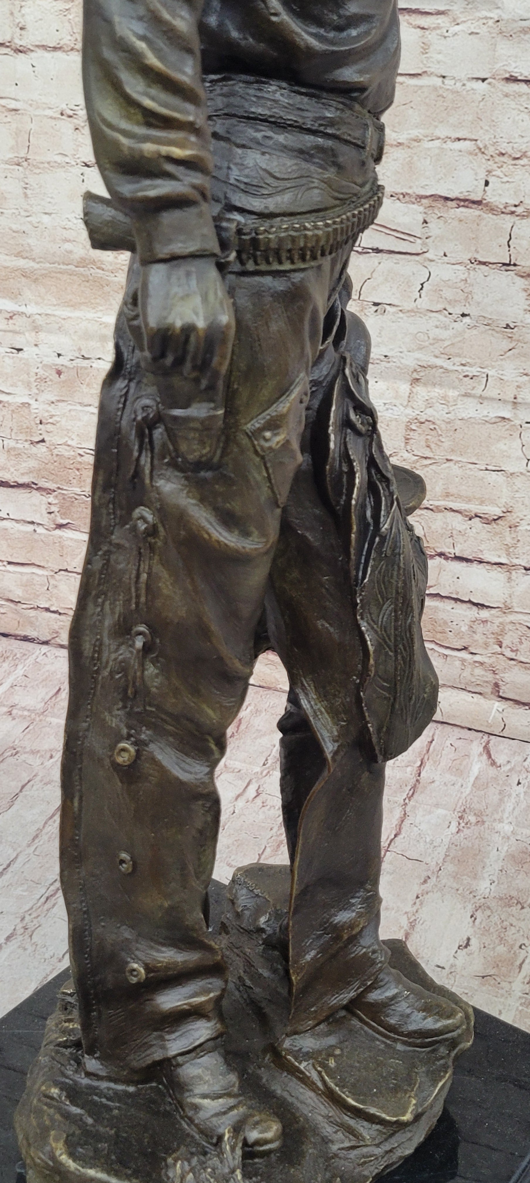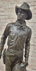 This captivating bronze sculpture captures the rugged spirit of the American cowboy, embodying the essence of life on the open range. The cowboy stands tall, with a confident stance, his iconic cowboy hat resting firmly on his head. The hanging tassels on his jacket and the necklace around his neck add a touch of authenticity to his rugged appearance. In his left hand, he holds his saddle, a symbol of his readiness for the challenges of the trail, while his boots are partly covered by his jeans, showing the wear of a hard day's work.