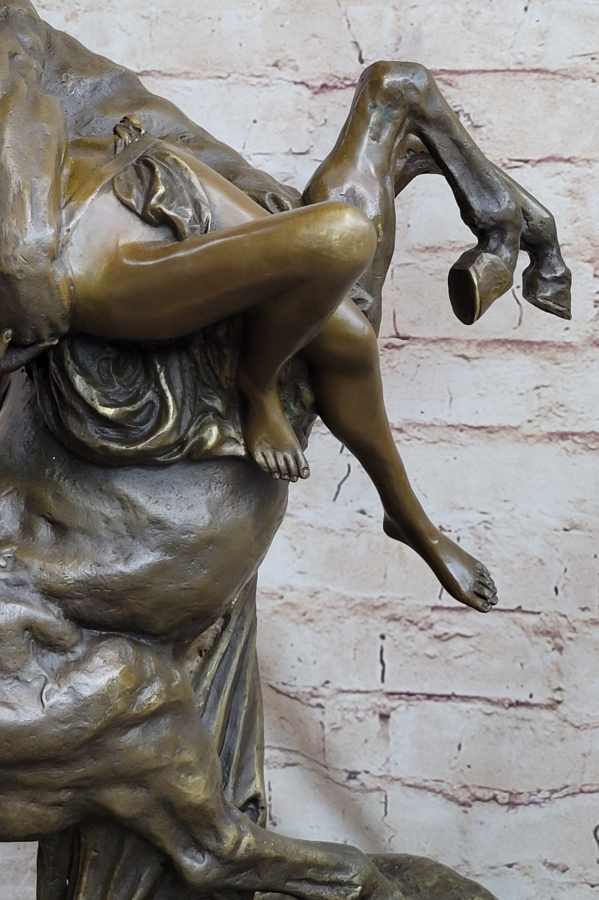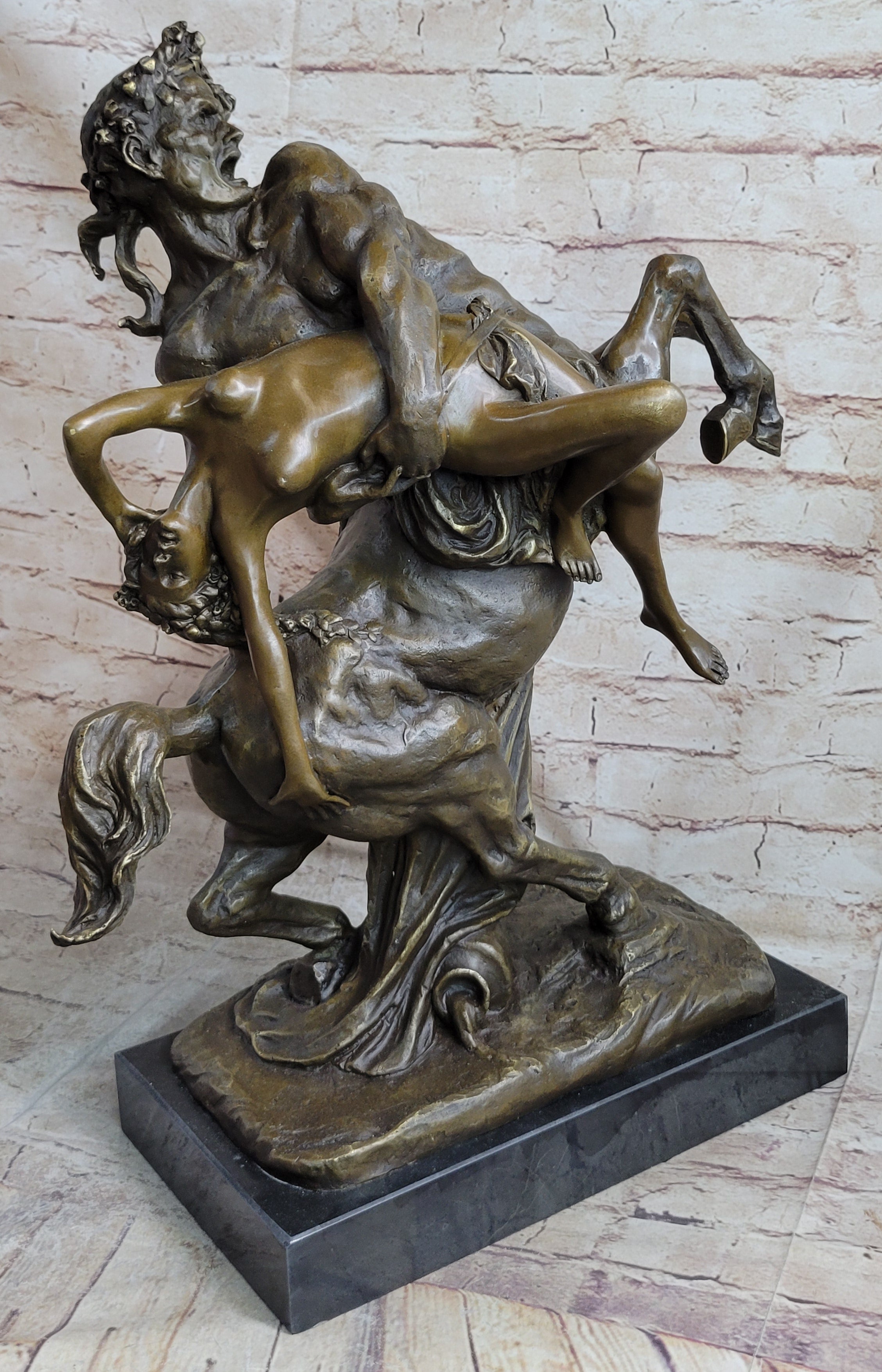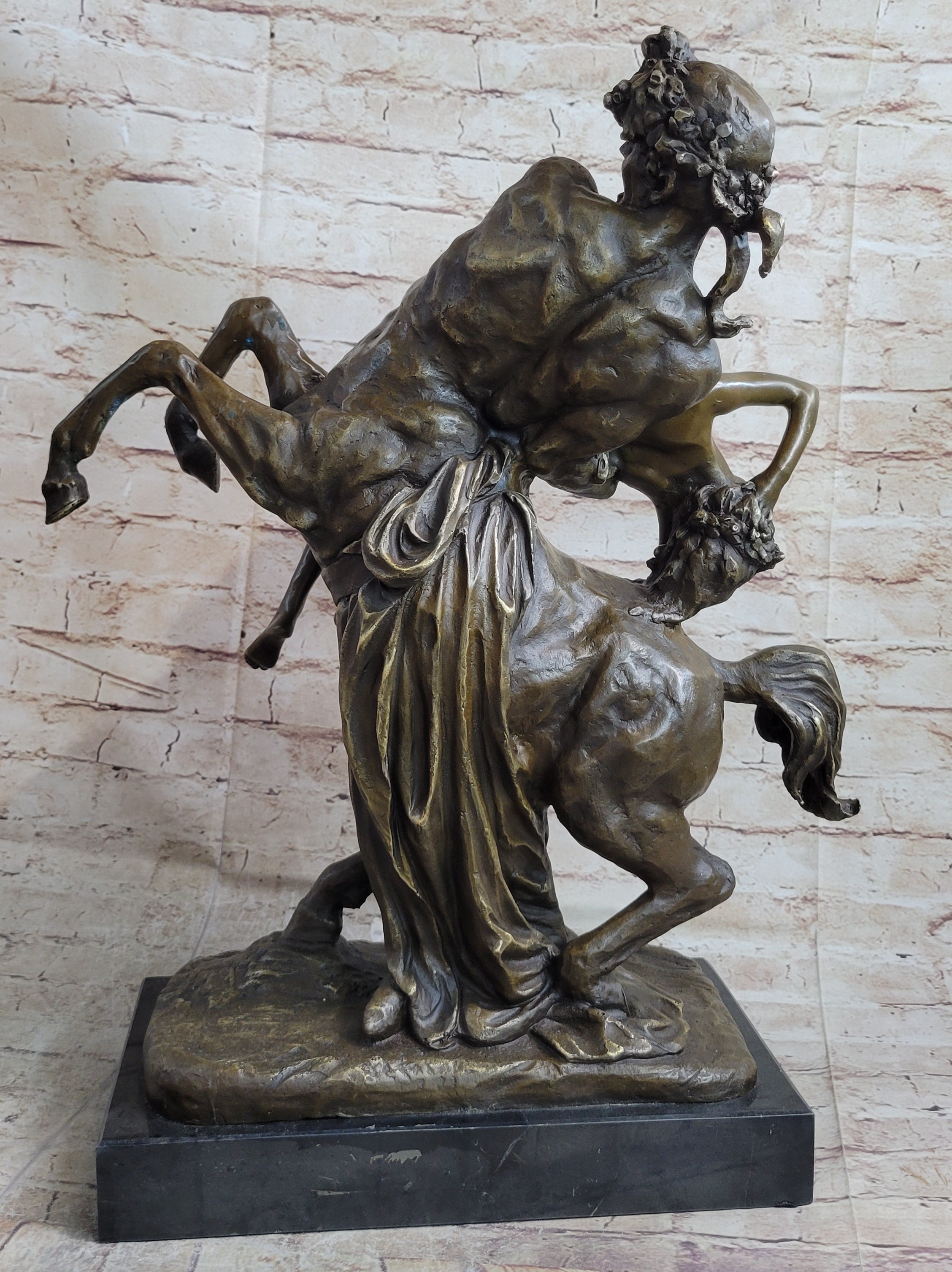 Immerse yourself in the captivating world of Greek mythology with the mesmerizing "Nessus and Deianira" bronze sculpture. This exquisite piece portrays the mythical centaur, Nessus, carrying a nude woman on his back. Centaurs, legendary creatures half-human and half-horse, hold significant symbolism in Greek mythology. They embody a duality of chaos and unbridled passion, while also representing honor, moderation, and tempered masculinity. This sculpture specifically pays homage to Nessus, a notorious centaur known for his role in the tragic story of the "Tunic of Nessus."