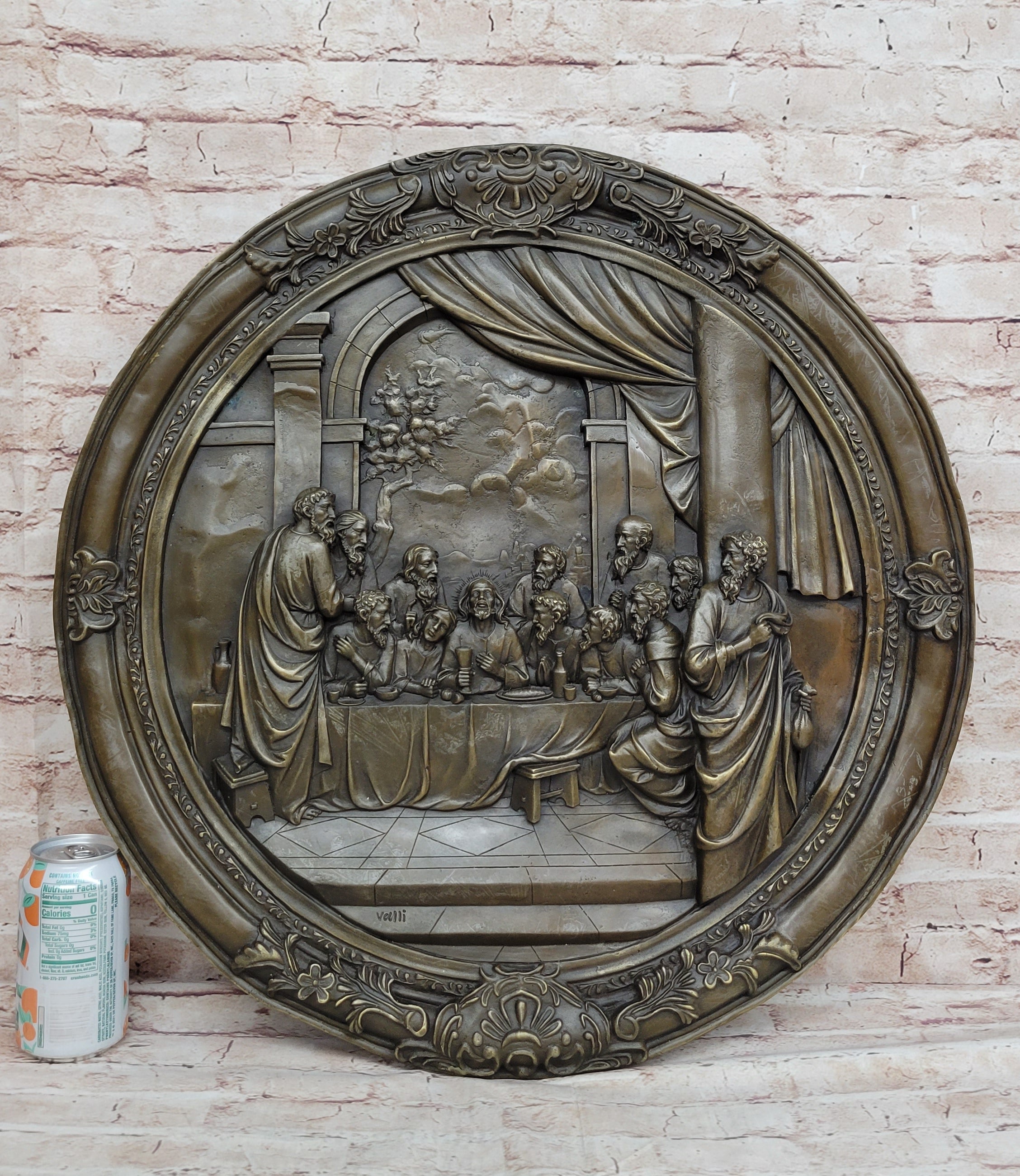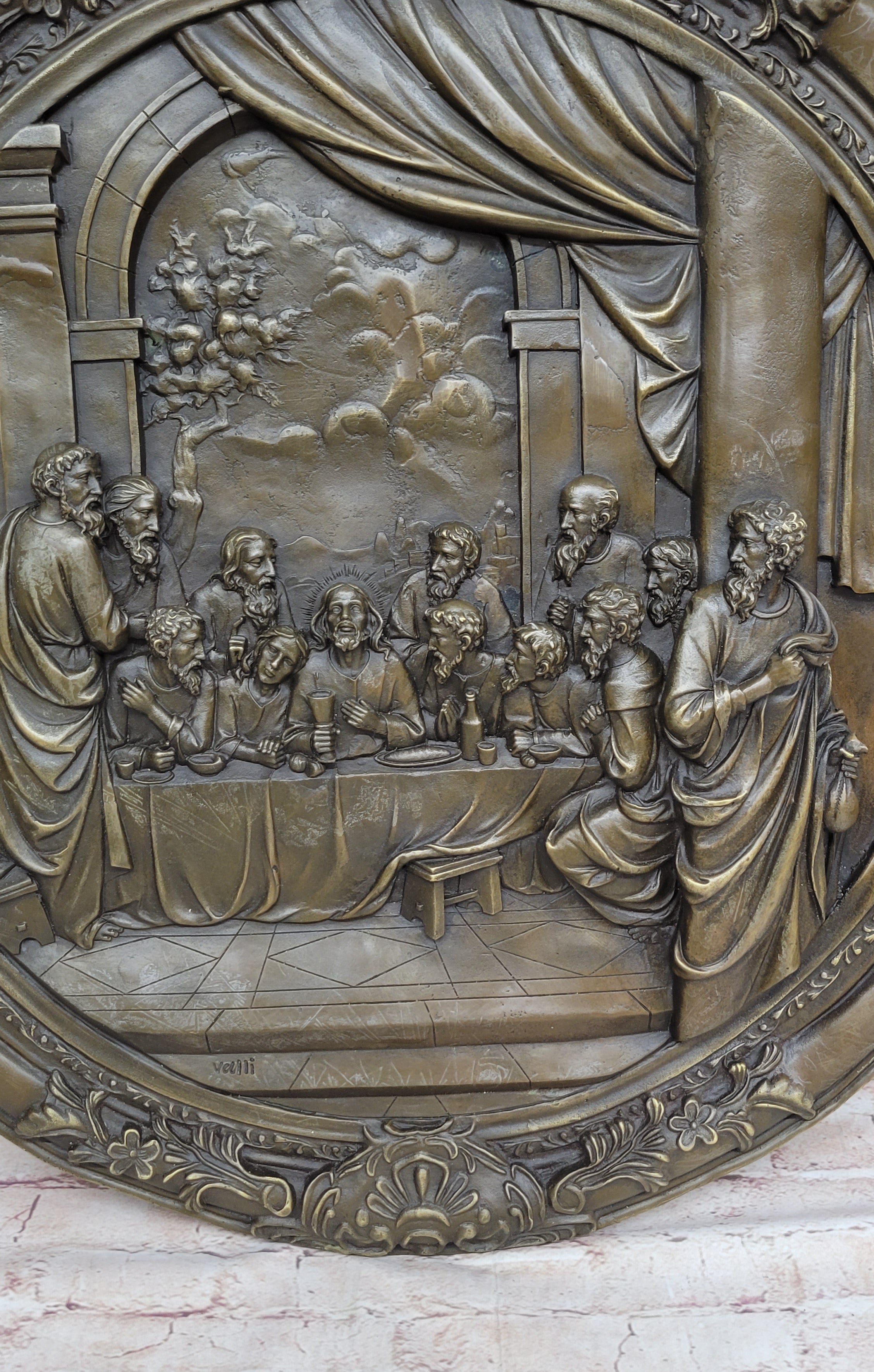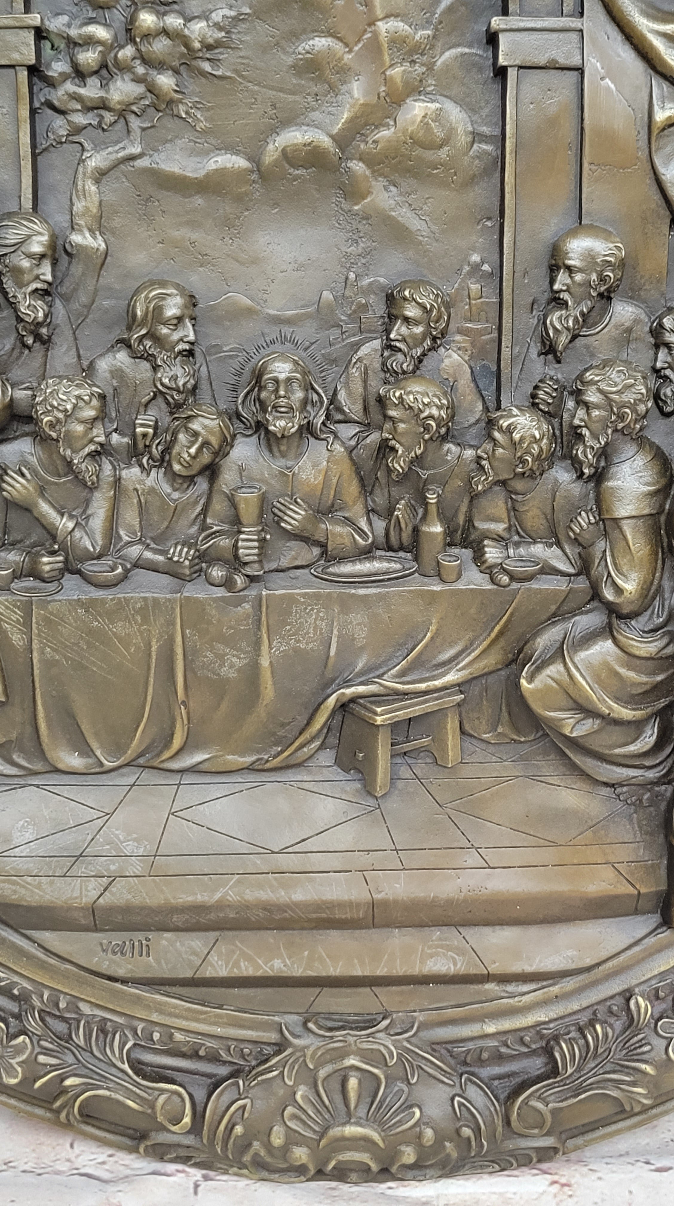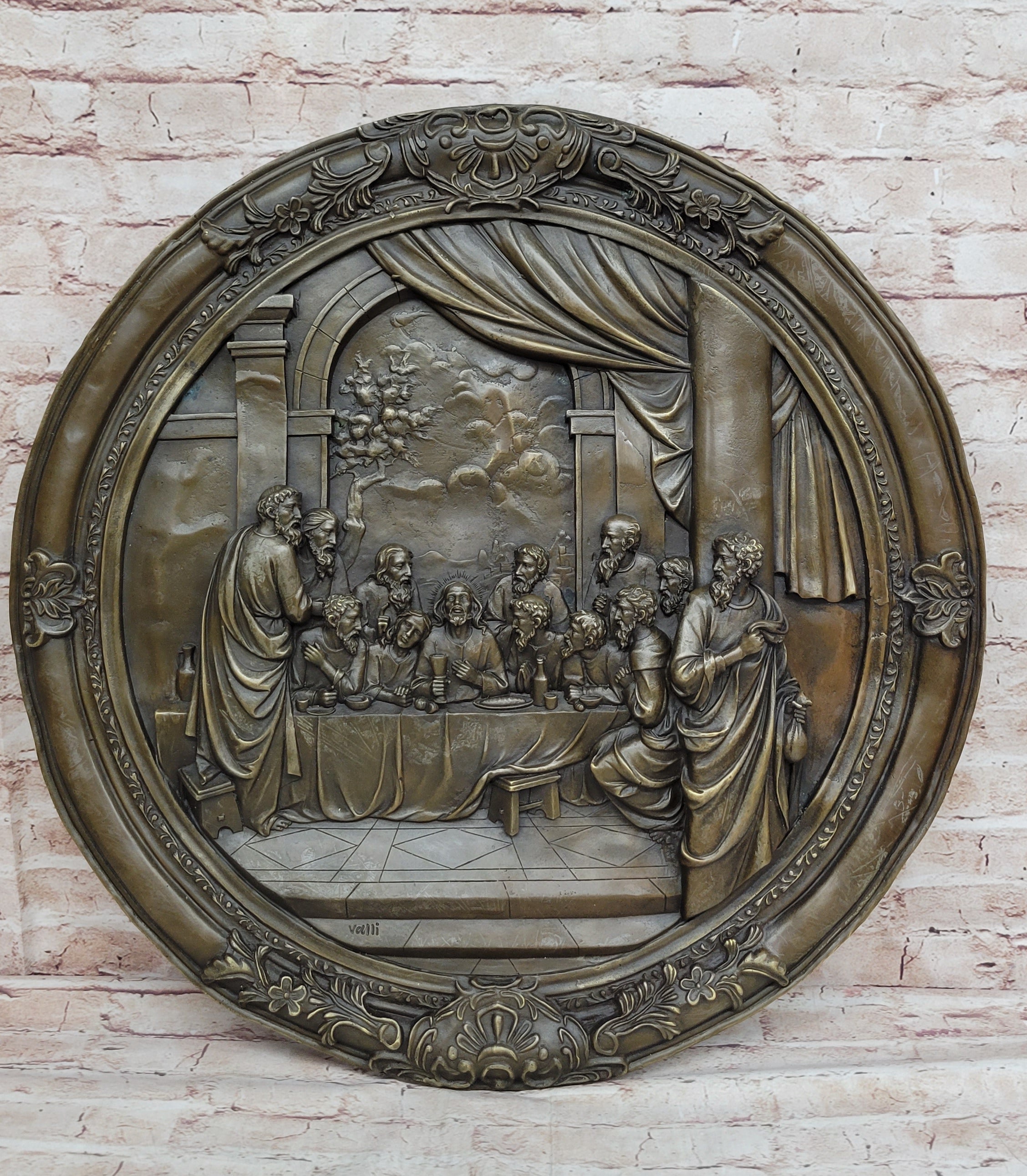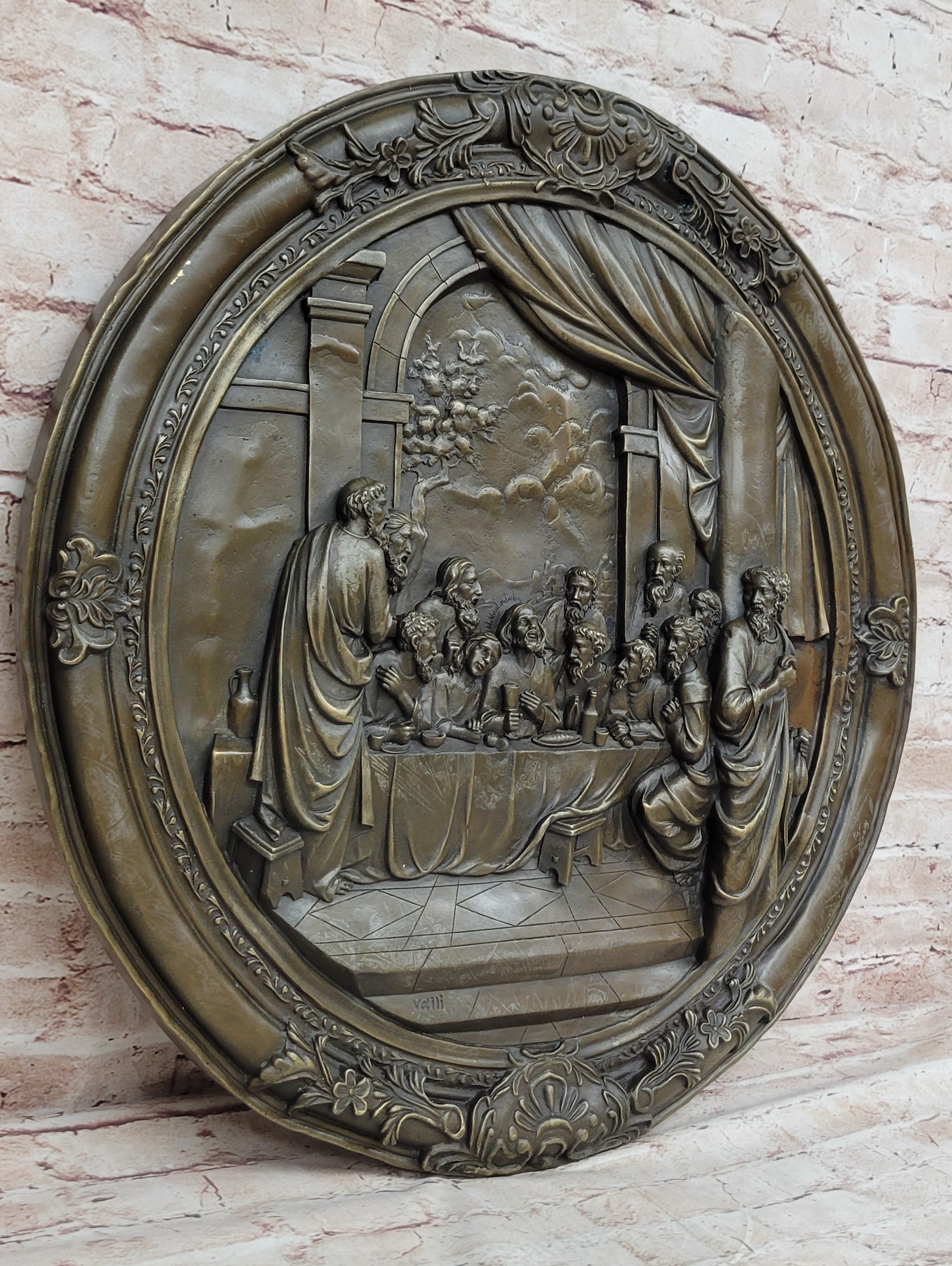 The rich brown patina finish on the bronze adds depth and dimension to the sculpture, lending it an air of authenticity and historical weight. As a wall-mounted artwork, it invites viewers to engage with the narrative of the Last Supper, encouraging contemplation and introspection. Whether placed in a religious setting or as a centerpiece in an art collection, this statue by Valli serves as a profound reminder of faith, sacrifice, and redemption.