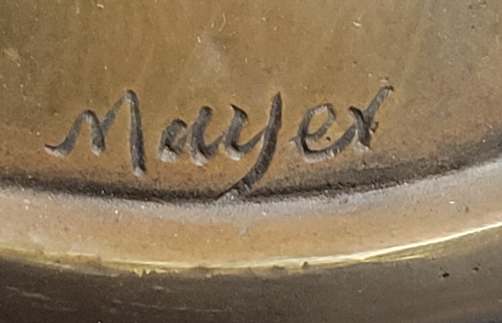 Crafted using the ancient lost-wax casting method, this bronze sculpture showcases remarkable artistry and attention to detail. The brown patina finish adds a touch of elegance, accentuating the intricate features and textures of the sculpture. Mounted on a sleek black marble base, the statue stands tall, radiating a sense of strength and importance. The artist's signature, Mayer, serves as a testament to the sculpture's quality and craftsmanship.