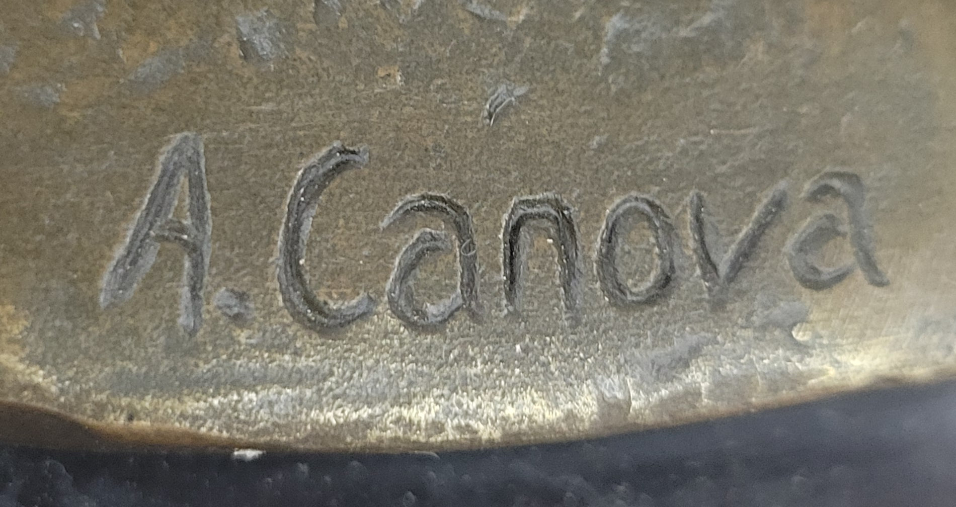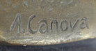 Mounted on a sleek black marble base, this sculpture of the Three Graces is not only a work of art but also a perfect centerpiece for any room or collection. Its classical beauty will draw the admiration of all who see it, sparking conversations about the mythological themes and artistic revival that inspired its creation. Signed by A. Canova, this sculpture is a stunning tribute to the enduring allure of classical art and a must-have for any collector or lover of fine art.Bronze Dimensions with Marble Base: Height 12" X Width 7"