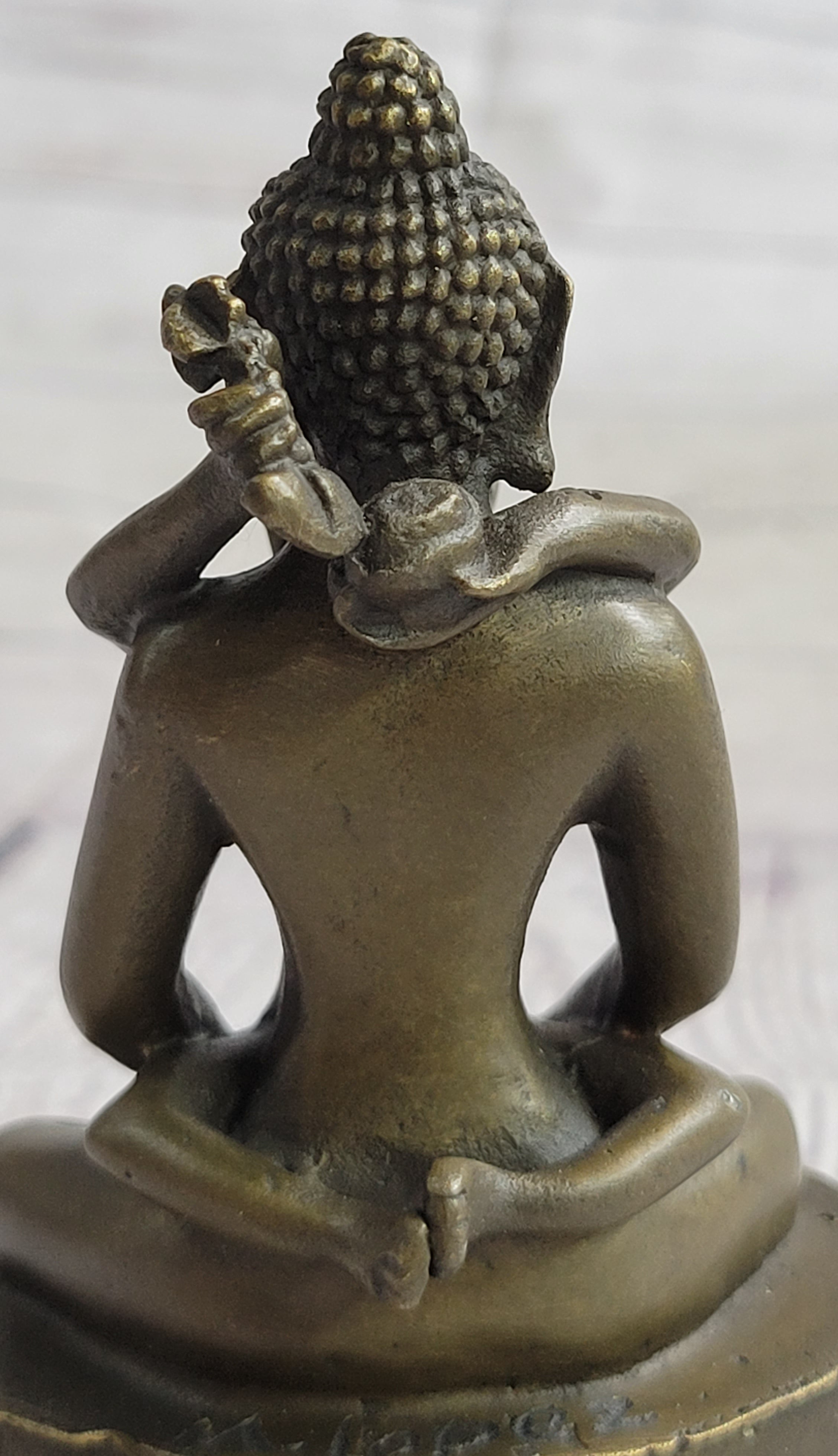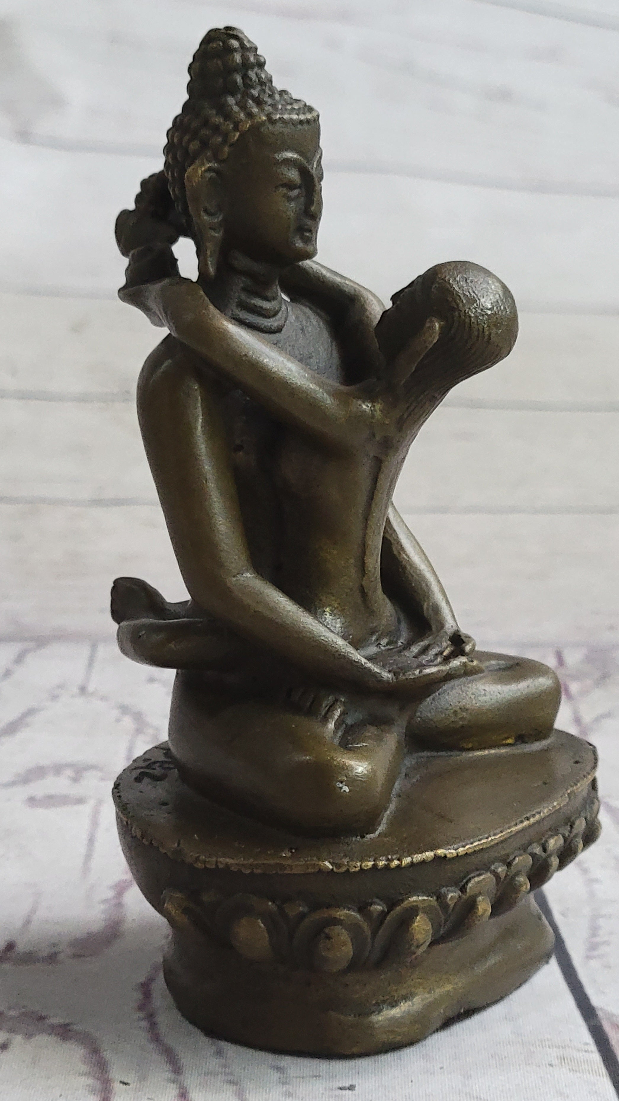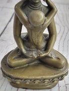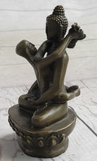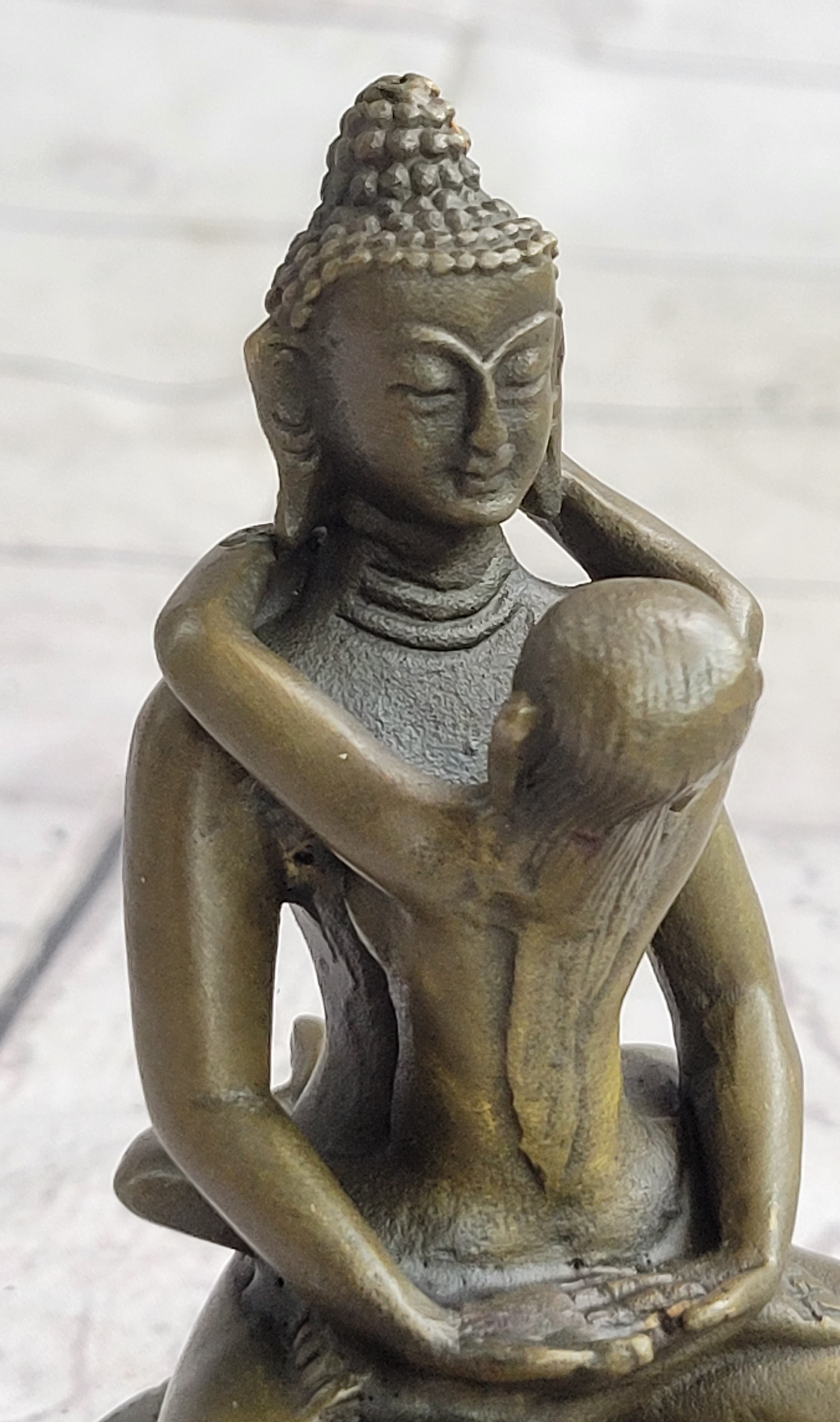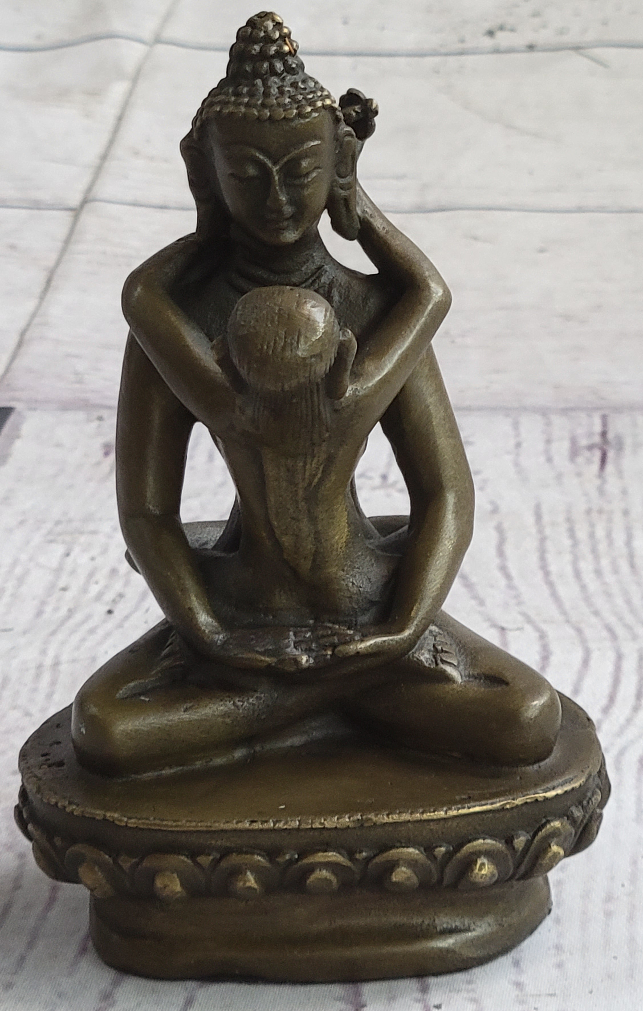Yab-yum stands as a prevalent symbol in the rich tapestry of Tibetan Buddhist art, deeply rooted in the cultural expressions of India, Bhutan, Nepal, and Tibet. This symbolic representation embodies the primordial union of wisdom and compassion, showcasing a male deity in harmonious union with his female consort. The concept of yab-yum transcends the physical and delves into the spiritual, encapsulating the interconnectedness of these two essential aspects in the pursuit of enlightenment. In this tantric statue, meticulously crafted by the skilled hands of artist Miguel Lopez, the yab-yum symbolism comes to life. The male figure in union with his female partner holds profound significance, with the male embodying compassion and skillful means, while the female represents insight. The intricacies of their entwined forms reflect a profound spiritual connection, inviting viewers to contemplate the dynamic interplay of wisdom and compassion within the context of Tibetan Buddhism. This handmade statue by Miguel Lopez serves not only as a tangible representation of yab-yum but also as a testament to the artist's dedication to capturing the depth and intricacy of Buddhist philosophy. The craftsmanship and attention to detail breathe life into this sacred symbol, making it a compelling addition to any collection of spiritual art. As a fusion of artistic expression and religious symbolism, this tantric statue by Miguel Lopez invites viewers to explore the profound teachings embedded in Tibetan Buddhist tradition.