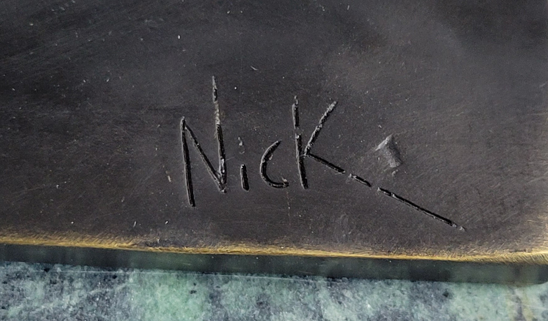 Mounted on a sleek green marble base, the bronze cyclist stands as a timeless tribute to the art of athleticism and endurance. Signed by the artist Mario Nick, this sculpture is a unique and powerful addition to any collection, honoring both the human body and the passion for sport.Bronze Dimensions with Marble Base: Height 10" X Width 7"