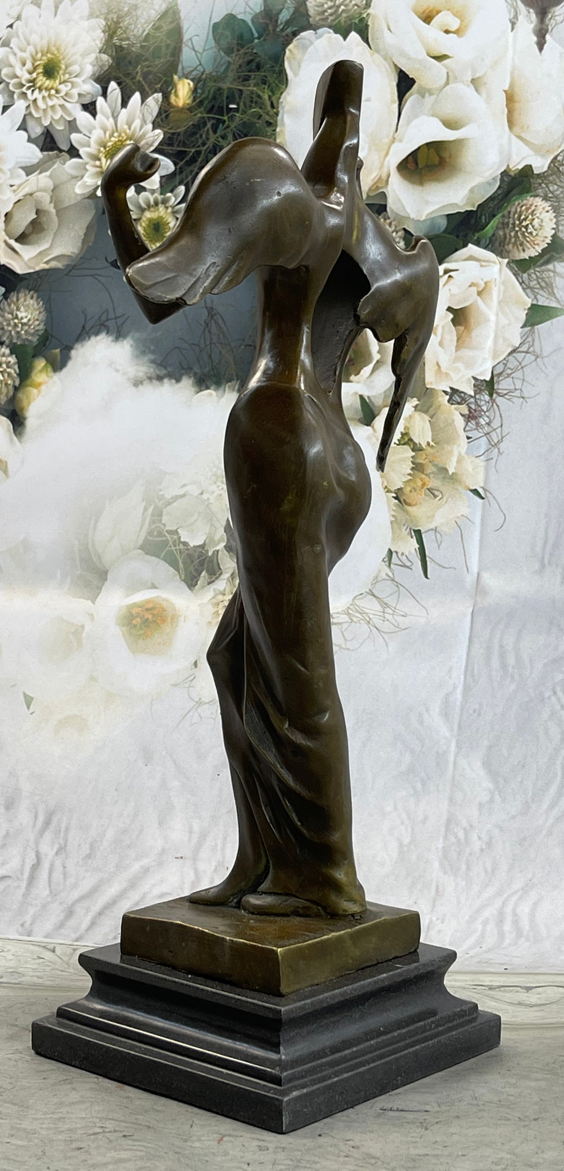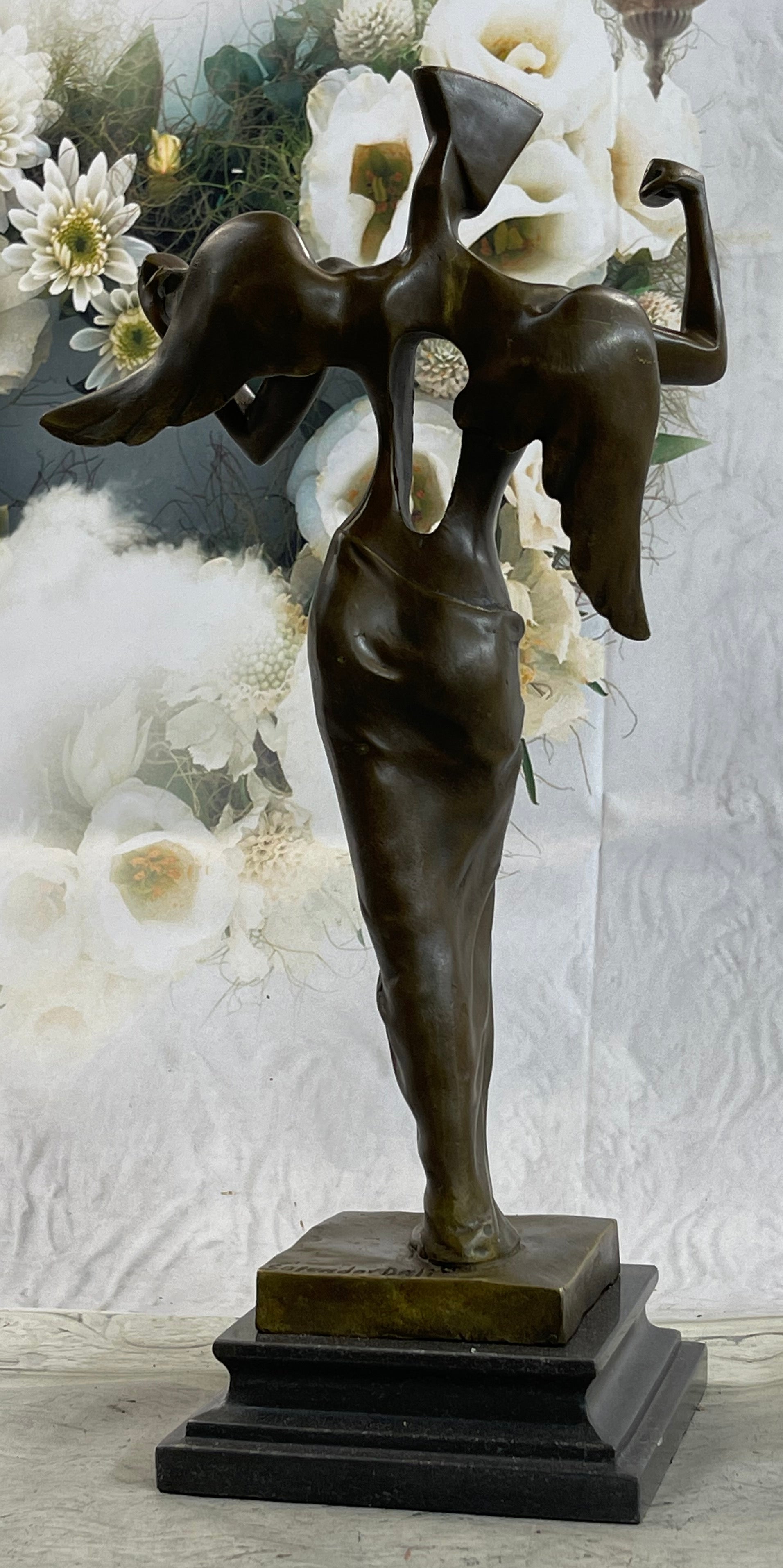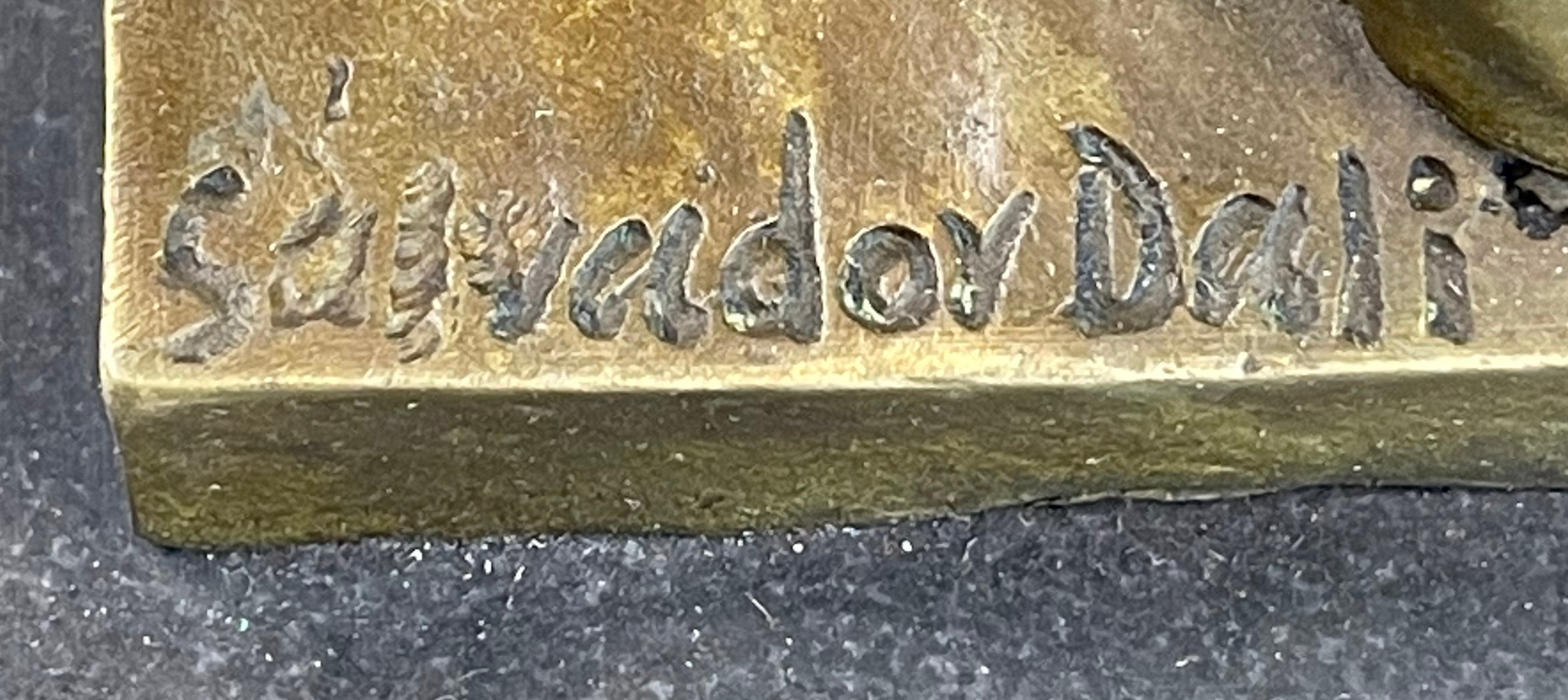 Imbued with a rich legacy of artistic excellence, this sculpture represents an invaluable piece of art history, inviting the timeless allure of Dali's creative vision into the sanctum of your home. Meticulously crafted from premium-grade bronze using the esteemed lost wax technique, this masterpiece stands resolutely on a sleek black marble base, bearing the distinctive signature of Salvador Dali, a testament to its unparalleled quality and artistic prestige.Bronze Dimensions with Marble Base: Height 16" X Width 8"