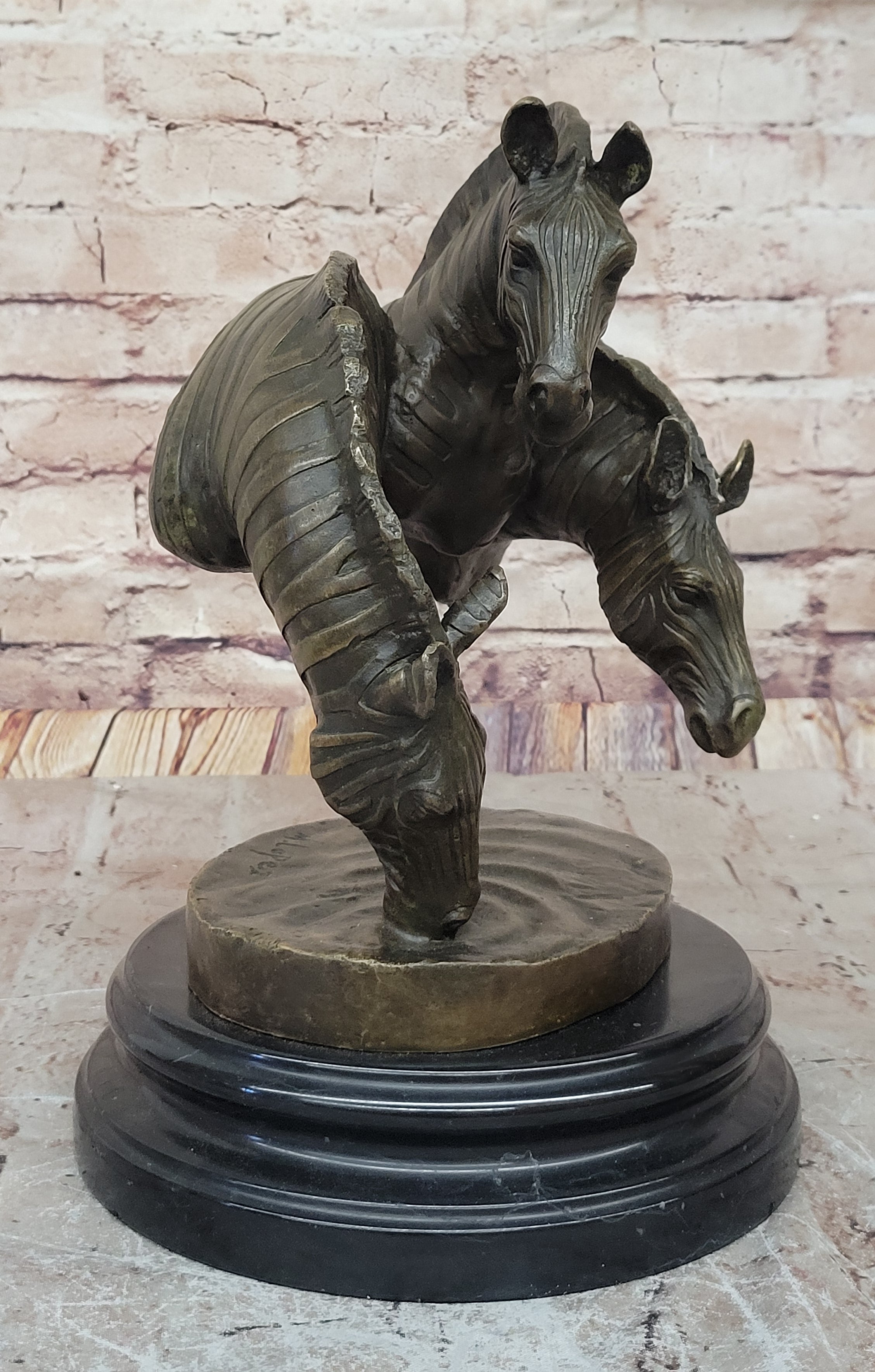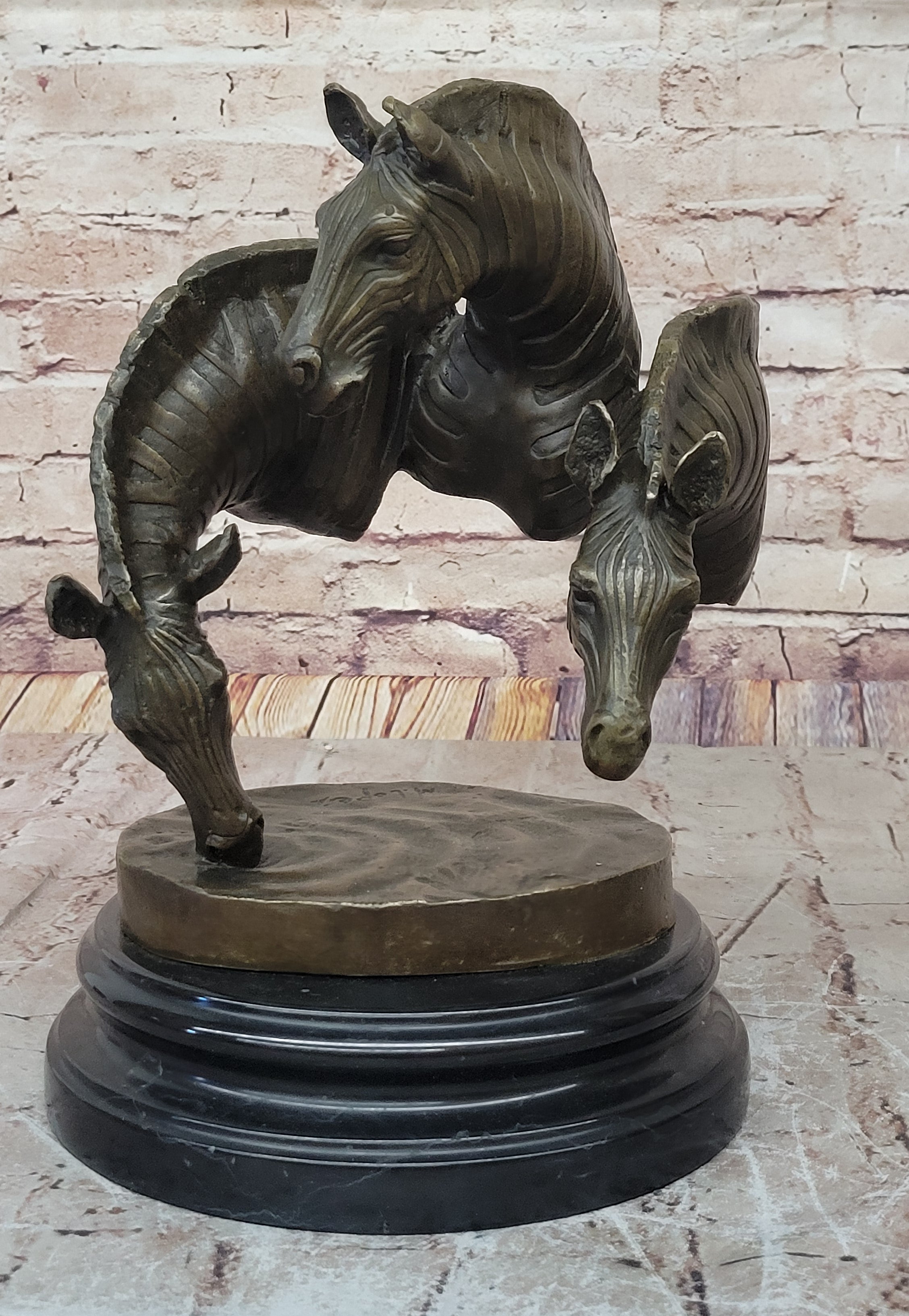 Handcrafted from pure plum bronze using the traditional lost-wax casting method, this sculpture is a true work of art. The darker strips on the zebras create a striking contrast against the polished bronze surface, making this piece a real conversation starter.