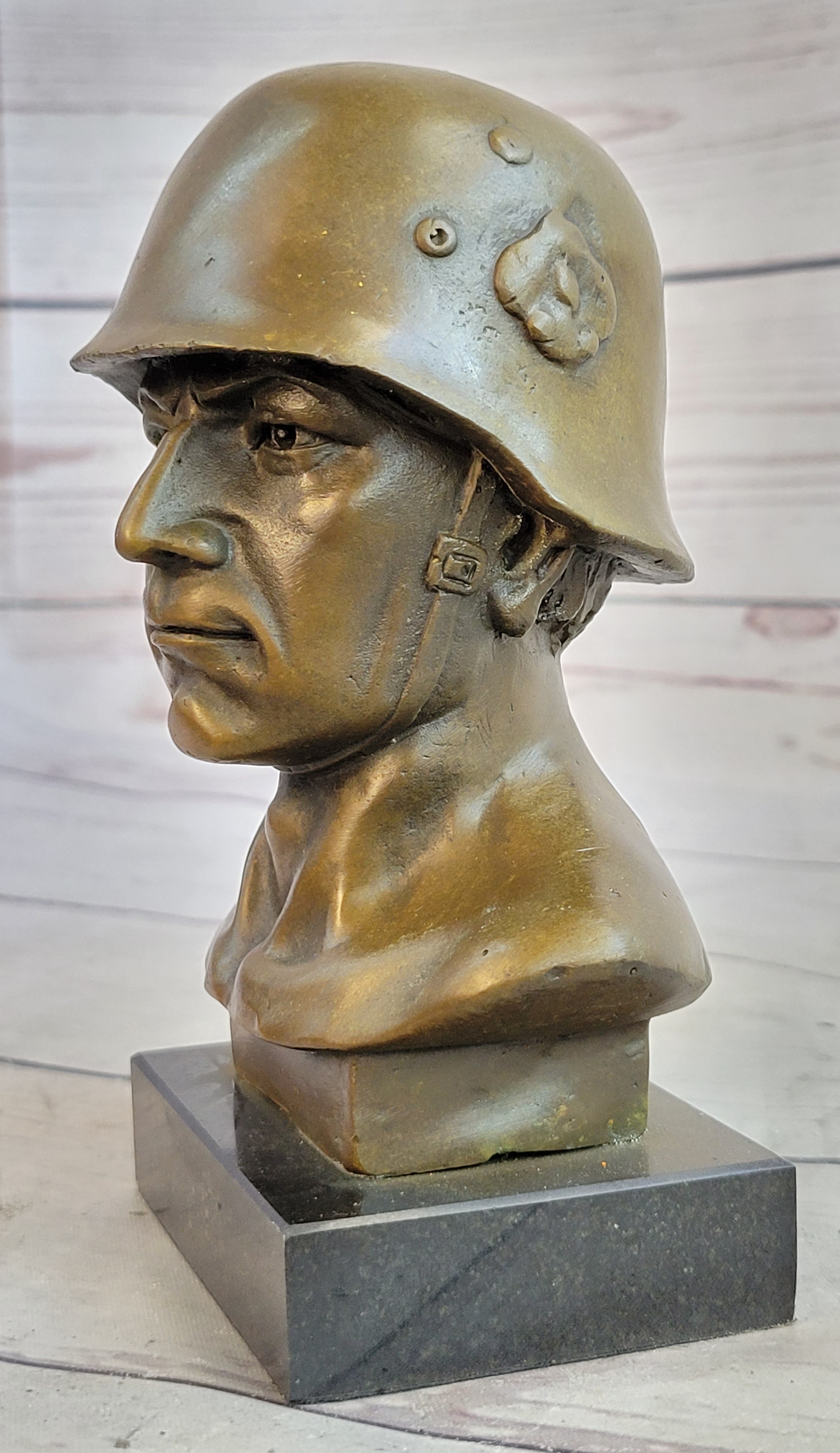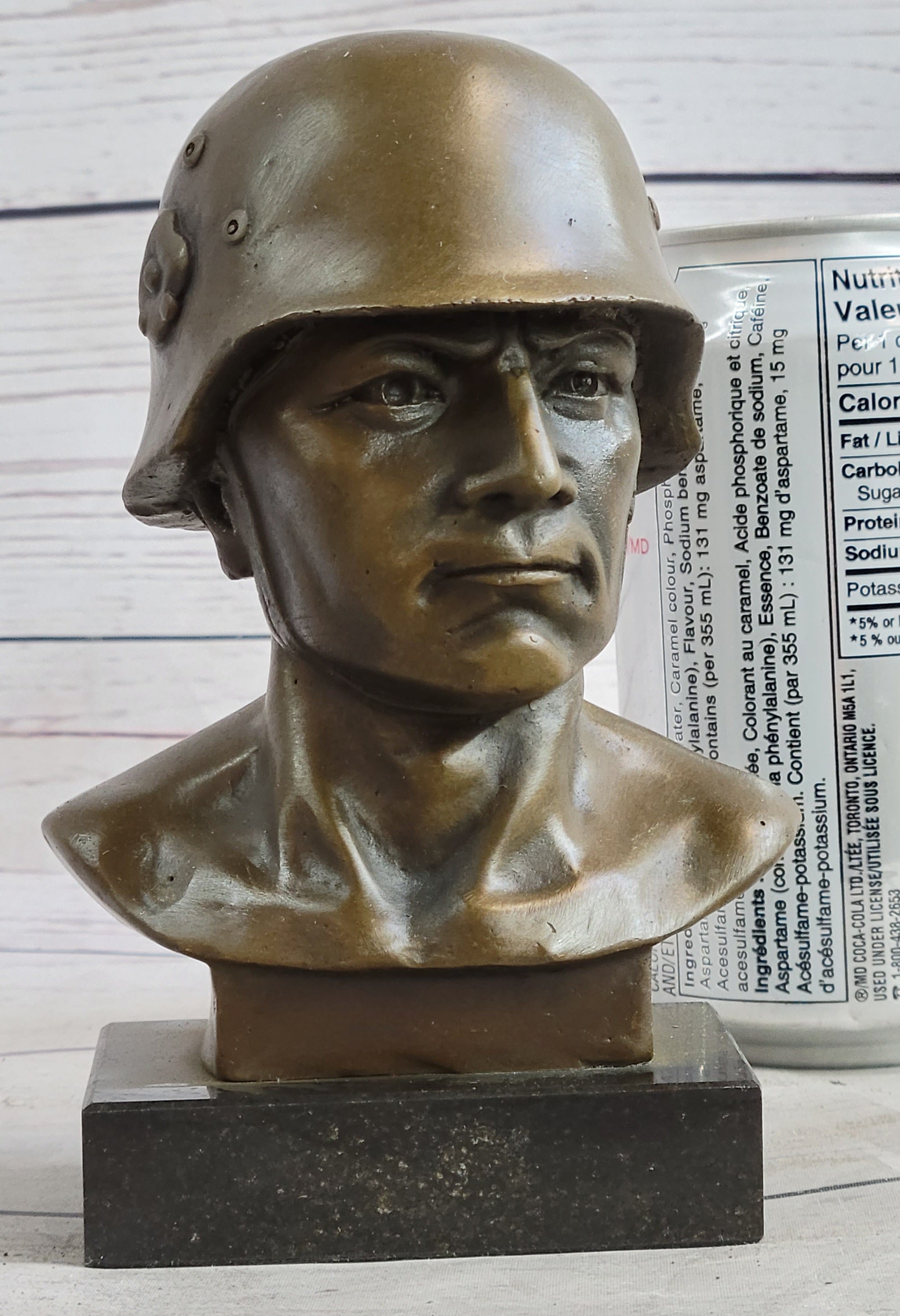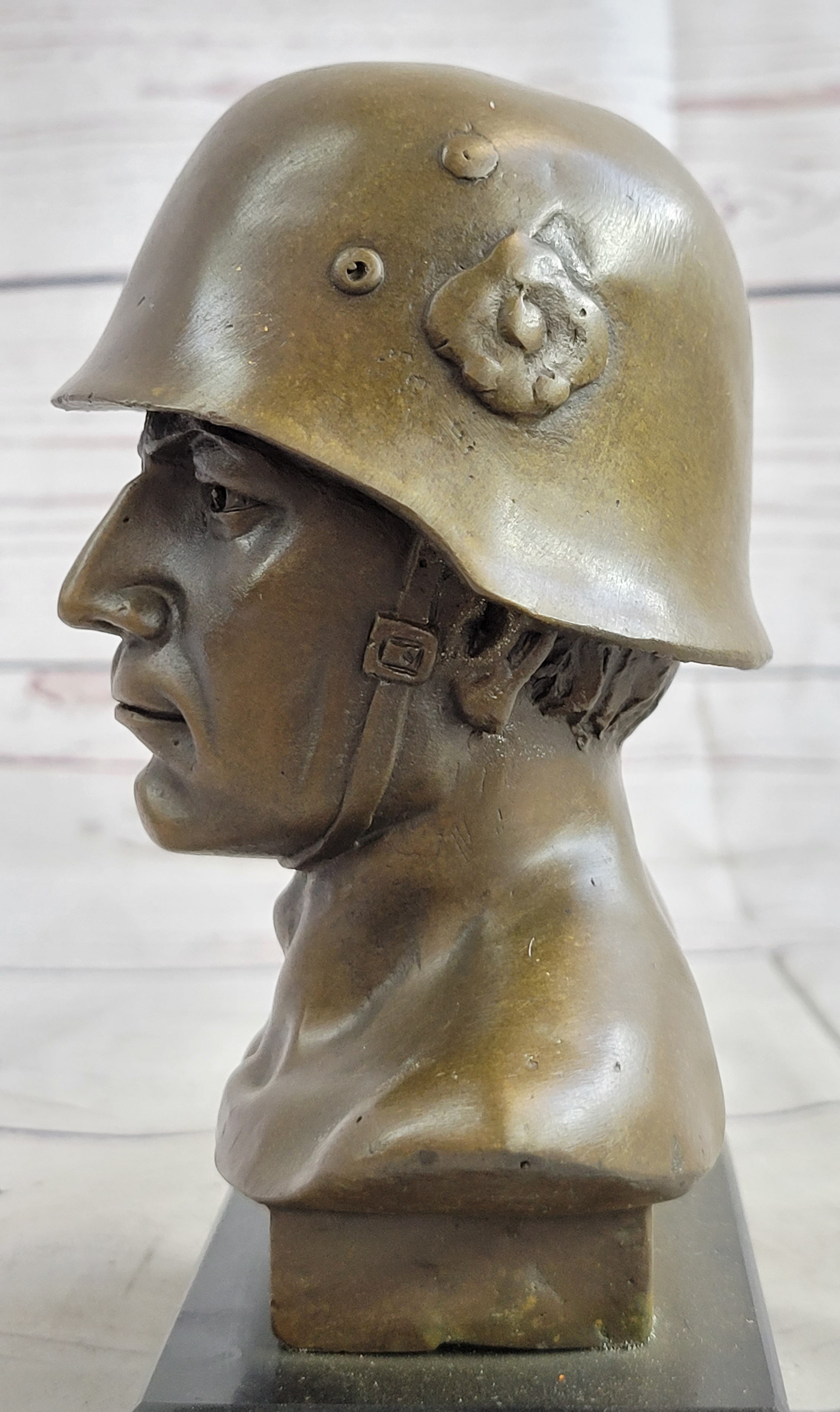 Crafted with meticulous attention to detail, this bust sculpture is a testament to the artist's skill and dedication. The portrayal captures the essence of the unknown German soldier, showcasing the resolute demeanor and valor that have characterized the country's military history. Handmade with unwavering precision, this sculpture is rendered in 100% bronze and is a testament to both the artisan's craftsmanship and the soldier's legacy.