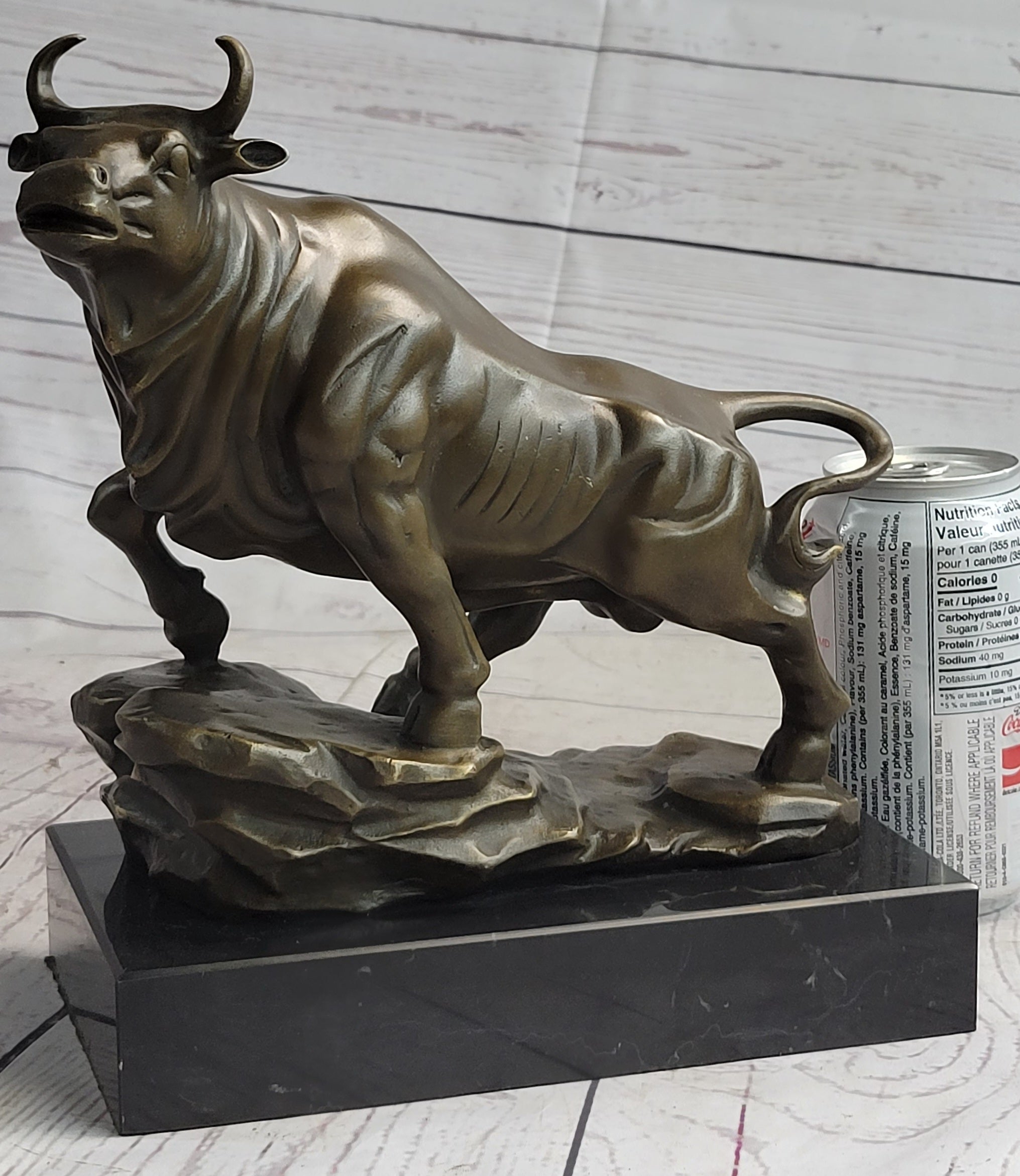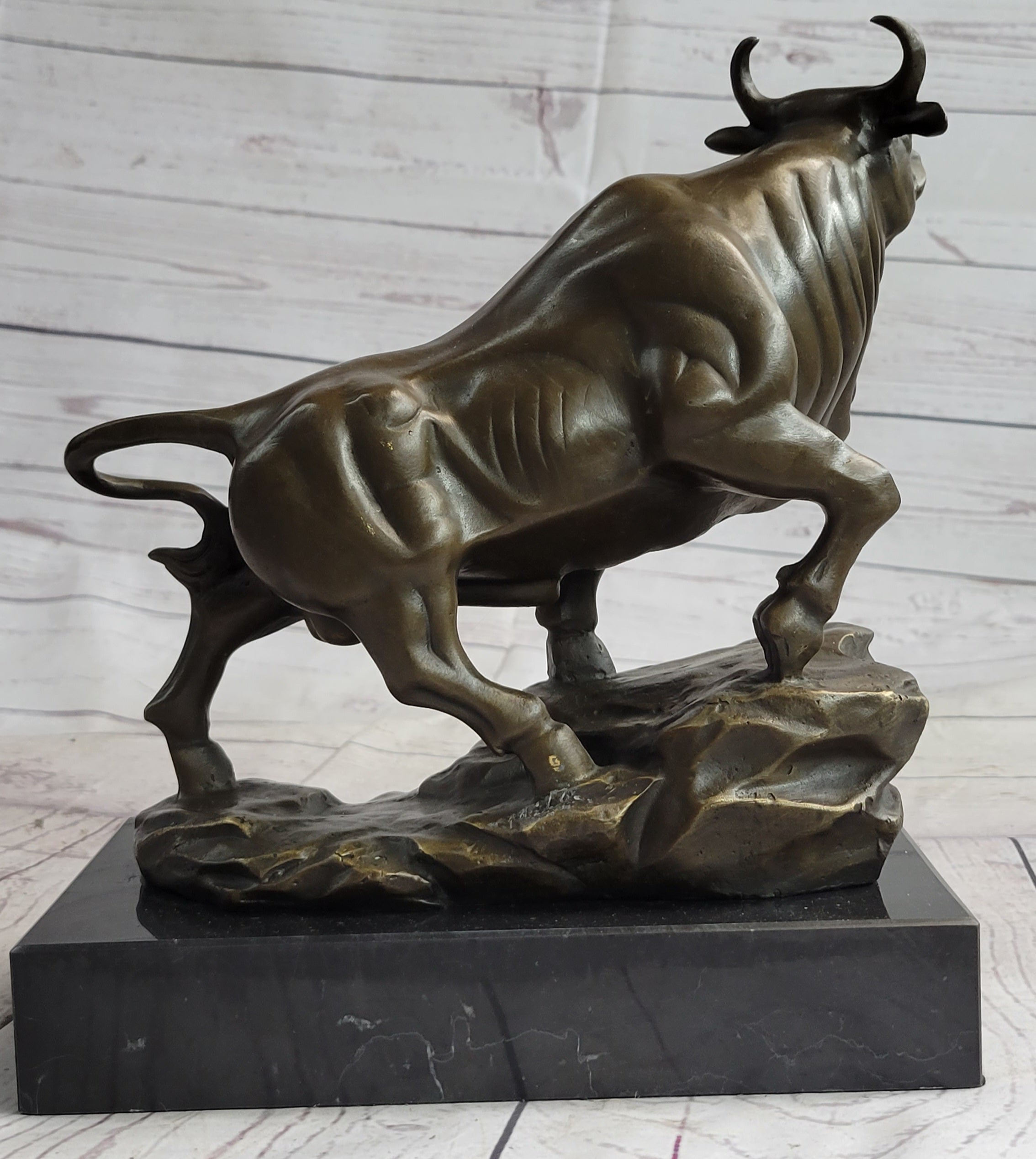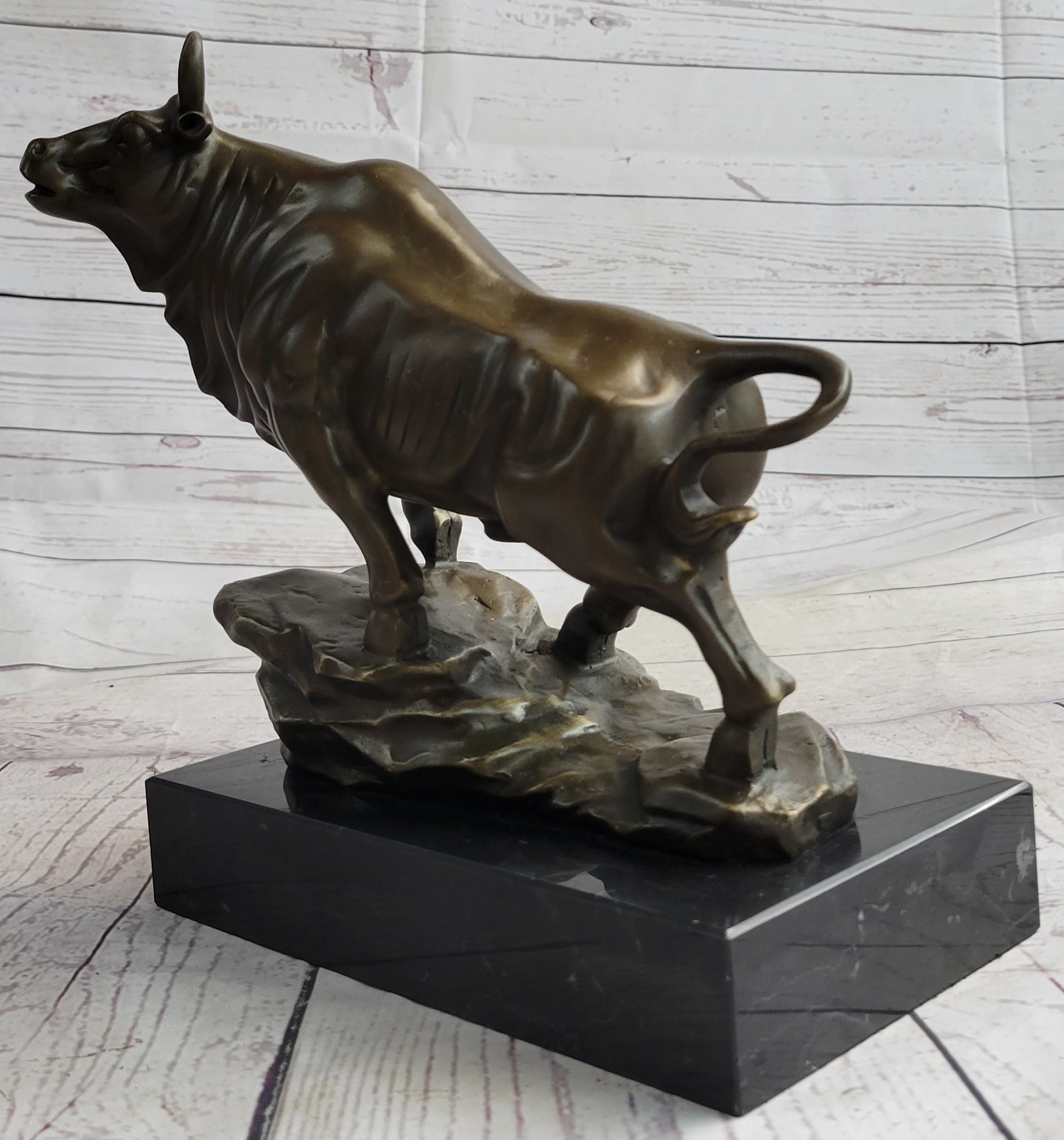 Prepare to be captivated by the sheer power and elegance of this bronze sculpture. As he starts in a gentle trot, this magnificent bull gradually gathers momentum, propelling himself forward with unwavering determination. Every detail of his majestic form exudes an air of attentiveness and alertness. His sharp horns serve as a testament to his readiness to charge, while his lifted tail, attentive ears, and serious facial expression reflect his focused intent.