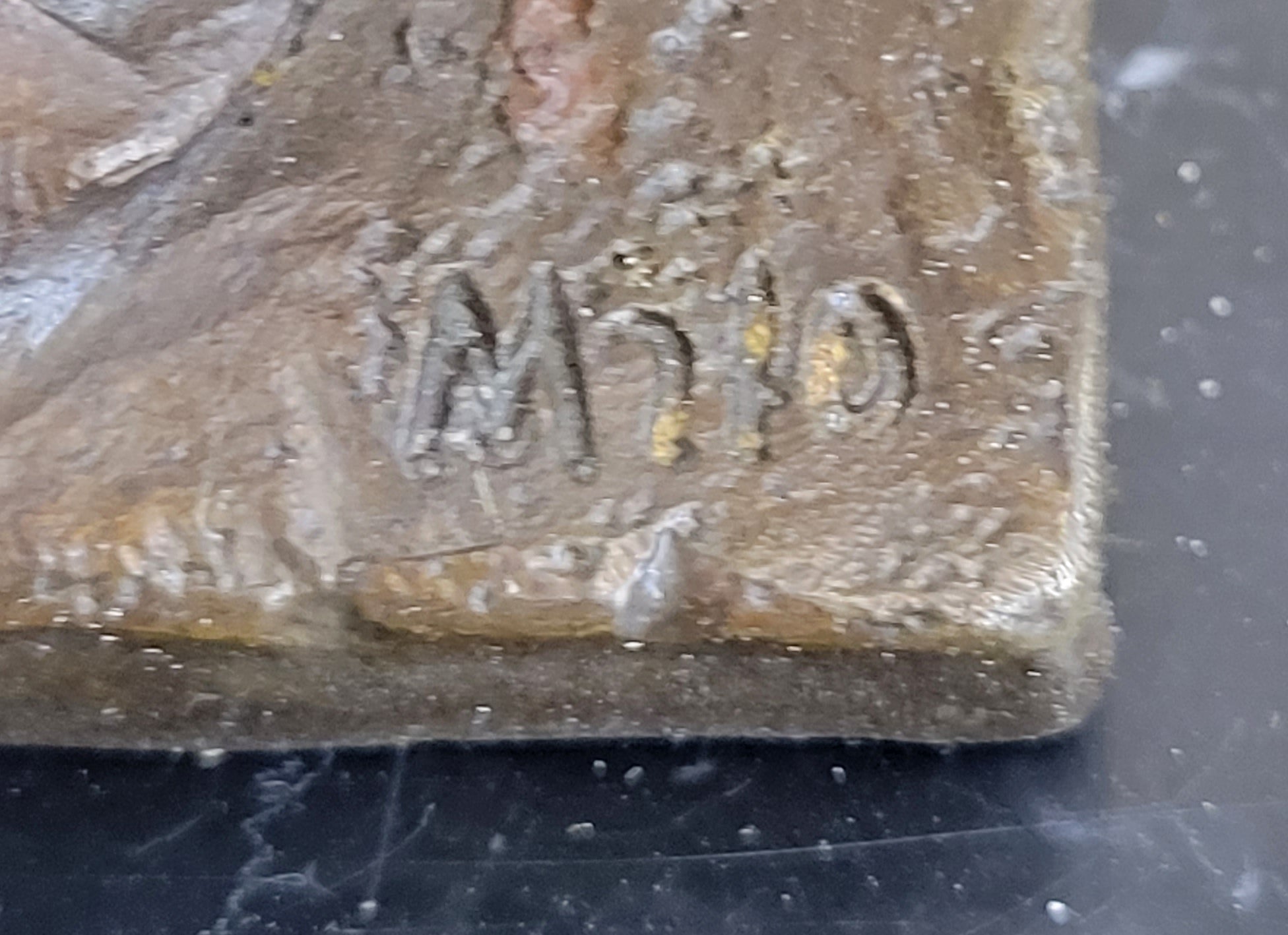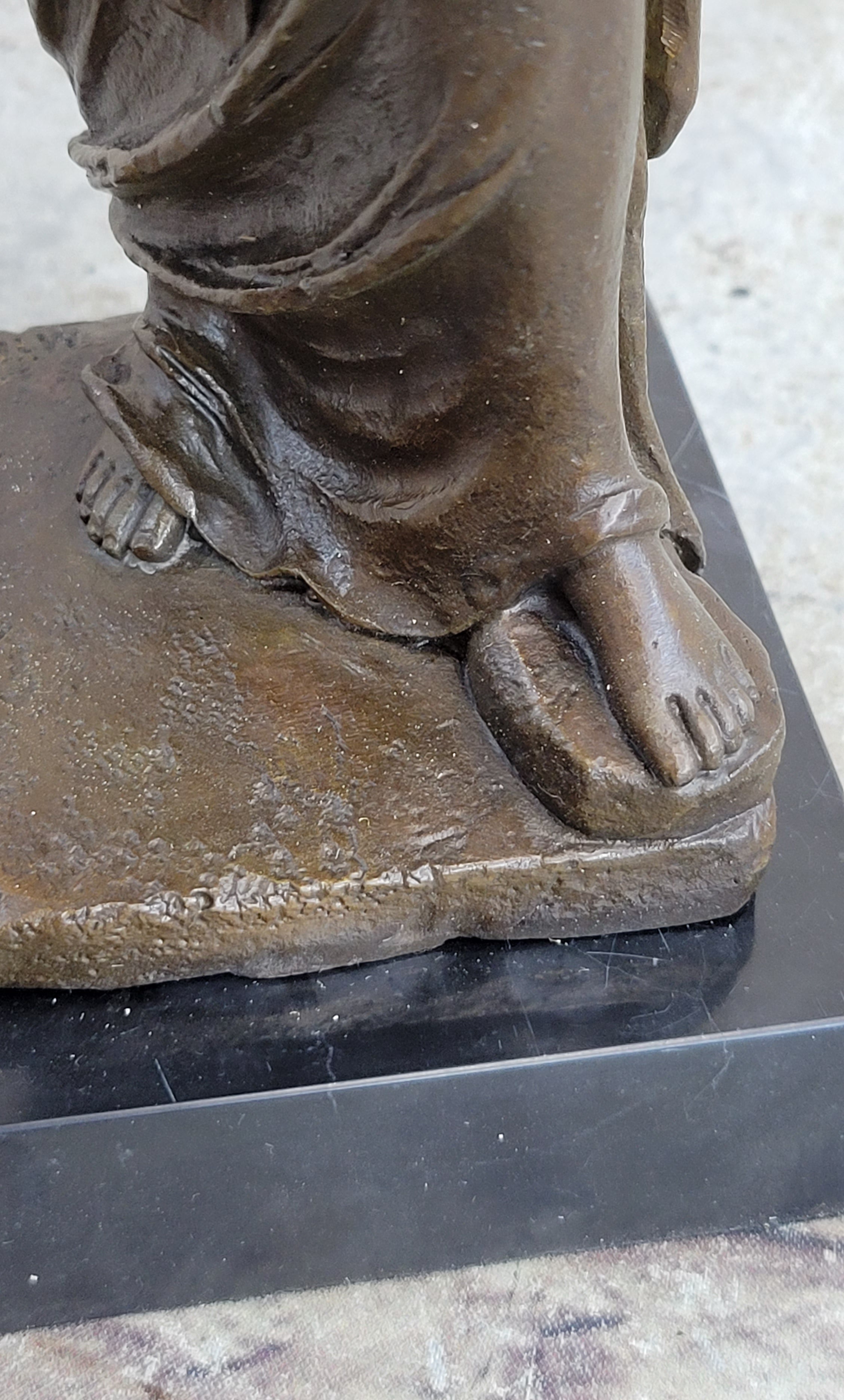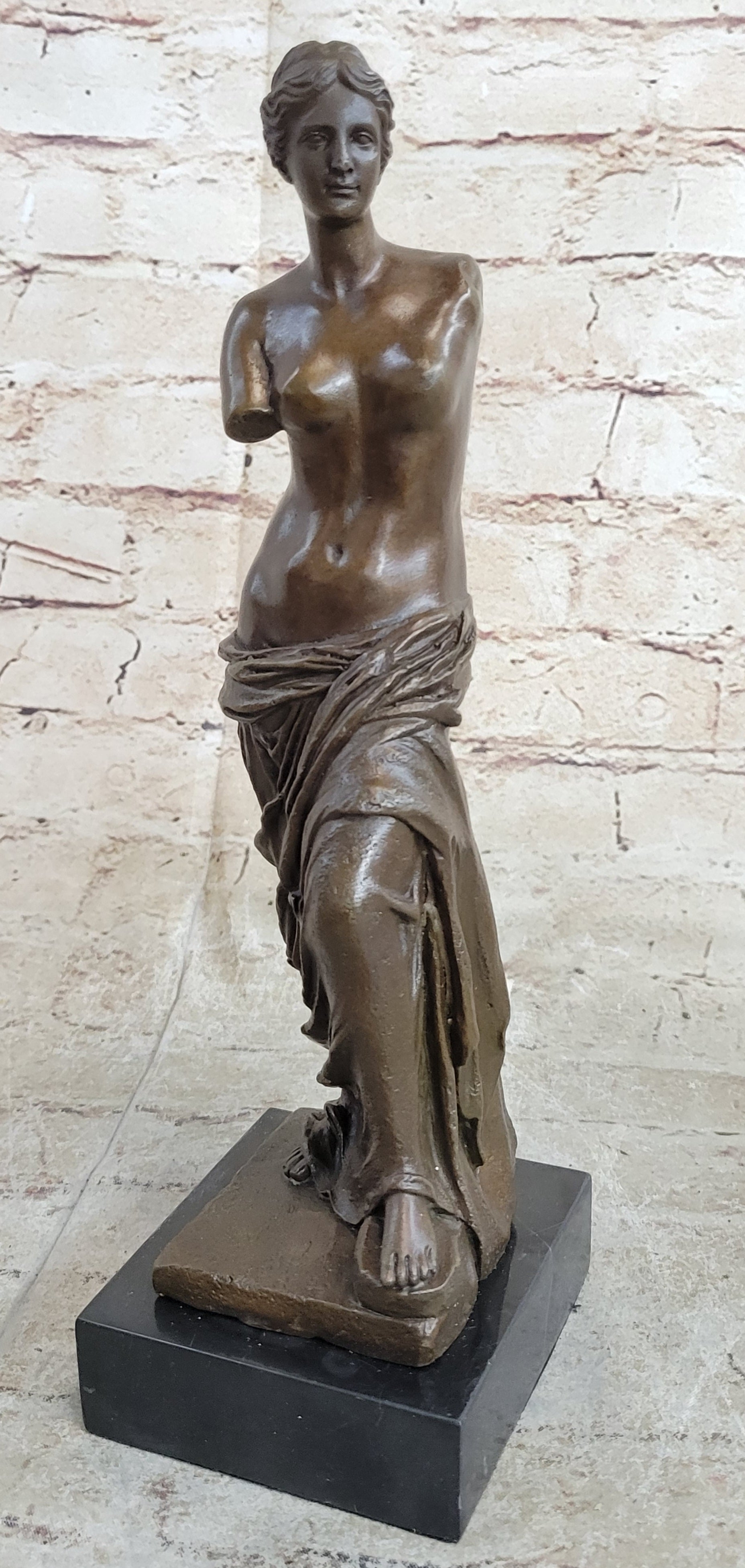 “Venus de Milo” highly acclaimed sculpture. The story behind this popular piece is that it was created in 150 B.C. and discovered in 1820. The original piece had two arms. Now, this distinct difference is the sculptures defining attribute. The woman stands half-nude with her garments draped over her lower body. Her abdomen is defined and chest is bare. Owning this piece will allow you to own a piece of art history. The original is housed at the Louvre in Paris. This bronze sculpture was created using the lost wax method. It stands on a black marble base and is signed Milo.Bronze Dimensions with Marble Base :Height 12" x Width 4"