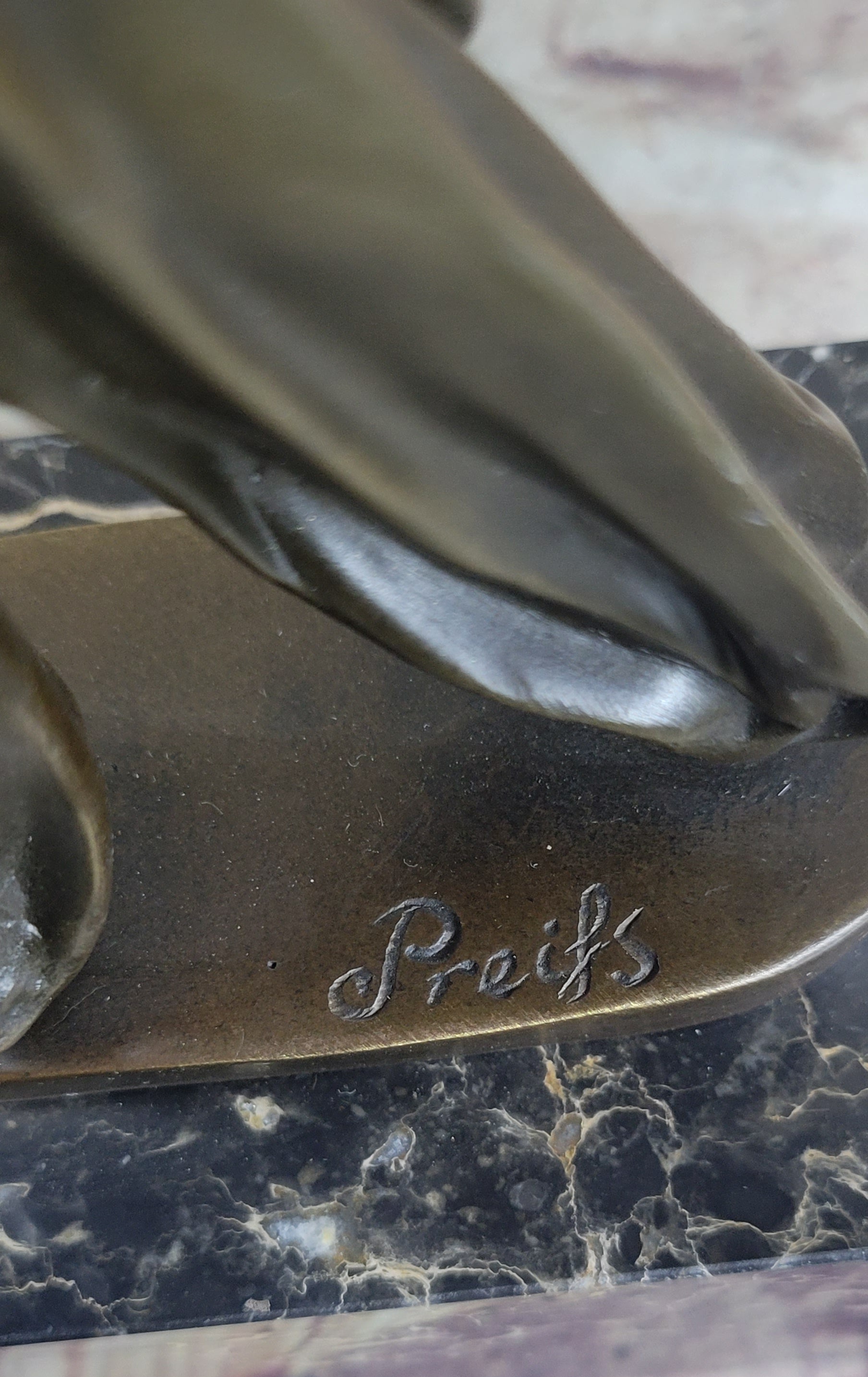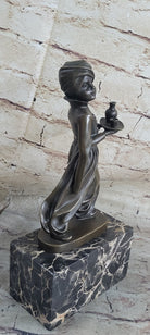 Signed by the artist Preiss, this piece stands as a testament to exquisite craftsmanship and artistic excellence. It is not only a beautiful decorative piece but also a celebration of cultural heritage and traditional artistry. Perfect for collectors and admirers of fine art, this sculpture brings a piece of history and artistry into any space it graces.Bronze Dimensions with Marble Base: Height 10" X Width 5"