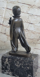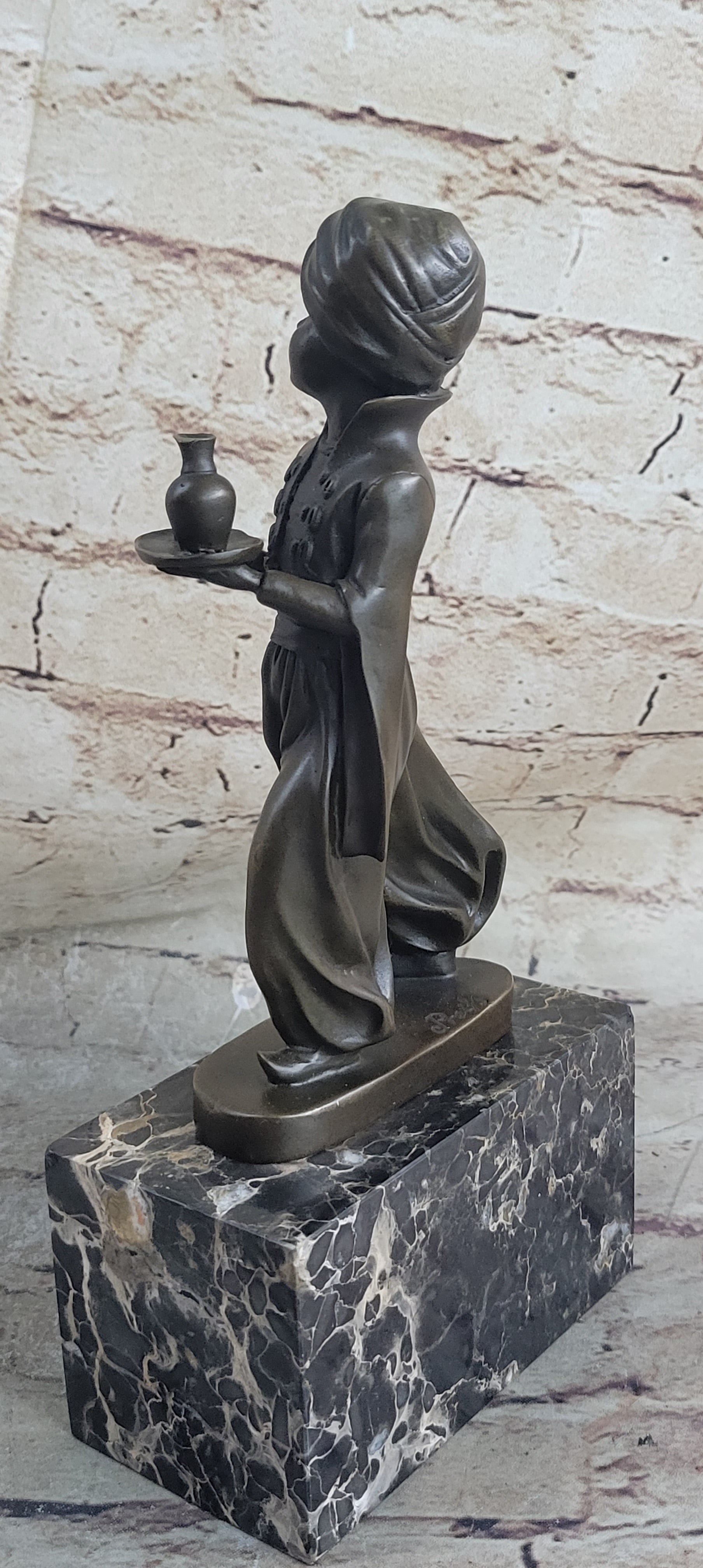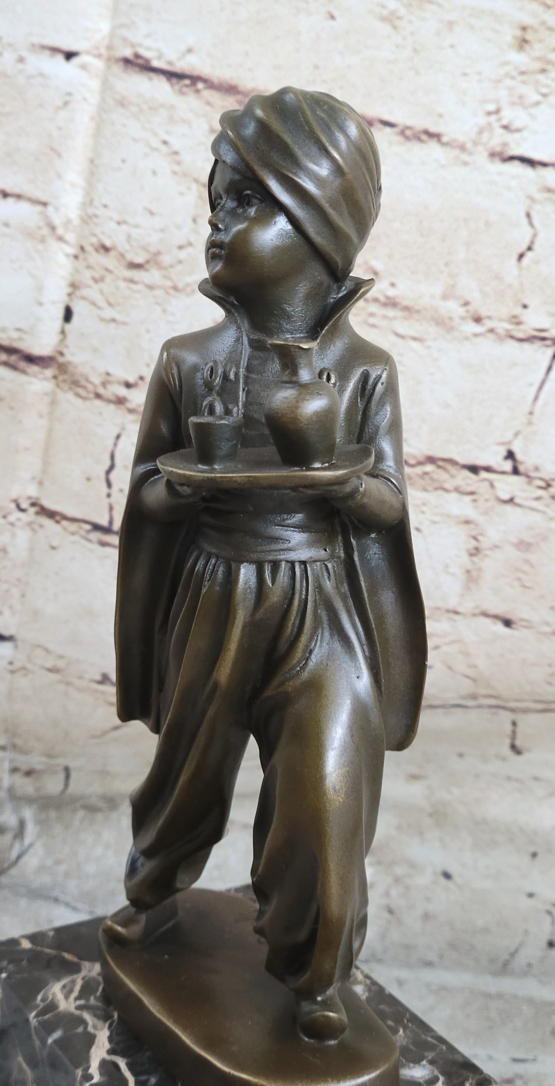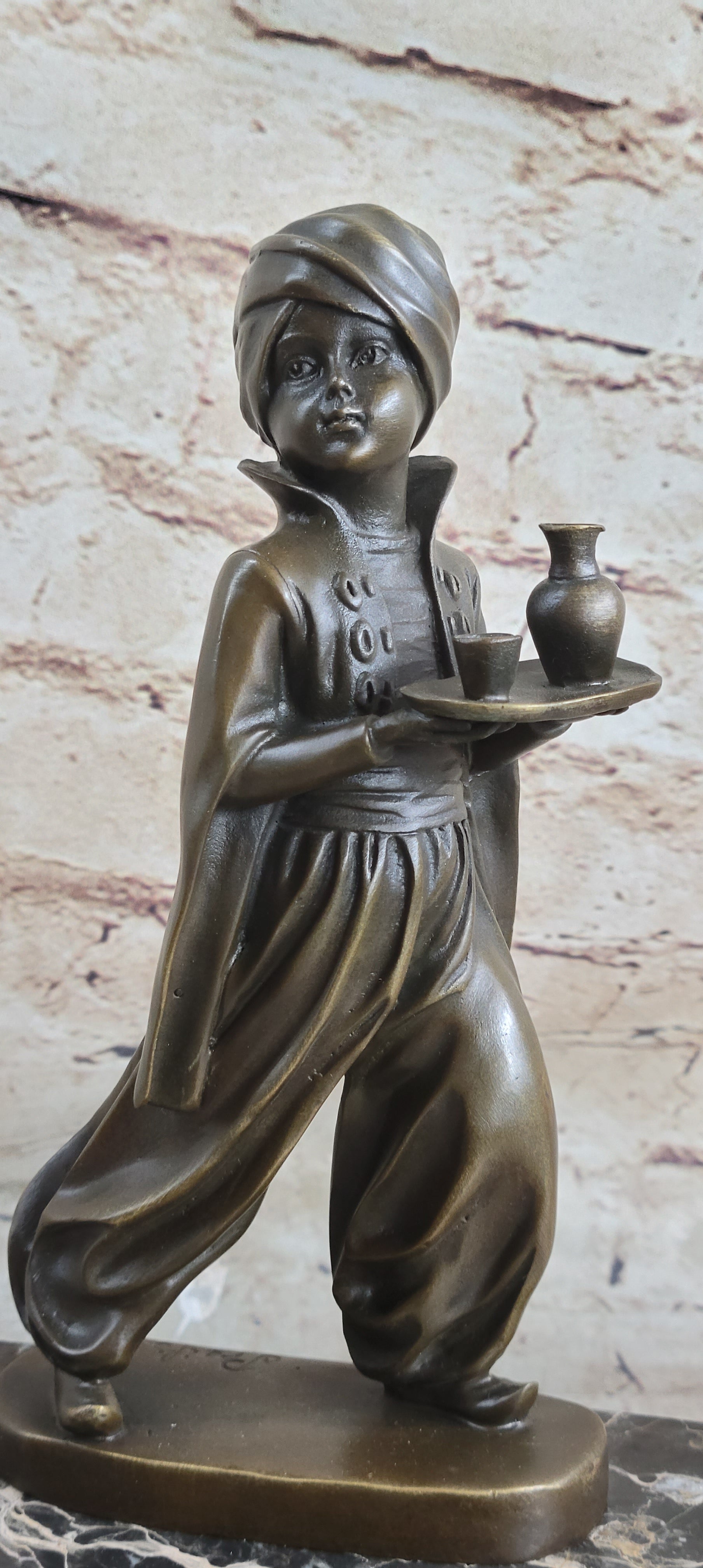 This charming sculpture captures the innocence and dedication of a young Arabian boy serving in a grand palace. He carries a small tray with a round bottle, ready to quench his master's thirst. His hair is wrapped in a turban, and he is dressed in a loose jumpsuit, reflecting the traditional attire. The boy's innocent smile and composed demeanor as he navigates through a crowd of adults are masterfully depicted, adding a touch of warmth and humanity to the piece.