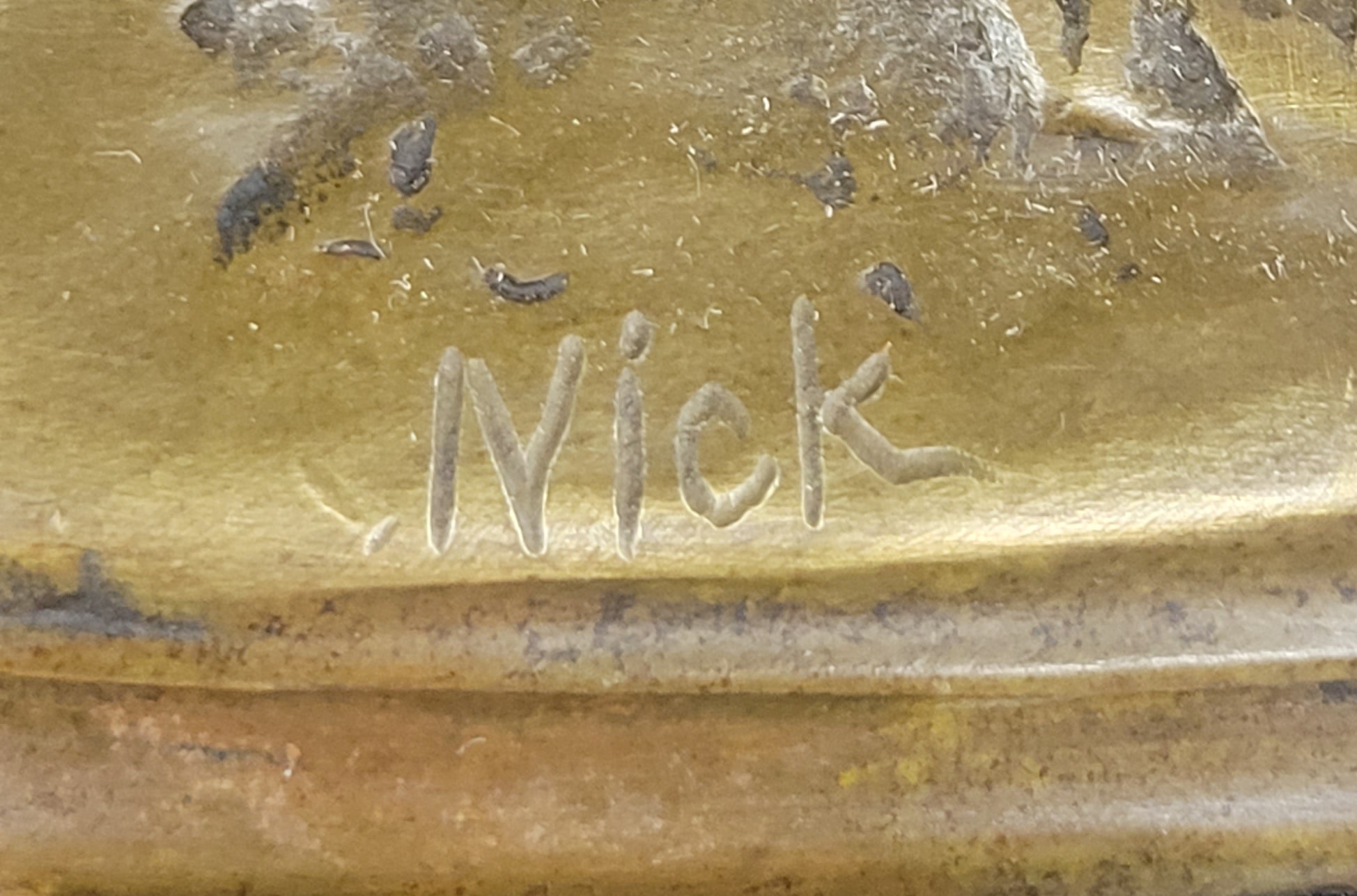 The base of the sculpture features a grassy patch, indicating the mare's presence in a natural and serene field. Crafted using the "Lost Wax Method," this bronze sculpture showcases the artist's commitment to capturing the grace and beauty of the subject. The brown patina enhances the textures and details, adding depth and realism to the artwork. This 100% bronze creation is a handmade masterpiece and is signed by the artist Nick, adding a personal touch to its authenticity.