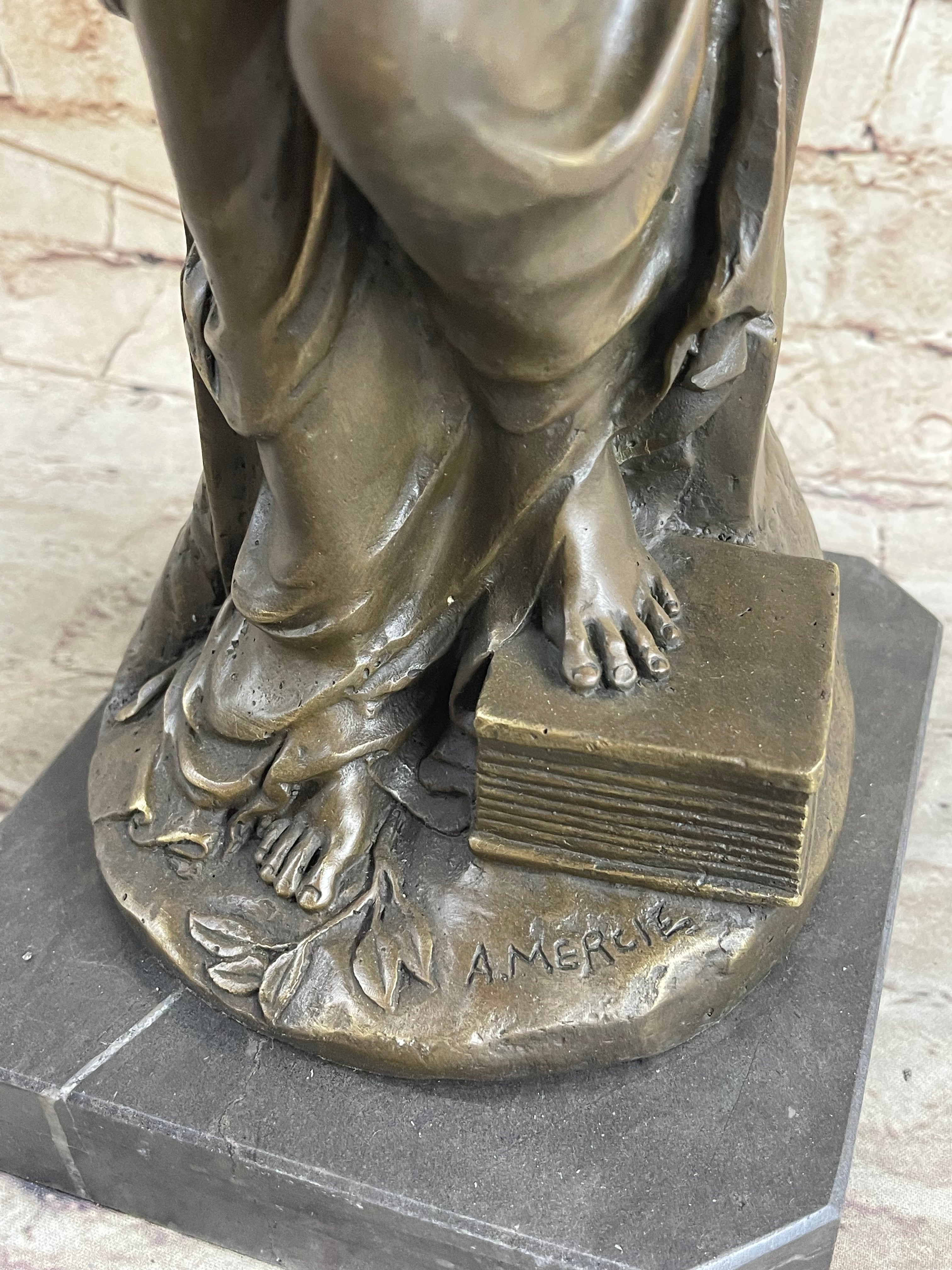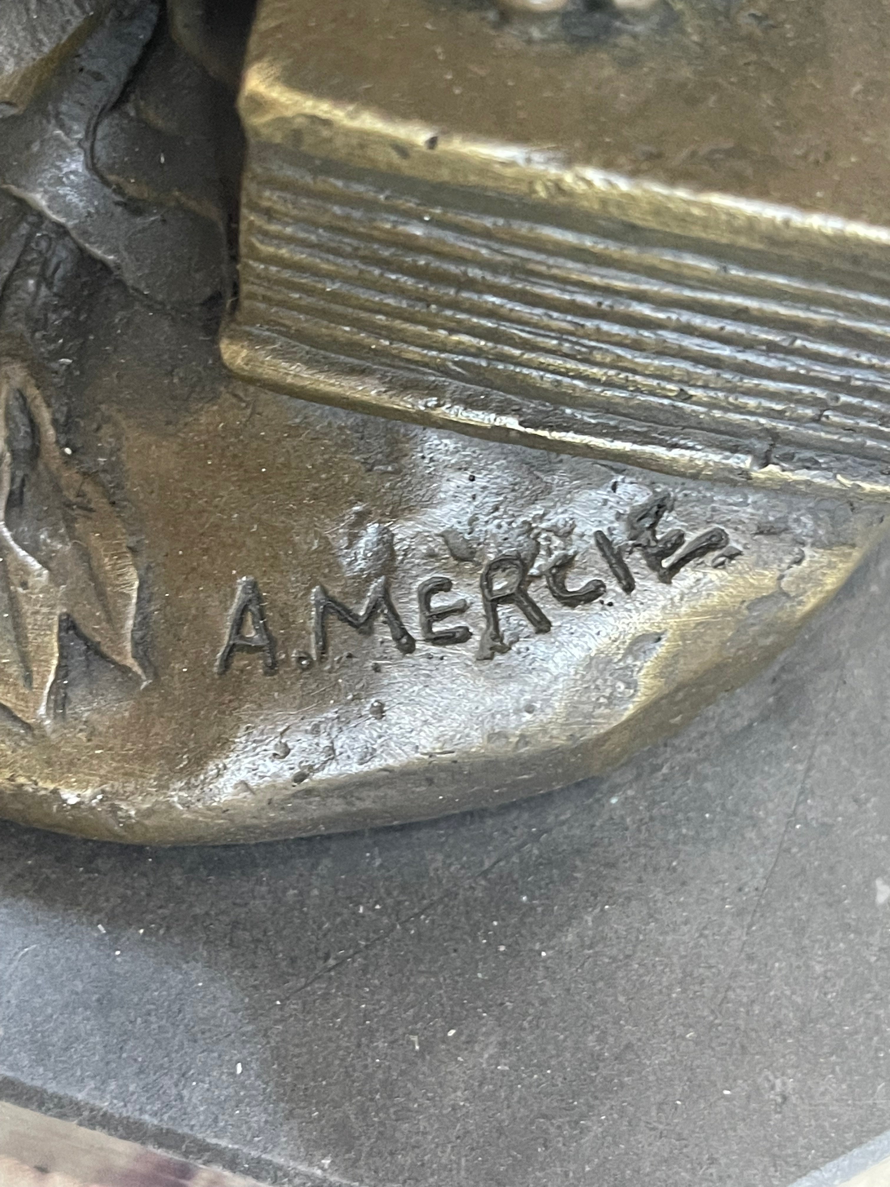 Poised upon a black variegated marble base, this divine masterpiece stands as a testament to its exceptional quality and craftsmanship. The European Bronze Finery stamp of quality, along with the artist Mercie's signature.