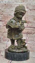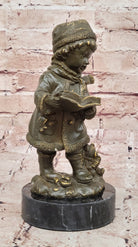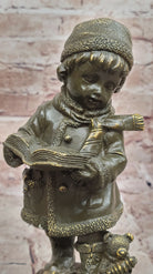 This heartwarming genuine bronze sculpture, signed by J. Patoue, captures a quiet and tender moment of childhood—a young boy dressed in winter clothing, deeply engrossed in reading a book. Wrapped in a cozy jacket and winter hat, he exudes a sense of warmth and innocence, embodying the stillness and curiosity that accompany a peaceful winter day. The sculpture beautifully reflects the joy of solitude and the timeless wonder found in reading.