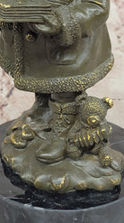Expertly hand crafted using the traditional lost wax method, this detailed bronze piece showcases the artist’s dedication to realism and emotion. The sculpture is finished with a rich brown patina, enhancing the depth and lifelike texture of the clothing, facial features, and posture. It rests on a polished round black marble base, adding elegance and stability to the presentation.