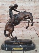 Mounted on a sleek black marble base, the sculpture exudes elegance while providing a stable foundation. The base proudly bears the signature of the esteemed artist Frederic Remington, serving as a testament to its quality and artistic significance.
