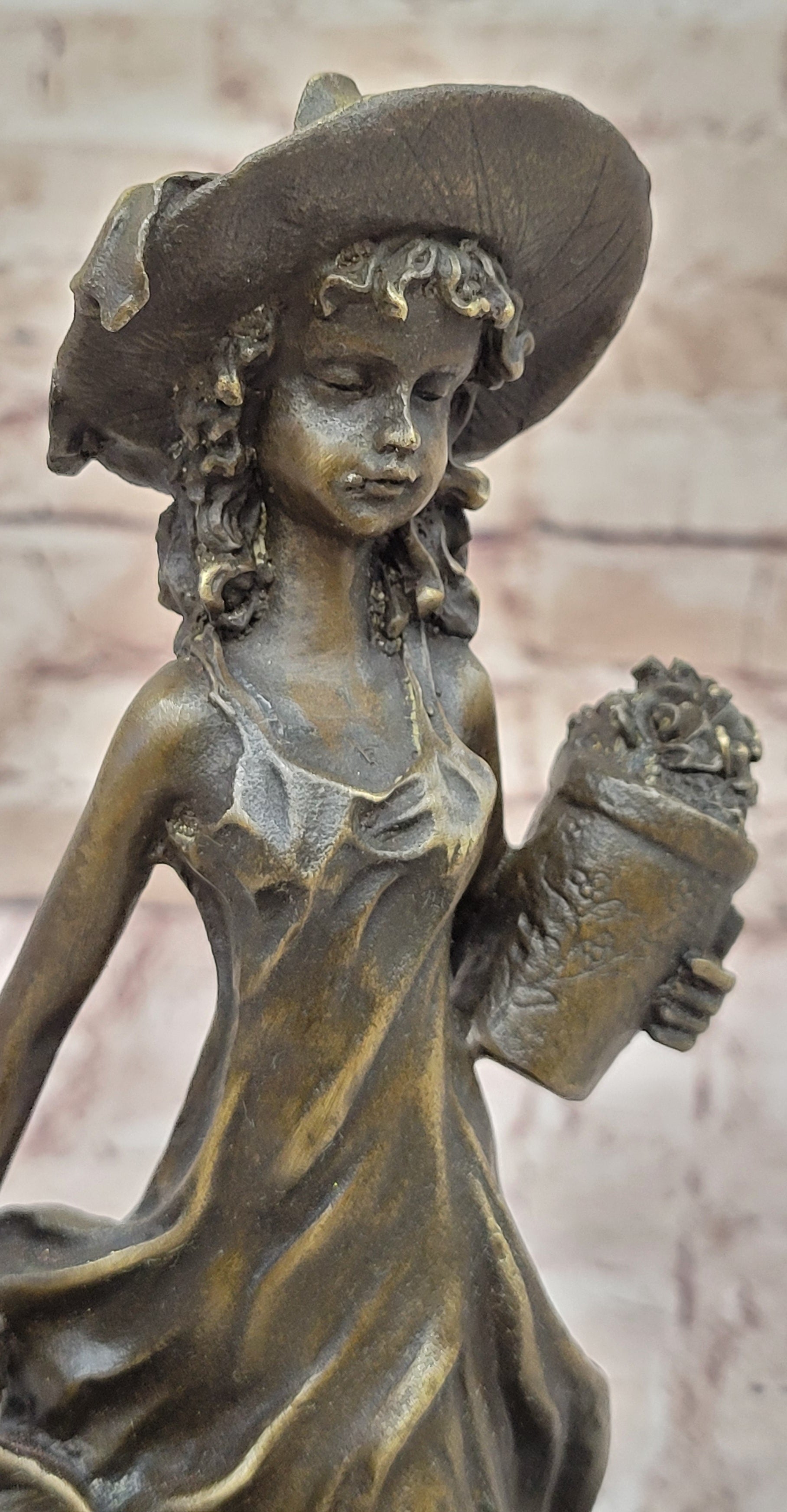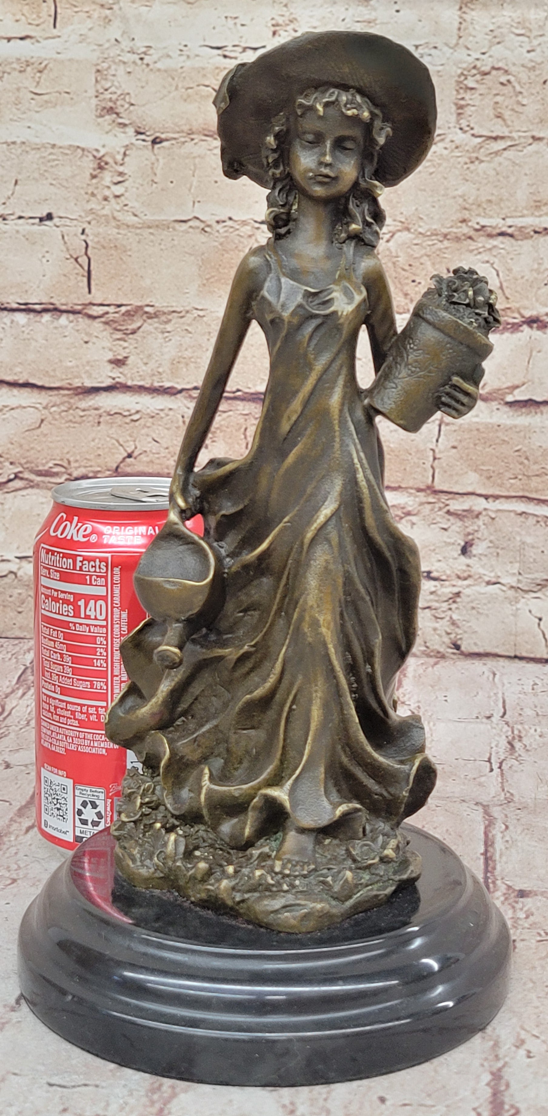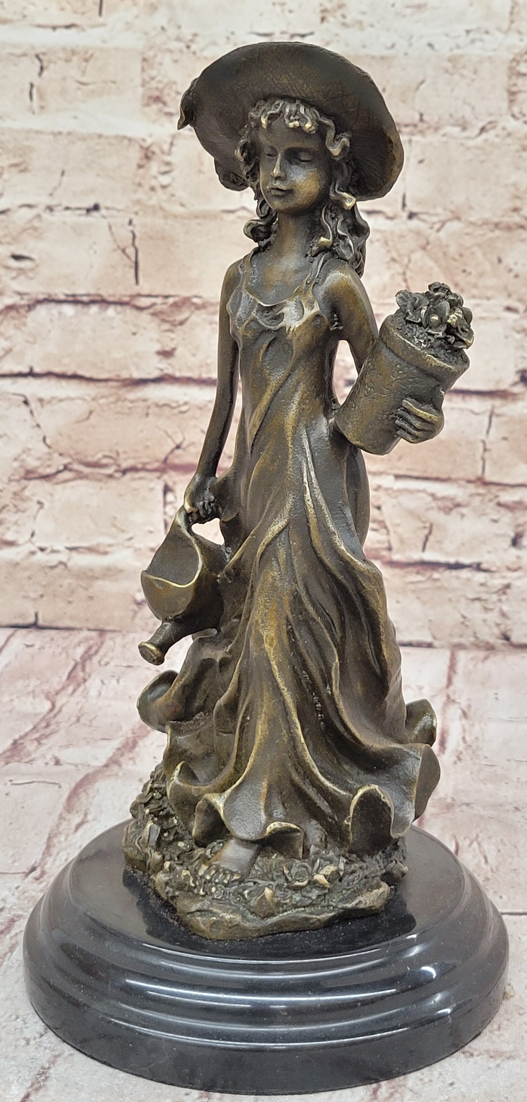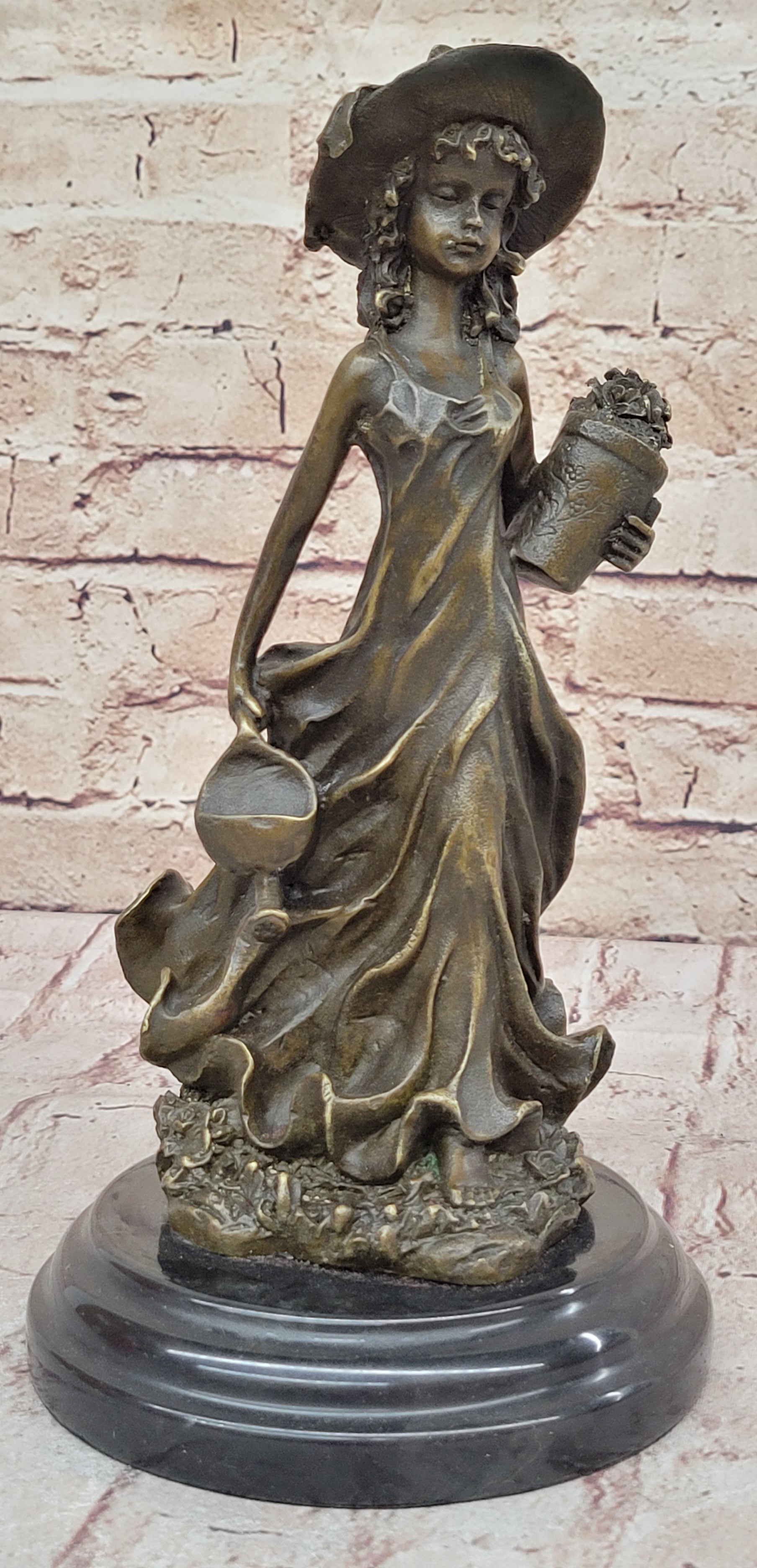 Capturing a serene moment in the garden, this exquisite bronze sculpture portrays a young girl tending to her plants with care and devotion. The artist, Jean Patoue, skillfully conveys the innocence and tranquility of the scene, from the flowing lines of the girl's sundress to the gentle sway of her oversized sun hat in the breeze. With meticulous attention to detail, the sculpture brings to life the simple joys of gardening on a peaceful morning. Created using the time-honored lost-wax casting method, this sculpture is a testament to both artistic craftsmanship and enduring beauty. The brown patina finish adds depth and warmth to the piece, enhancing its lifelike quality and preserving its delicate features for generations to come. Mounted on a sleek black marble base, it exudes sophistication and elegance, making it a captivating addition to any indoor or outdoor space. Whether displayed in a garden, on a patio, or as a centerpiece in a living room, this charming sculpture invites contemplation and appreciation of life's simple pleasures. It serves as a poignant reminder of the beauty that surrounds us, encouraging us to pause, breathe, and reconnect with nature in our busy lives.