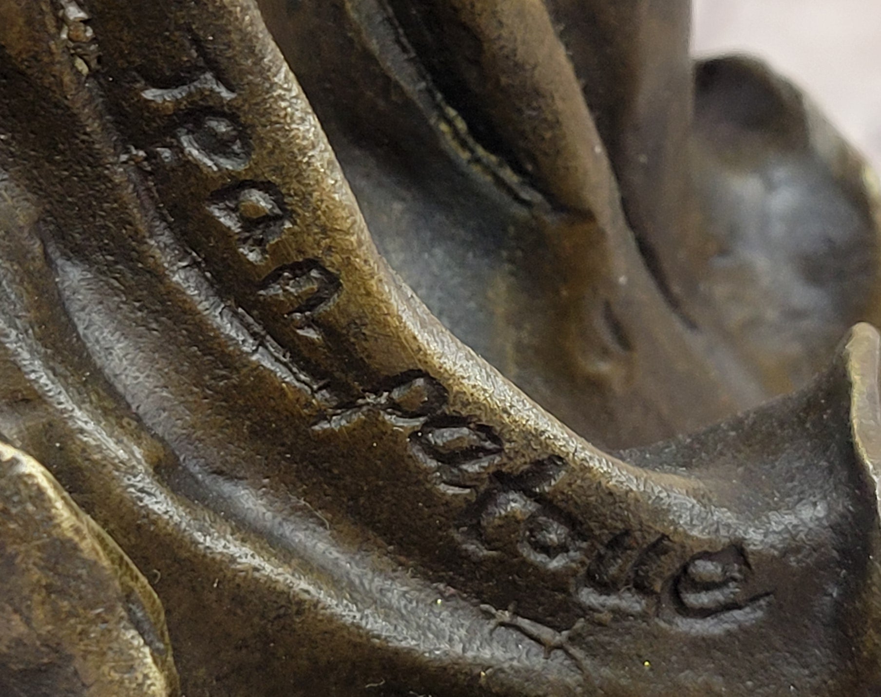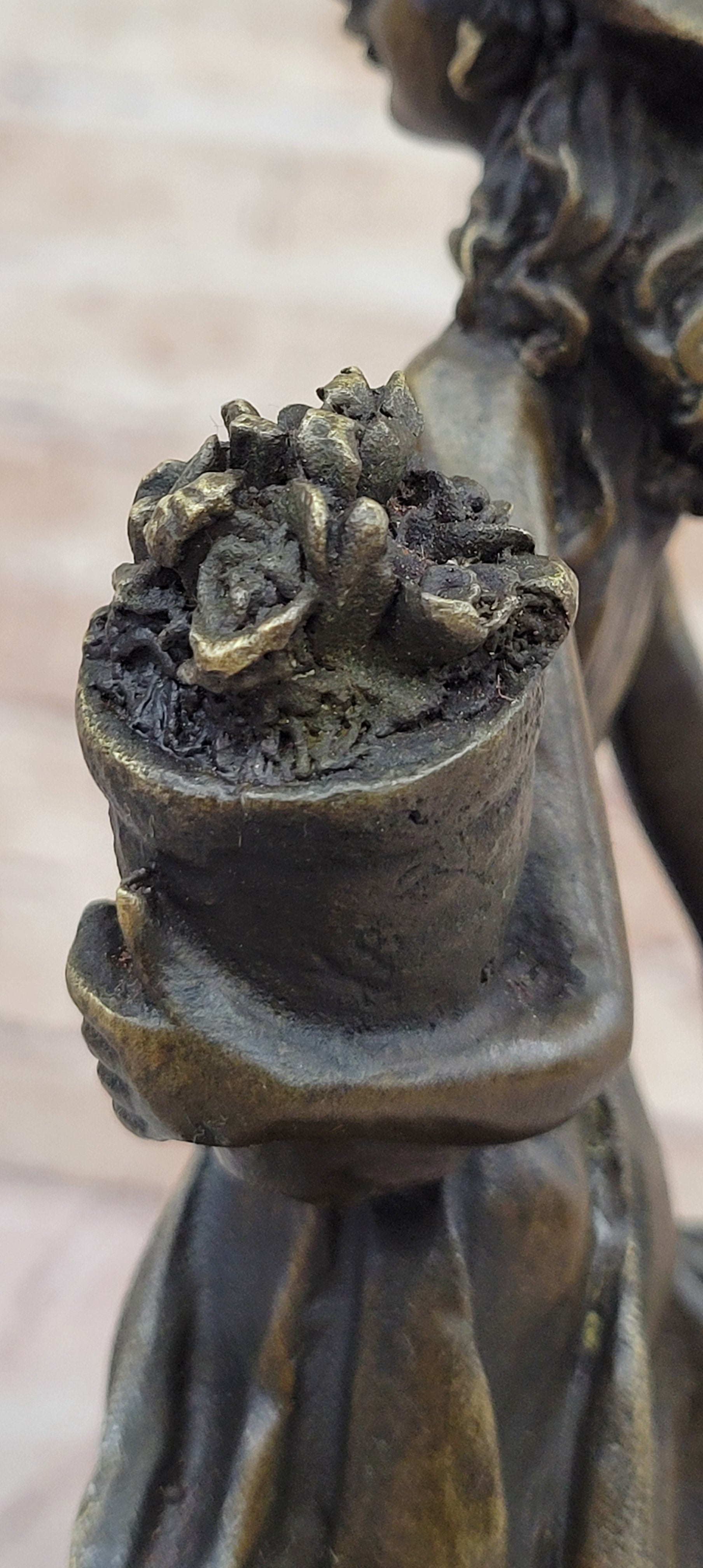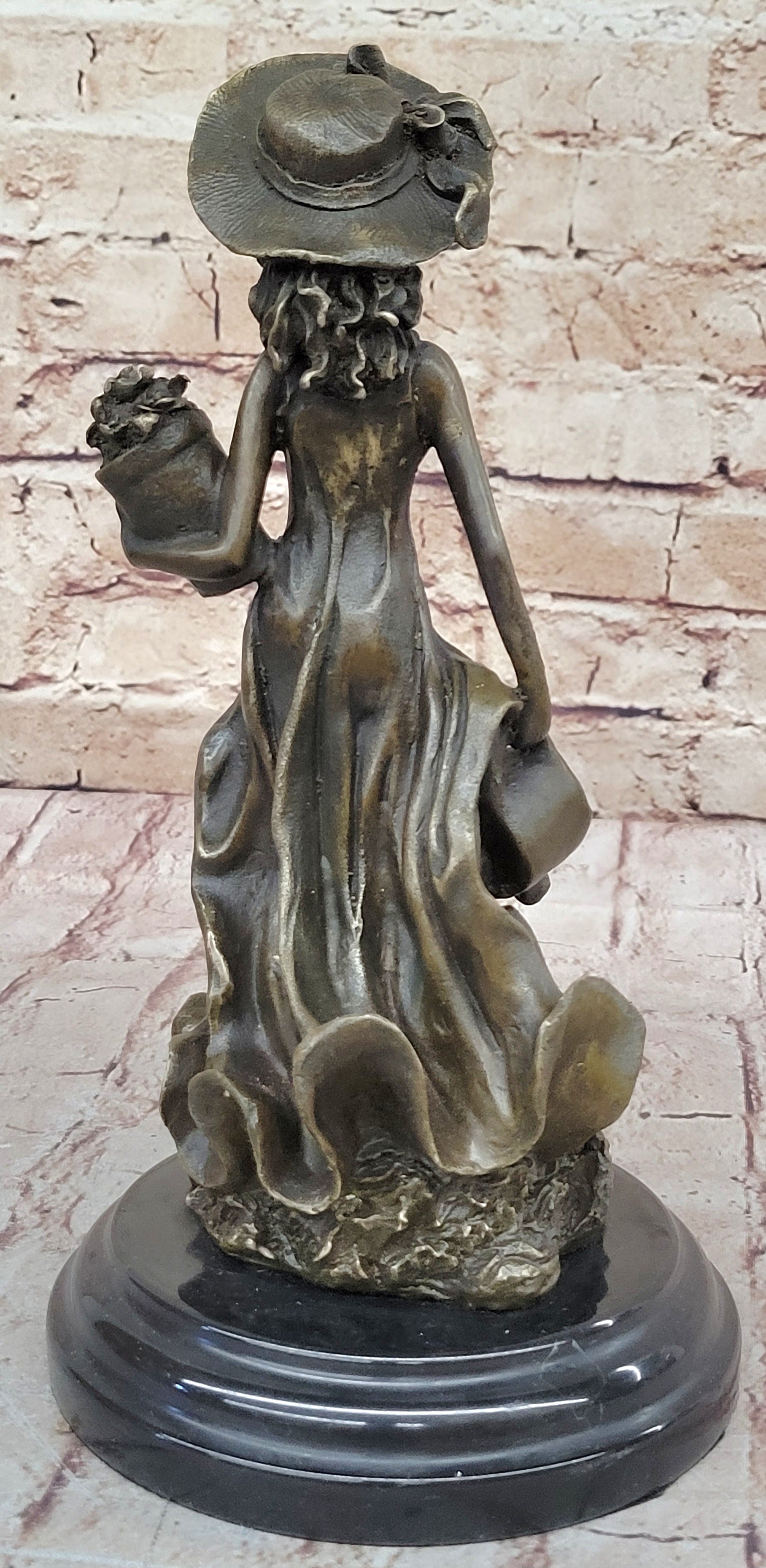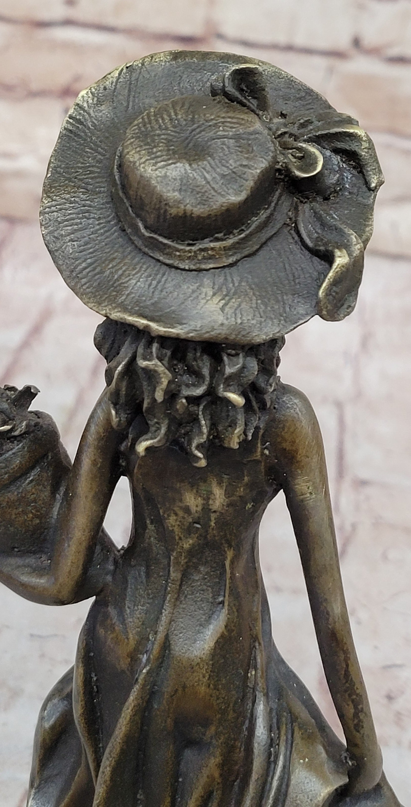 Capturing a serene moment in the garden, this exquisite bronze sculpture portrays a young girl tending to her plants with care and devotion. The artist, Jean Patoue, skillfully conveys the innocence and tranquility of the scene, from the flowing lines of the girl's sundress to the gentle sway of her oversized sun hat in the breeze. With meticulous attention to detail, the sculpture brings to life the simple joys of gardening on a peaceful morning. Created using the time-honored lost-wax casting method, this sculpture is a testament to both artistic craftsmanship and enduring beauty. The brown patina finish adds depth and warmth to the piece, enhancing its lifelike quality and preserving its delicate features for generations to come. Mounted on a sleek black marble base, it exudes sophistication and elegance, making it a captivating addition to any indoor or outdoor space. Whether displayed in a garden, on a patio, or as a centerpiece in a living room, this charming sculpture invites contemplation and appreciation of life's simple pleasures. It serves as a poignant reminder of the beauty that surrounds us, encouraging us to pause, breathe, and reconnect with nature in our busy lives.