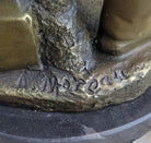 The bronze cherub-like figure stands in a contrapposto position. Lost in a moment and full of thought, his eyes fall downward, as he slowly drops the apple from his mouth. A fabric banner sinuates around his left leg demonstrating the application of the Classical sense into the composition. He was molded using the ancient method of lost-wax casting and finished with a brown patina stain for preservation. The sculpture is mounted upon a black marble base with the artist A. Moreau's signature.Bronze Dimensions with Marble Base: Height 13" X Width 5"