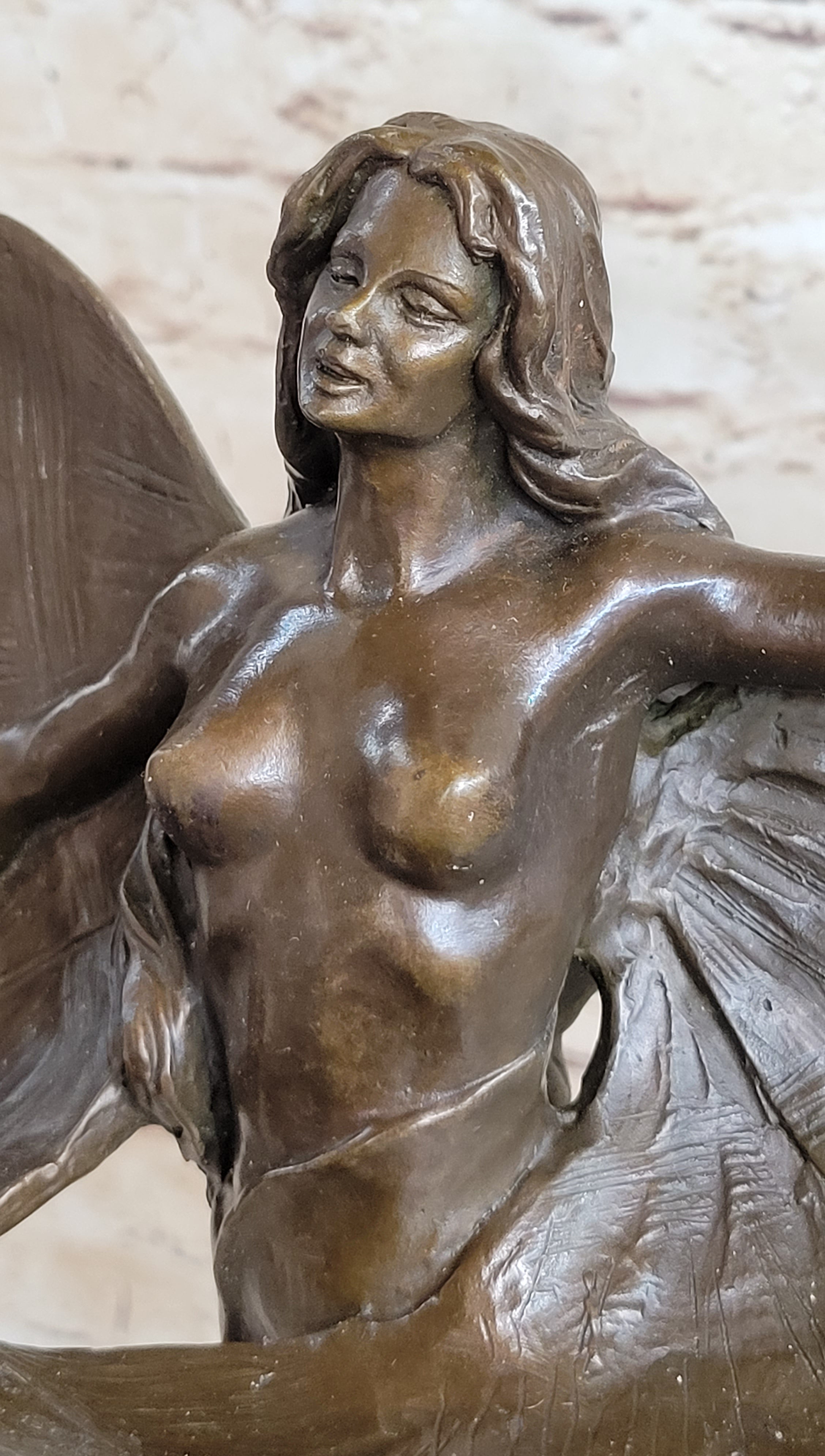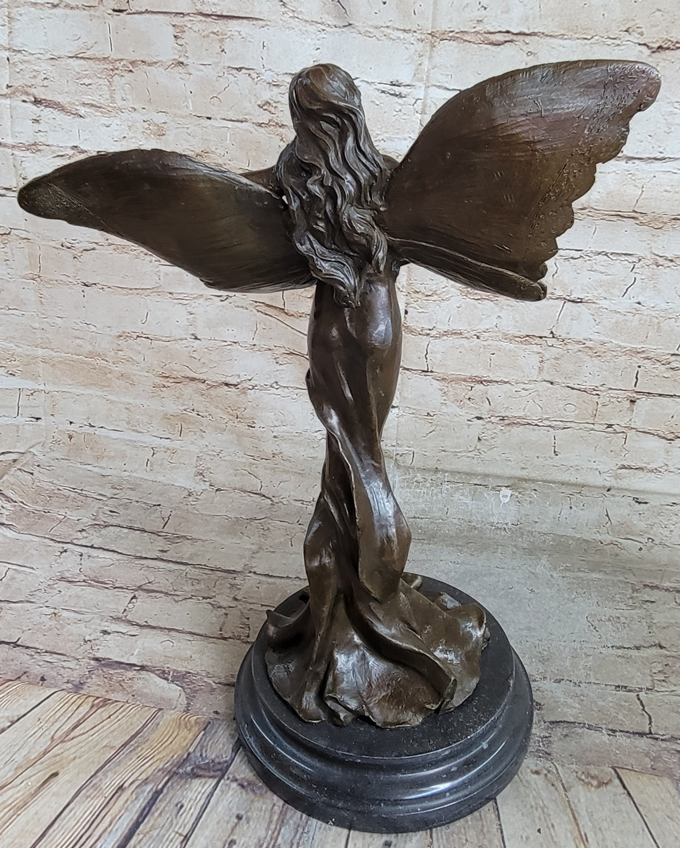 This elegant bronze figure portrays a beautiful nymph emerging gracefully from the earth, framed by two outspread butterfly wings, capturing the essence of enchantment and natural beauty. The vibrant deep brown patina enhances the allure of the sculpture, while the fine hand-chased surface detail adds depth and intricacy to the piece, highlighting the nymph's ethereal form.