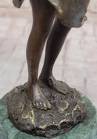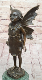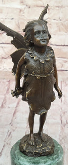 Young Child Girl Angel Fairy Winged Figure Bronze Sculpture on Green Marble Base