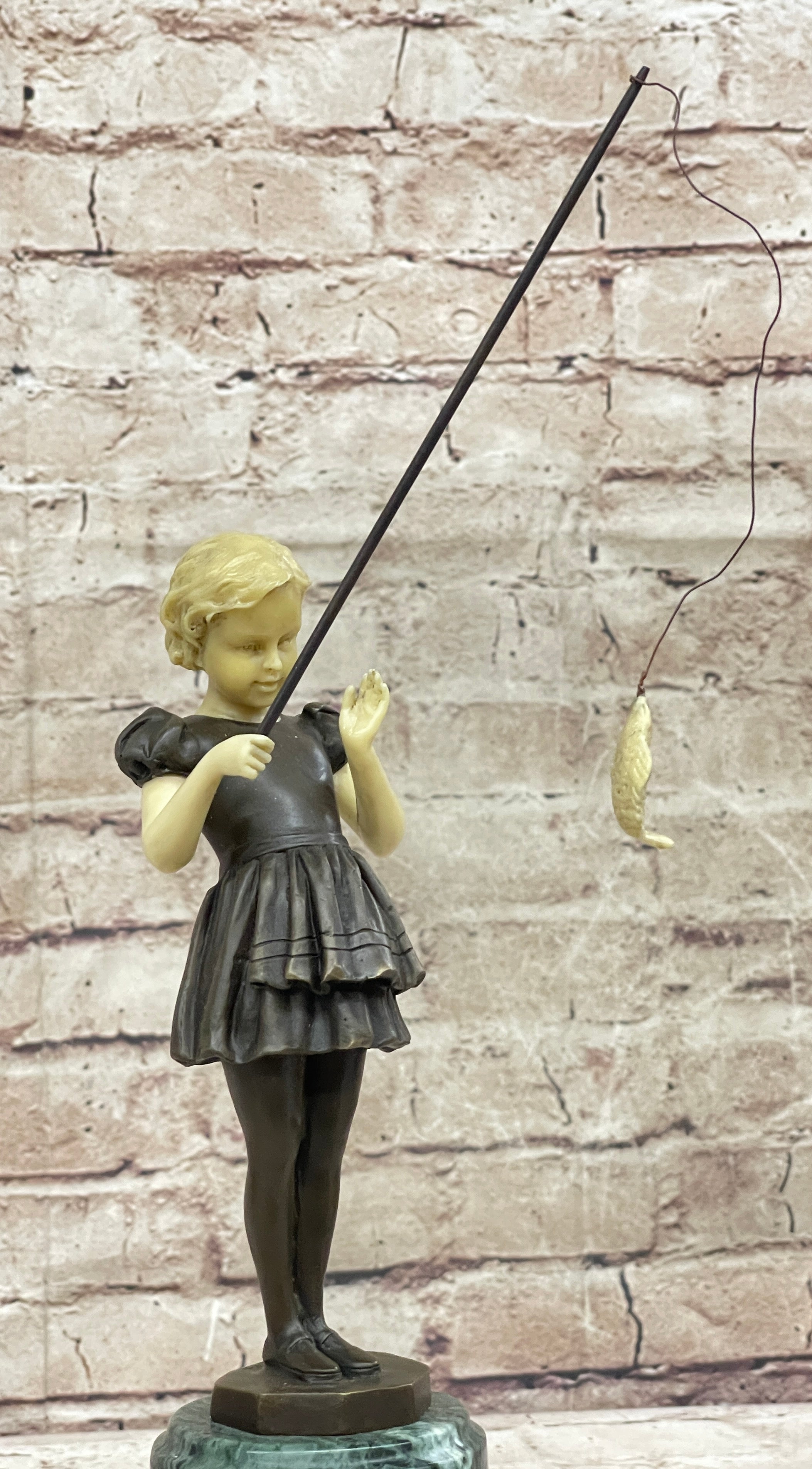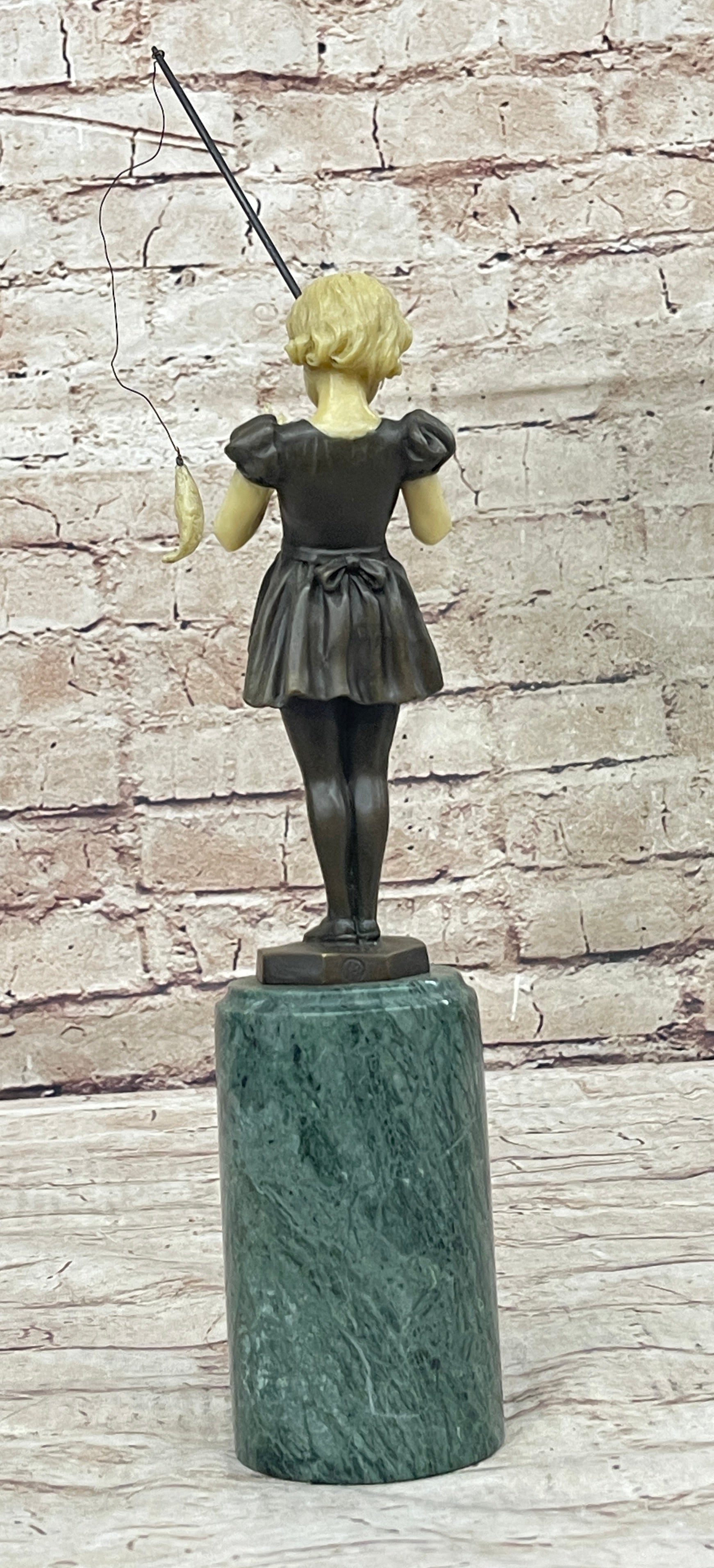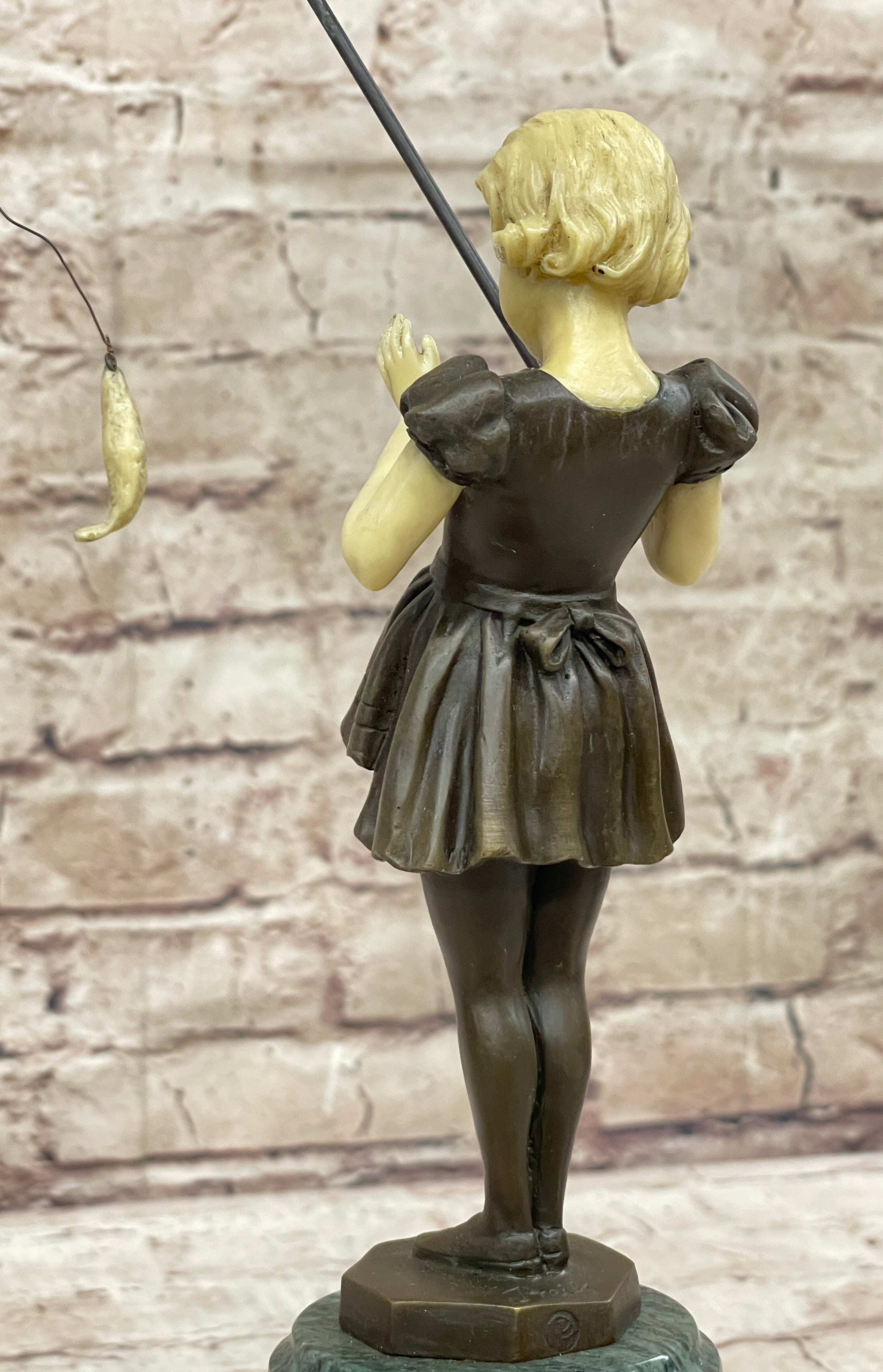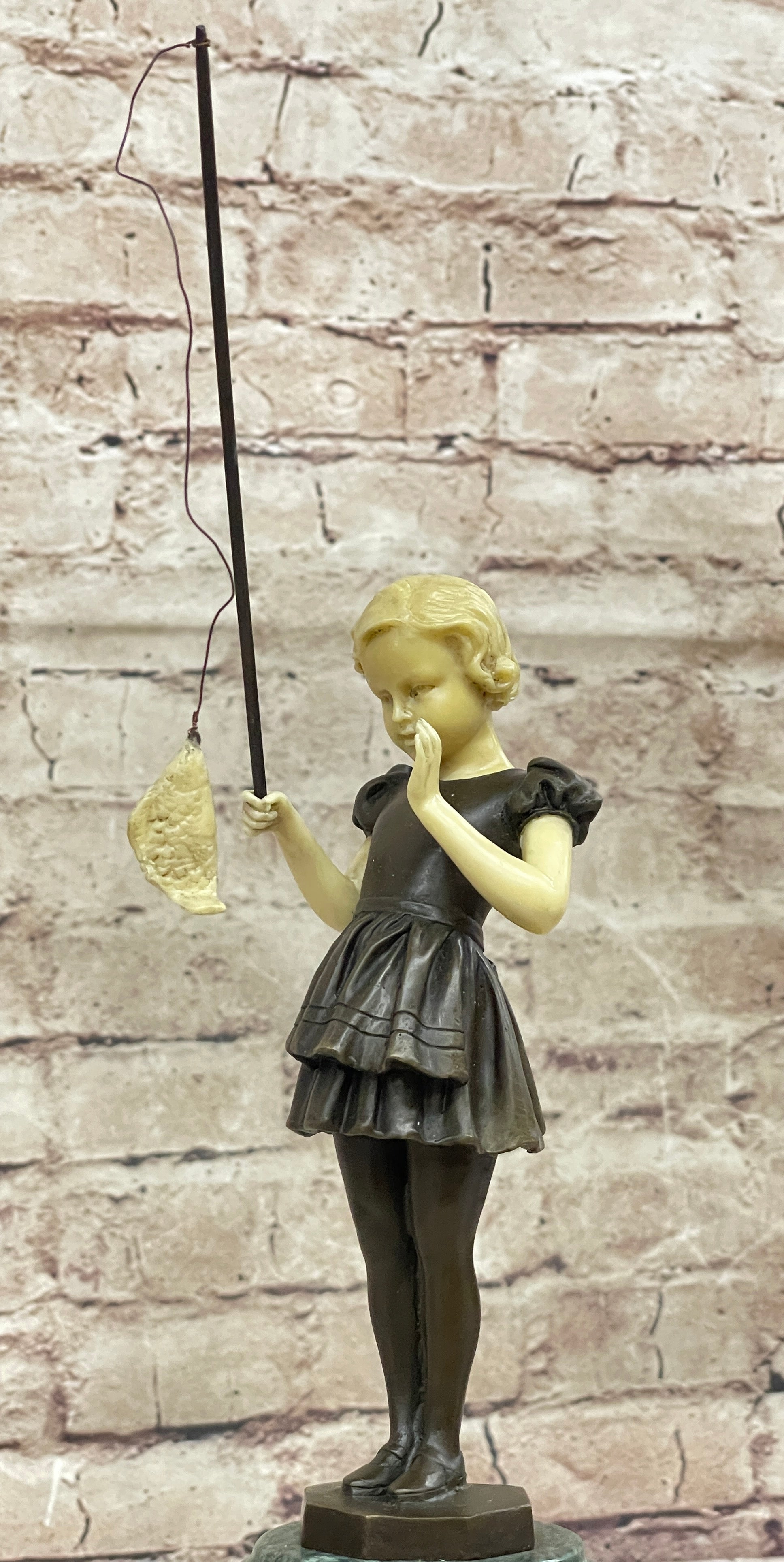 Young Girl Child Fishing Bronze Metal Statue Sculpture Figure on Marble Base