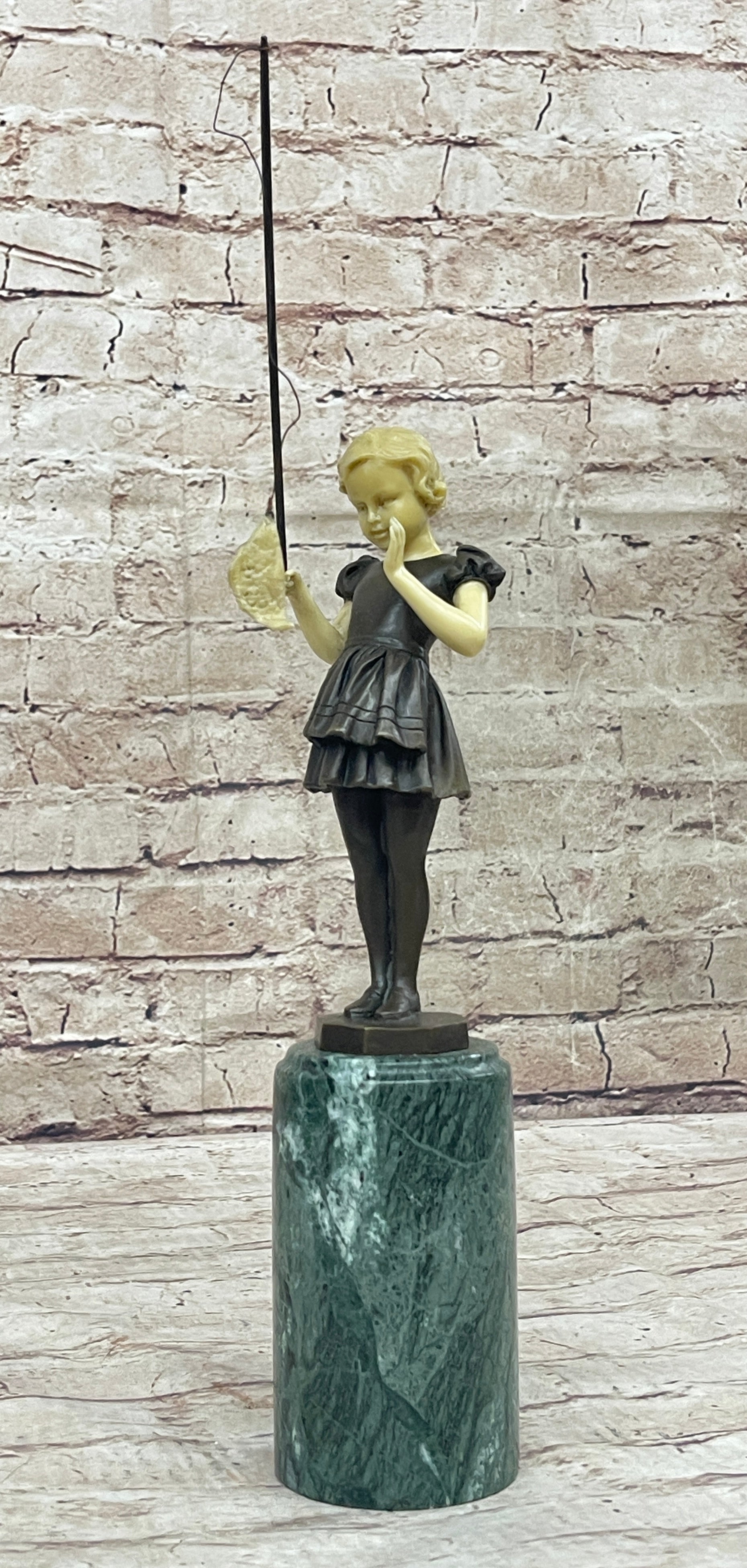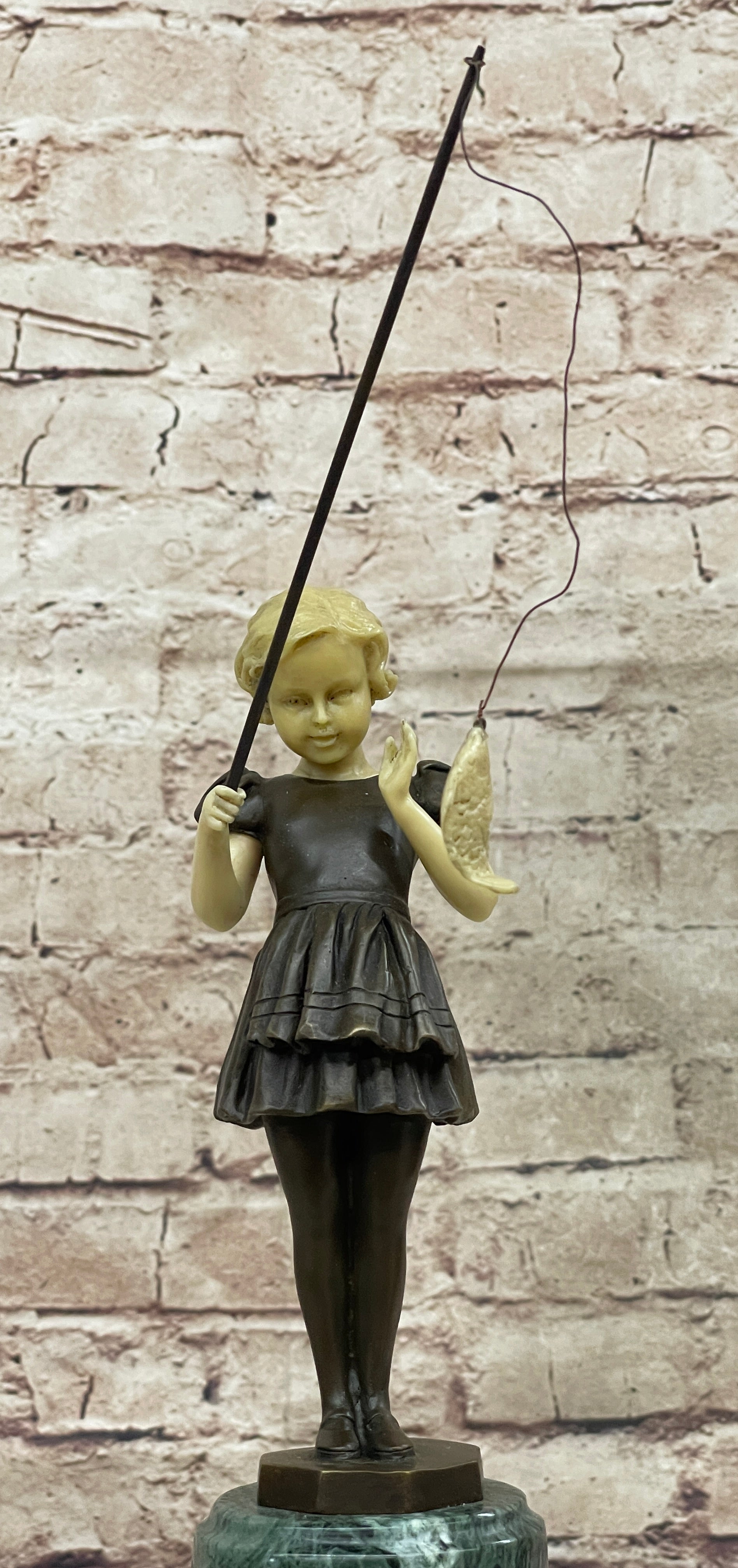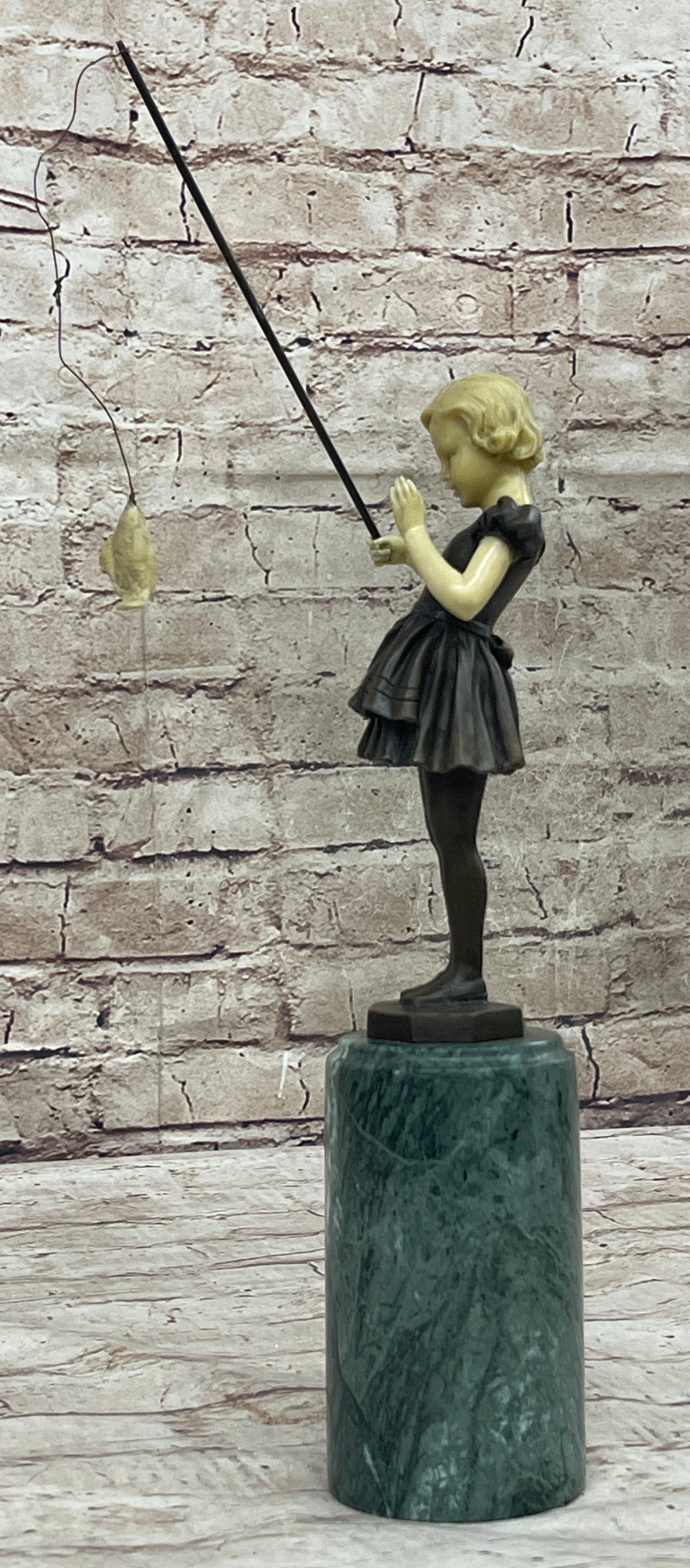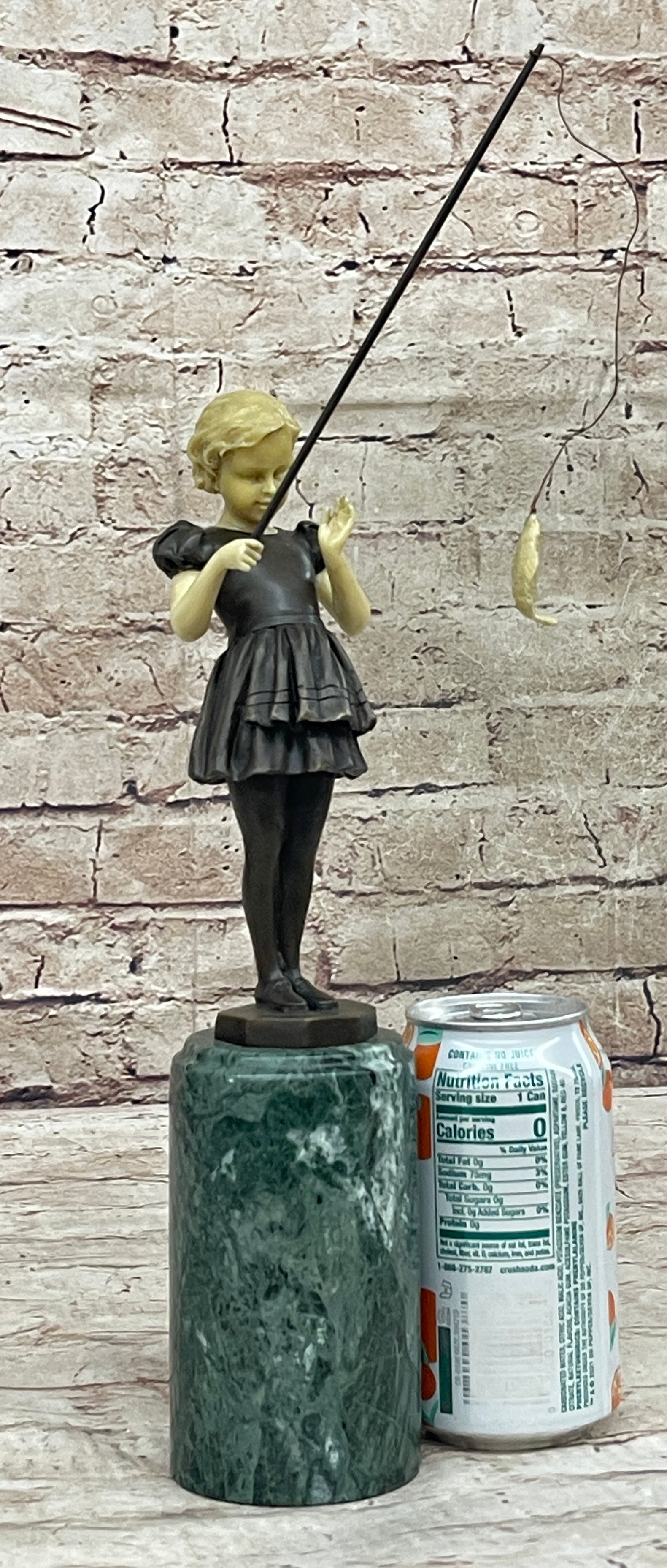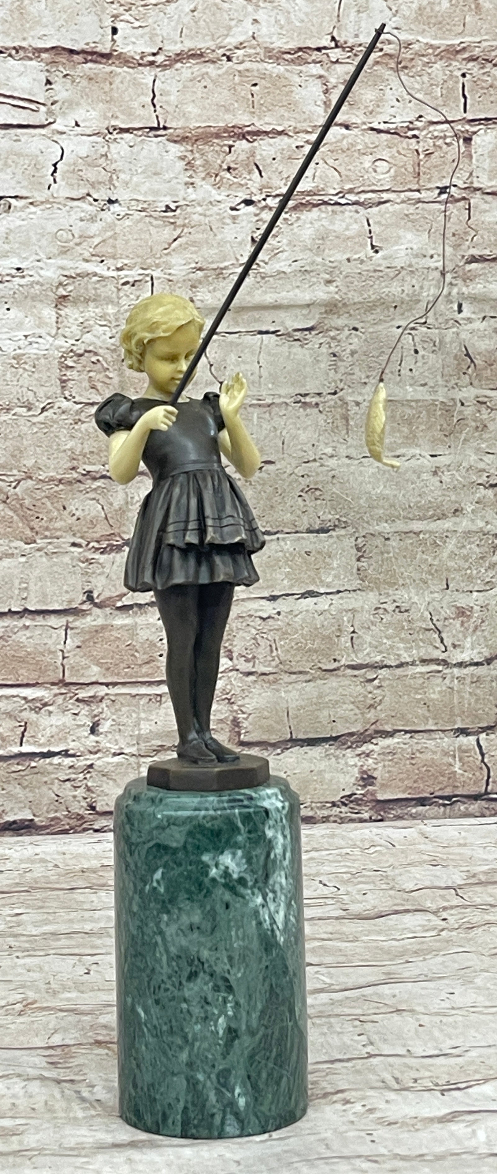 Young Girl Child Fishing Bronze Metal Statue Sculpture Figure on Marble Base