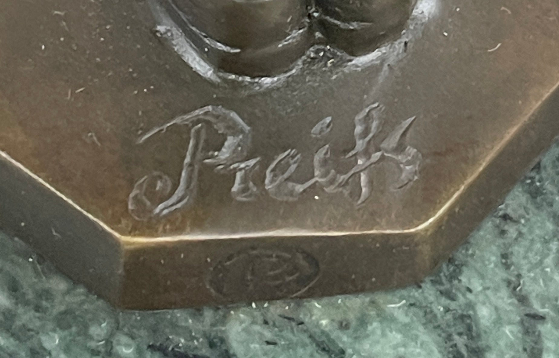 Mounted on a base made of elegant green marble, this sculpture stands as a testament to the artist's skill and creativity. It is signed by the esteemed artist Preiss, further enhancing its value and quality.
