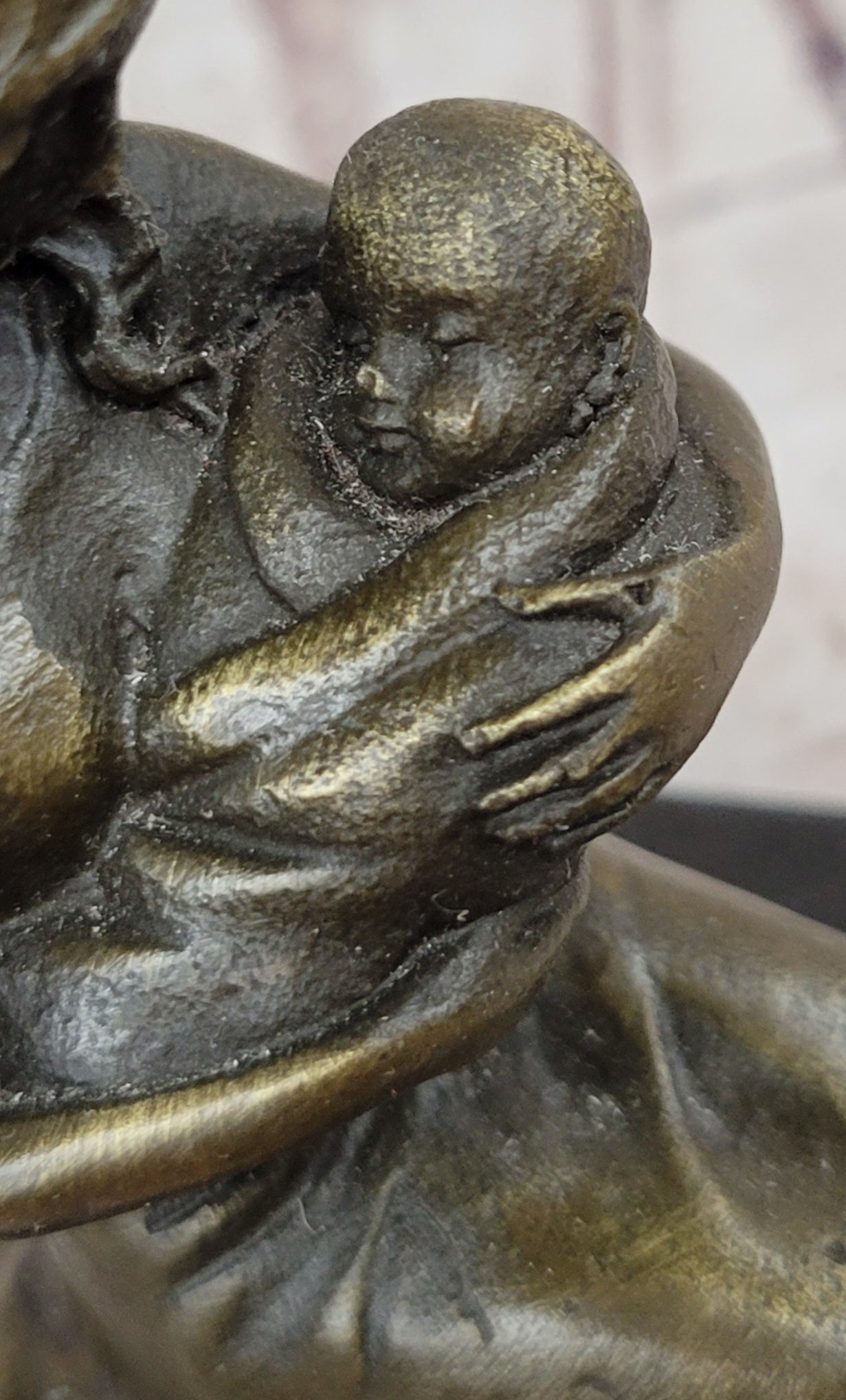 This touching bronze sculpture captures the profound bond between a young mother and her newborn child, evoking a sense of reverence and wonder at the miracle of life. Kneeling on the hearth of Mother Earth, the mother cradles her bundled child, gazing down at the sleeping infant with a tender expression of awe and adoration. As she beholds the purity and innocence of her child's face, she is filled with a sense of renewal and joy, rediscovering the beauty and wonder of life through the eyes of her newborn.