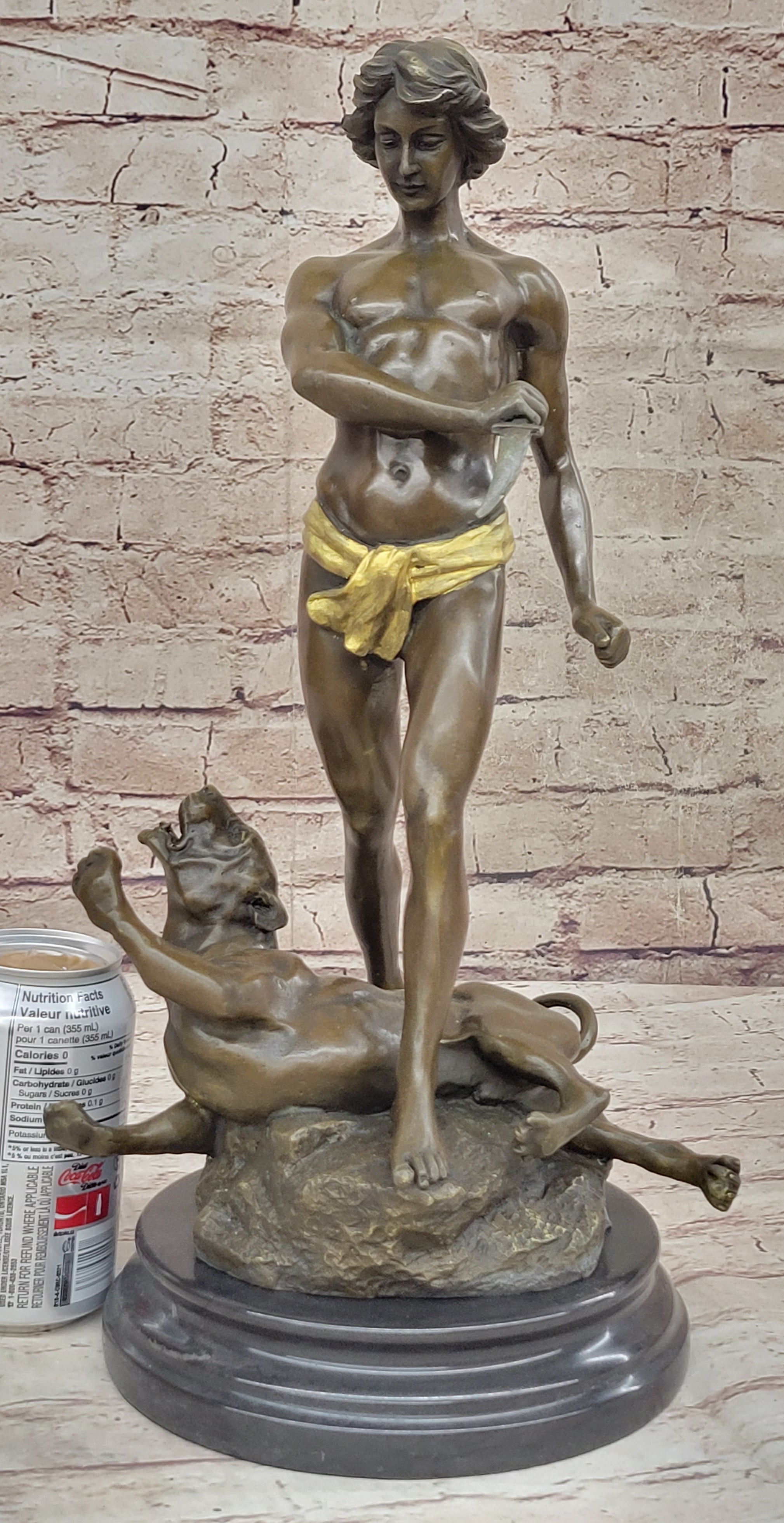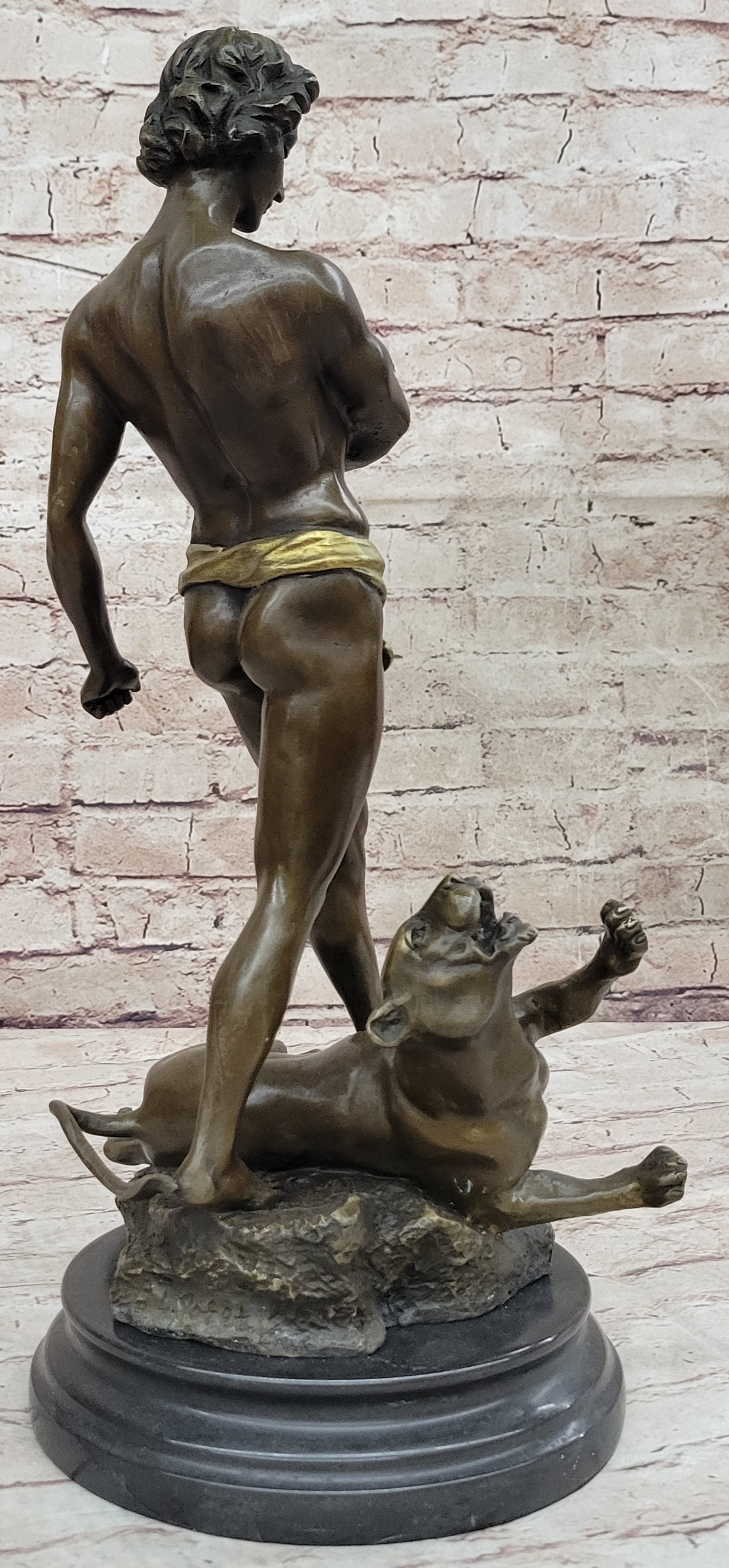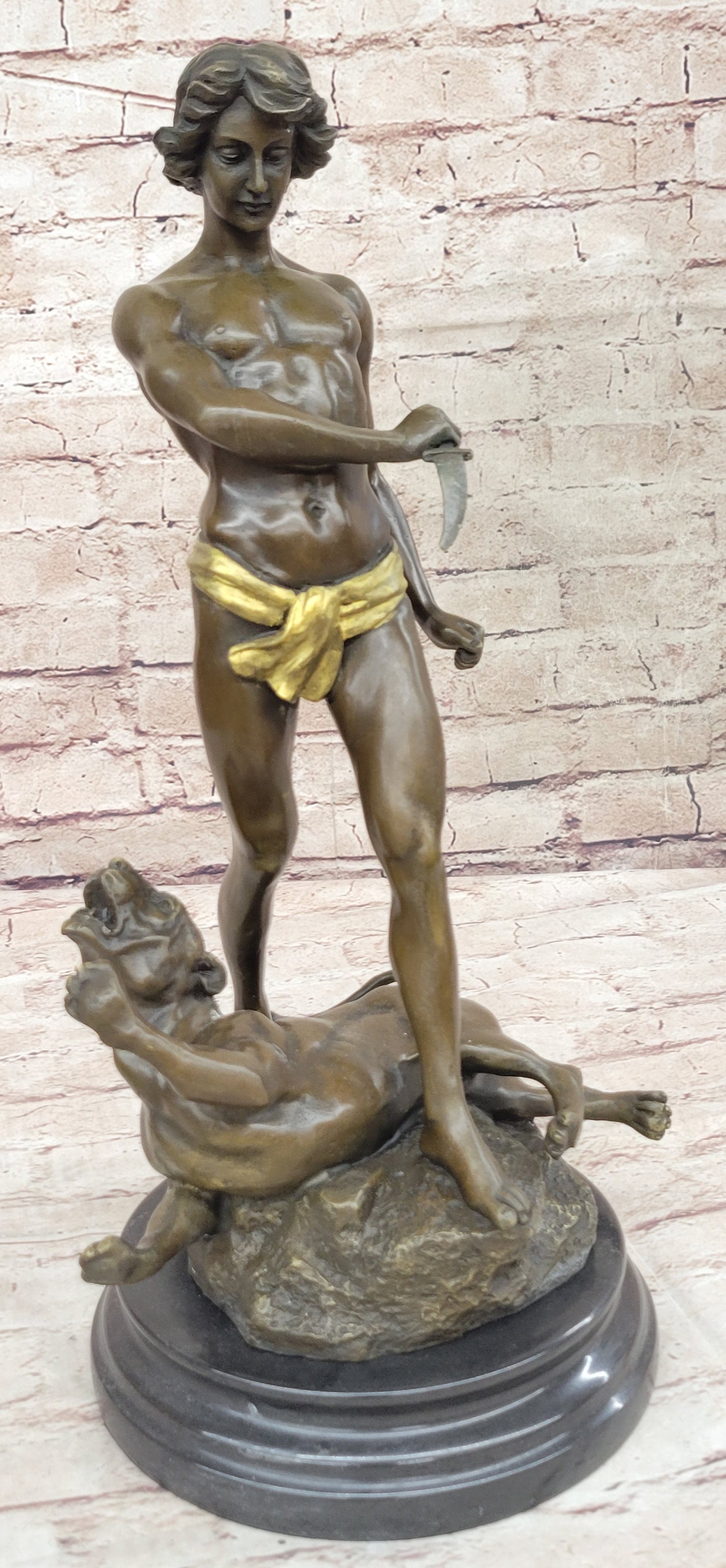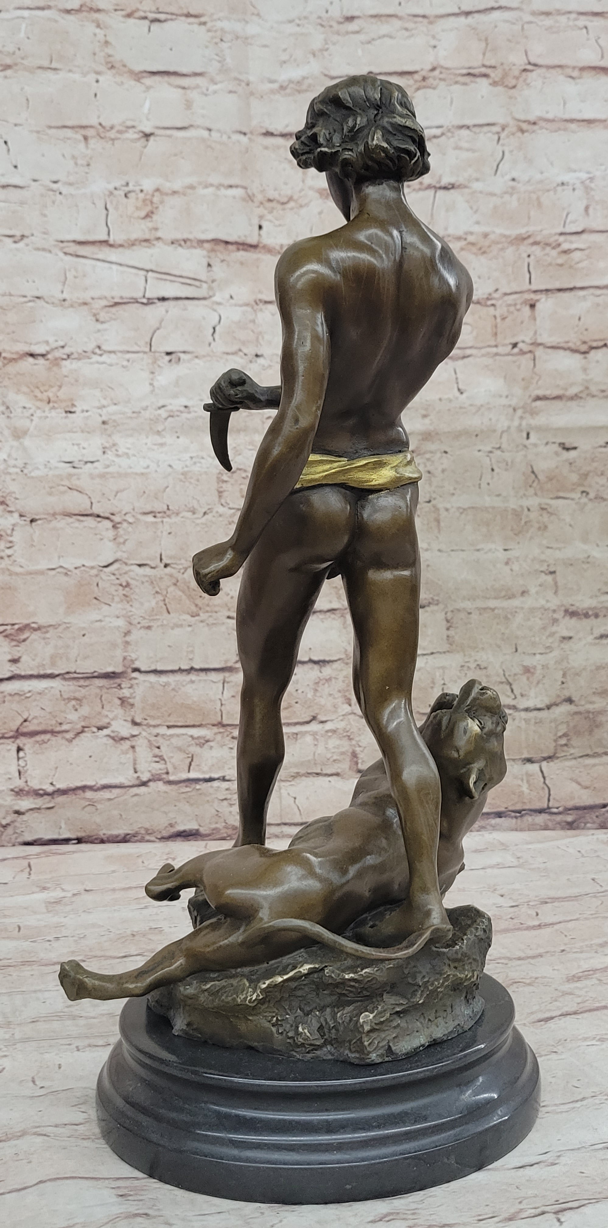 Young Tarzan Killing Leopard 100% Solid Bronze Statue Sculpture Figurine