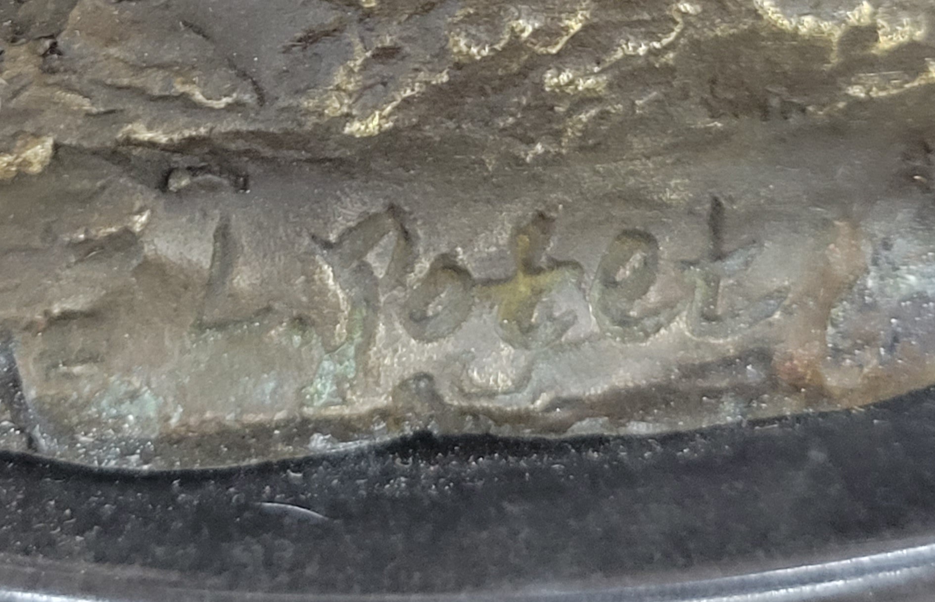Embrace the powerful presence of the Lion Slayer bronze sculpture. This remarkable artwork, crafted in the Art Nouveau style by the skilled artist L. Potet, captures a moment of triumph and bravery. The sculpture portrays a figure adorned with intricate details, fearlessly confronting a majestic lion. Meticulously crafted using the revered lost wax method, the Lion Slayer sculpture showcases the highest level of craftsmanship and attention to detail. The lifelike representation of the scene is brought to life through the fine artistry involved in the casting process. The sculpture features a rich brown patina with gold accents, adding depth and a touch of elegance to the piece. Mounted on a sleek black marble base, this bronze masterpiece stands as a testament to the artist's talent and creativity. The juxtaposition of the smooth marble and the textured bronze creates a visually striking display. The sculpture bears the signature of the esteemed artist L. Potet, ensuring its authenticity and artistic value. Experience the captivating allure of the Lion Slayer bronze sculpture, and invite a sense of bravery and artistry into your space. Whether displayed in a private art collection or showcased as a focal point in your home, this magnificent piece will command attention and inspire admiration. Immerse yourself in the world of Art Nouveau and appreciate the beauty and symbolism that this sculpture embodies.