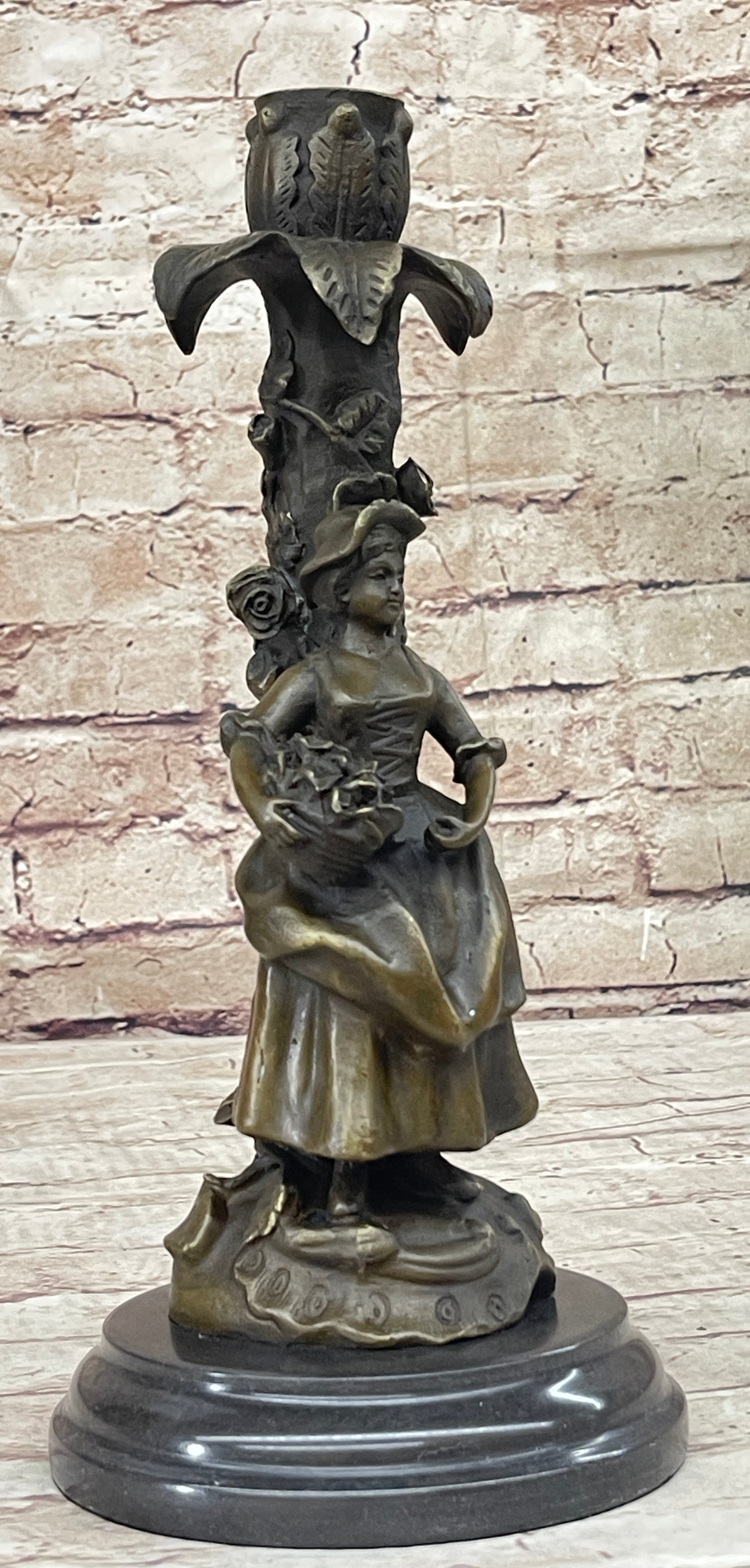 Young Woman Holding a Basket of Flowers - Bronze Metal Candle Holder Candelabra Sculpture