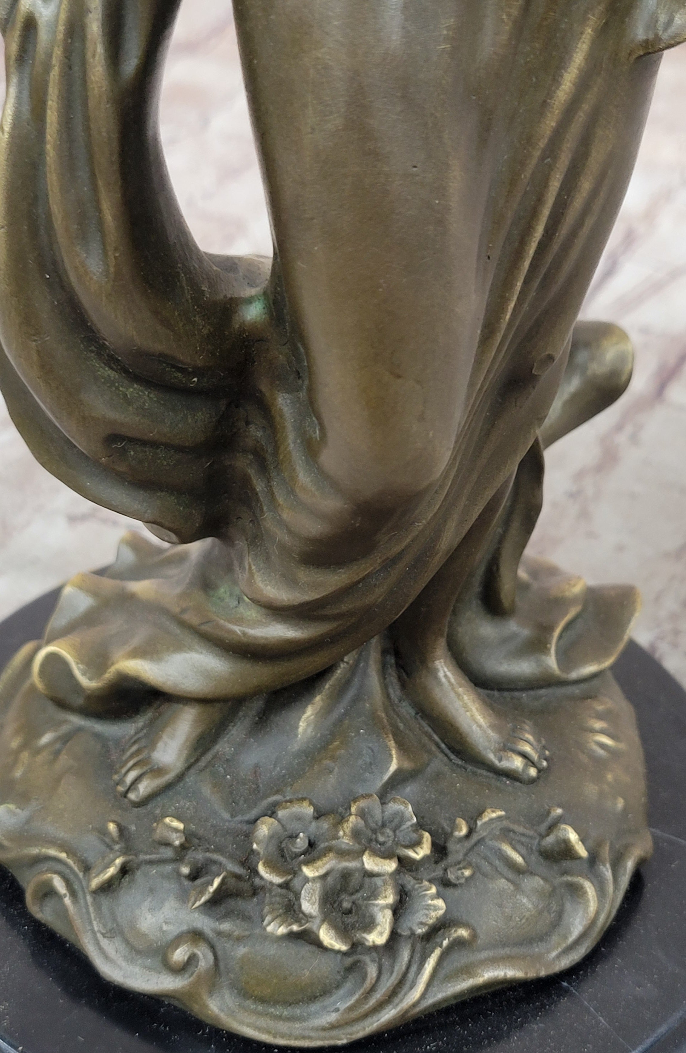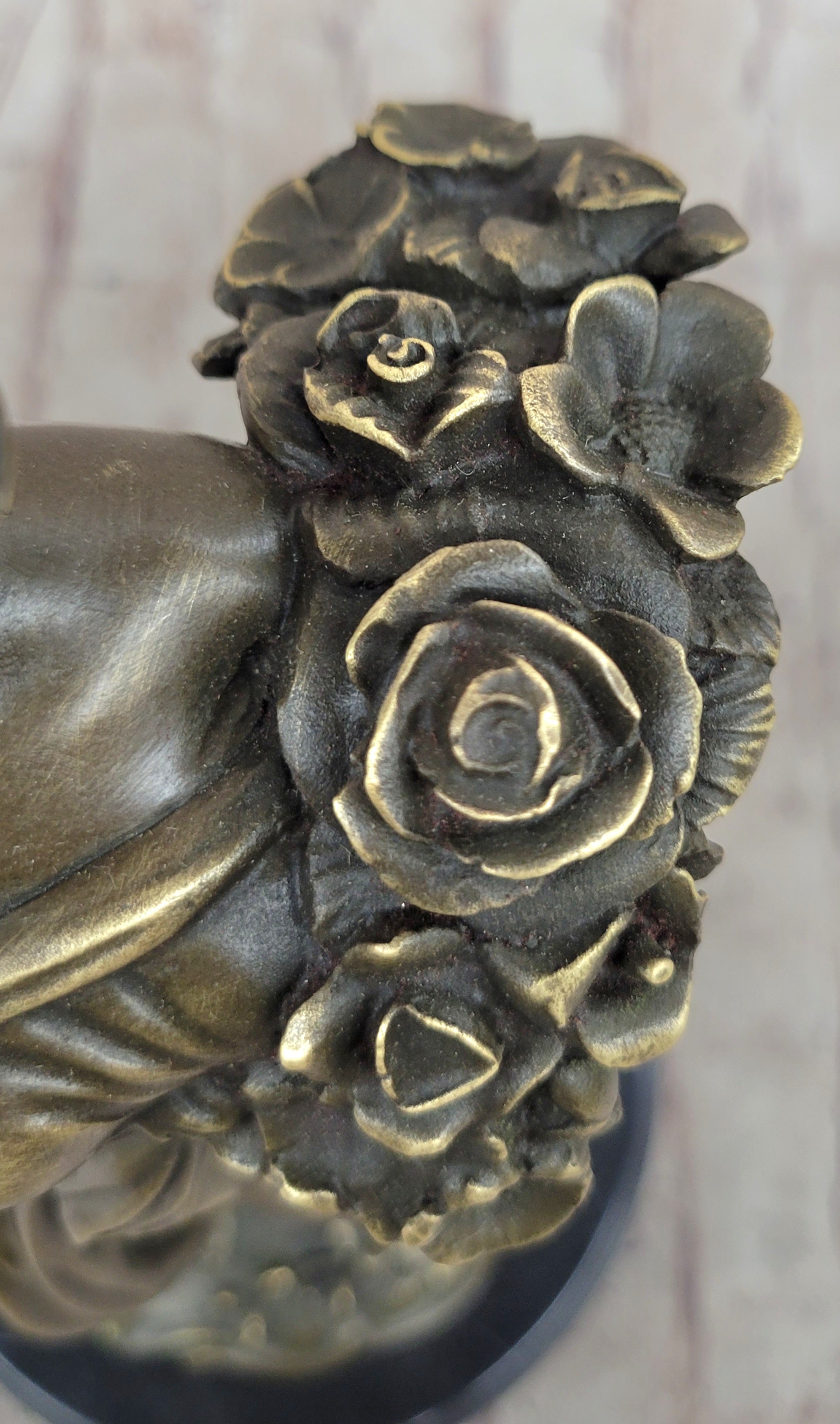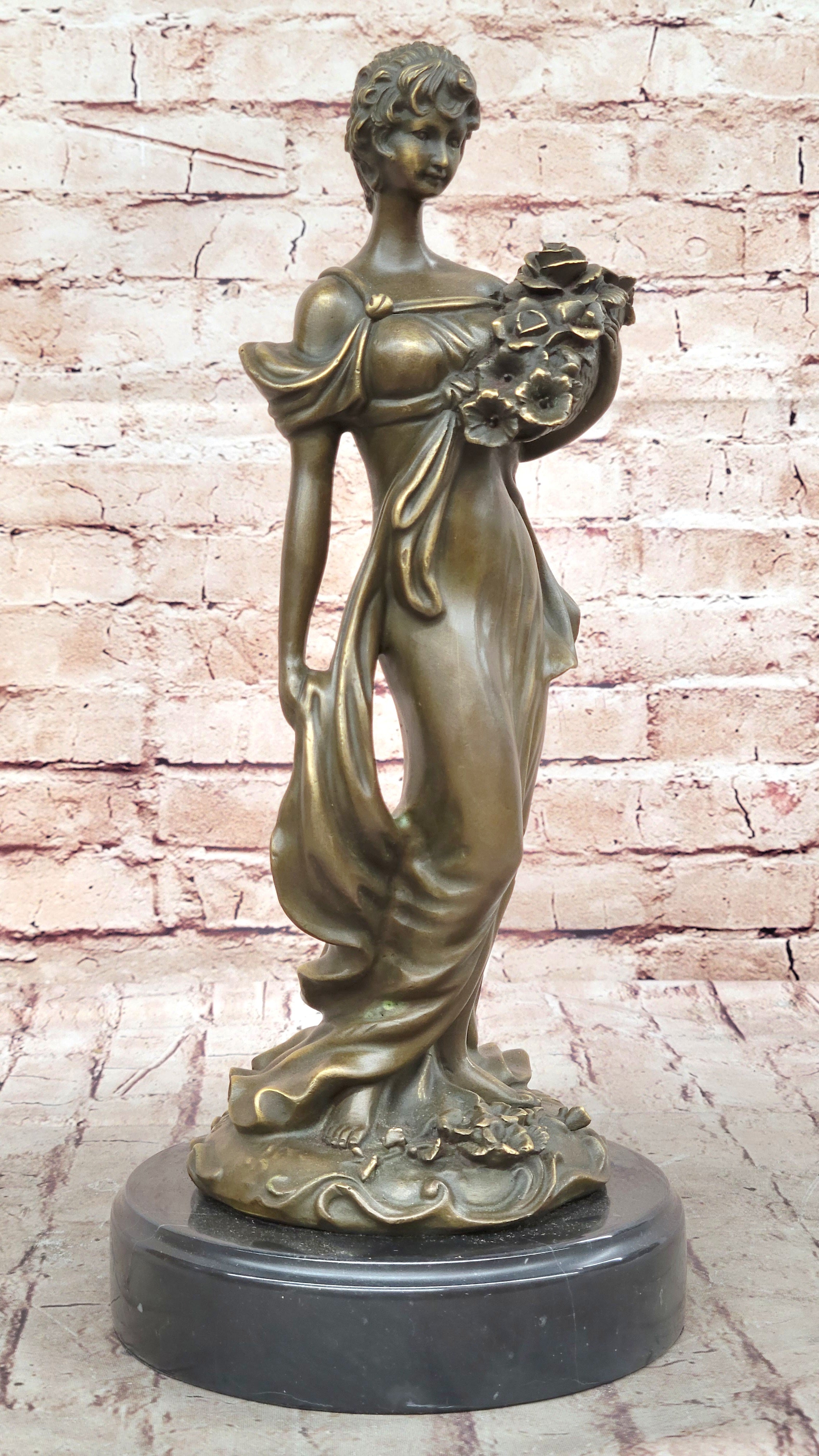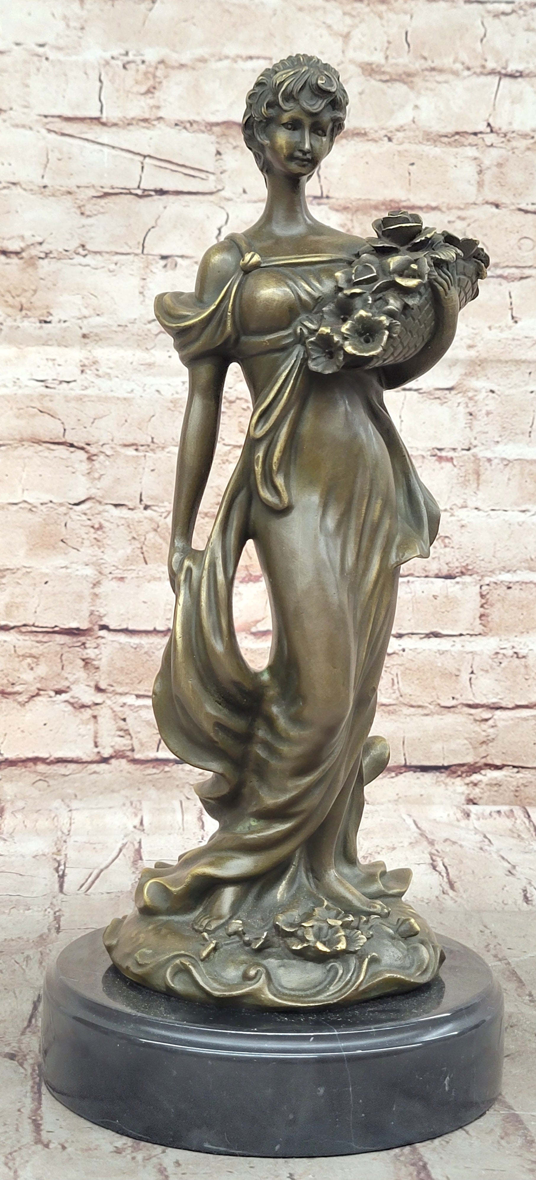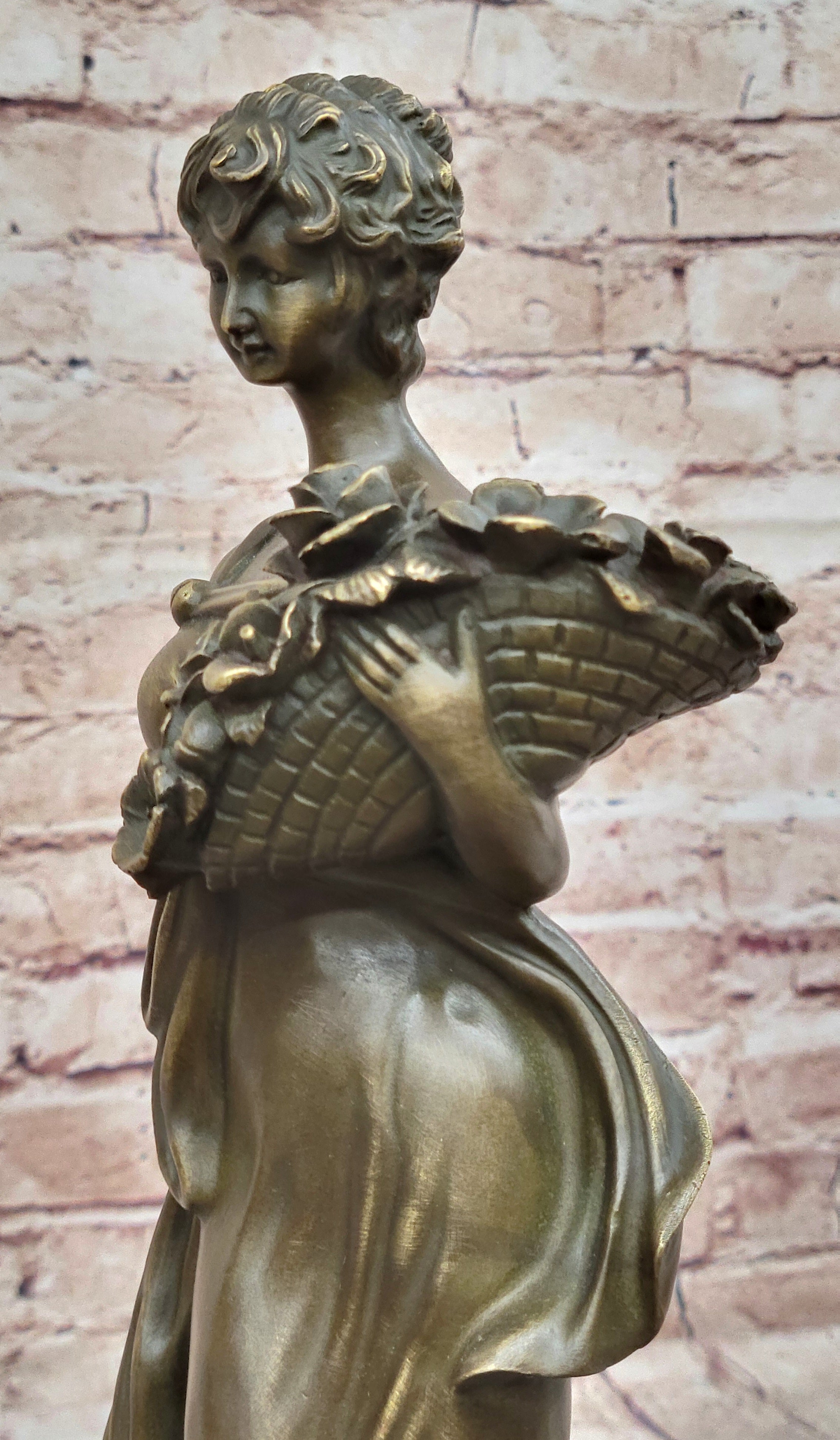 Discover the elegance of this stunning bronze sculpture depicting a beautiful woman gracefully holding a flower basket. Handcrafted using the traditional lost wax method, this exquisite piece showcases the artist's exceptional skill and attention to detail. The sculpture features a captivating two-tone brown patina that enhances its beauty and adds depth to the intricate designs.