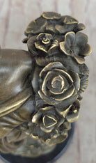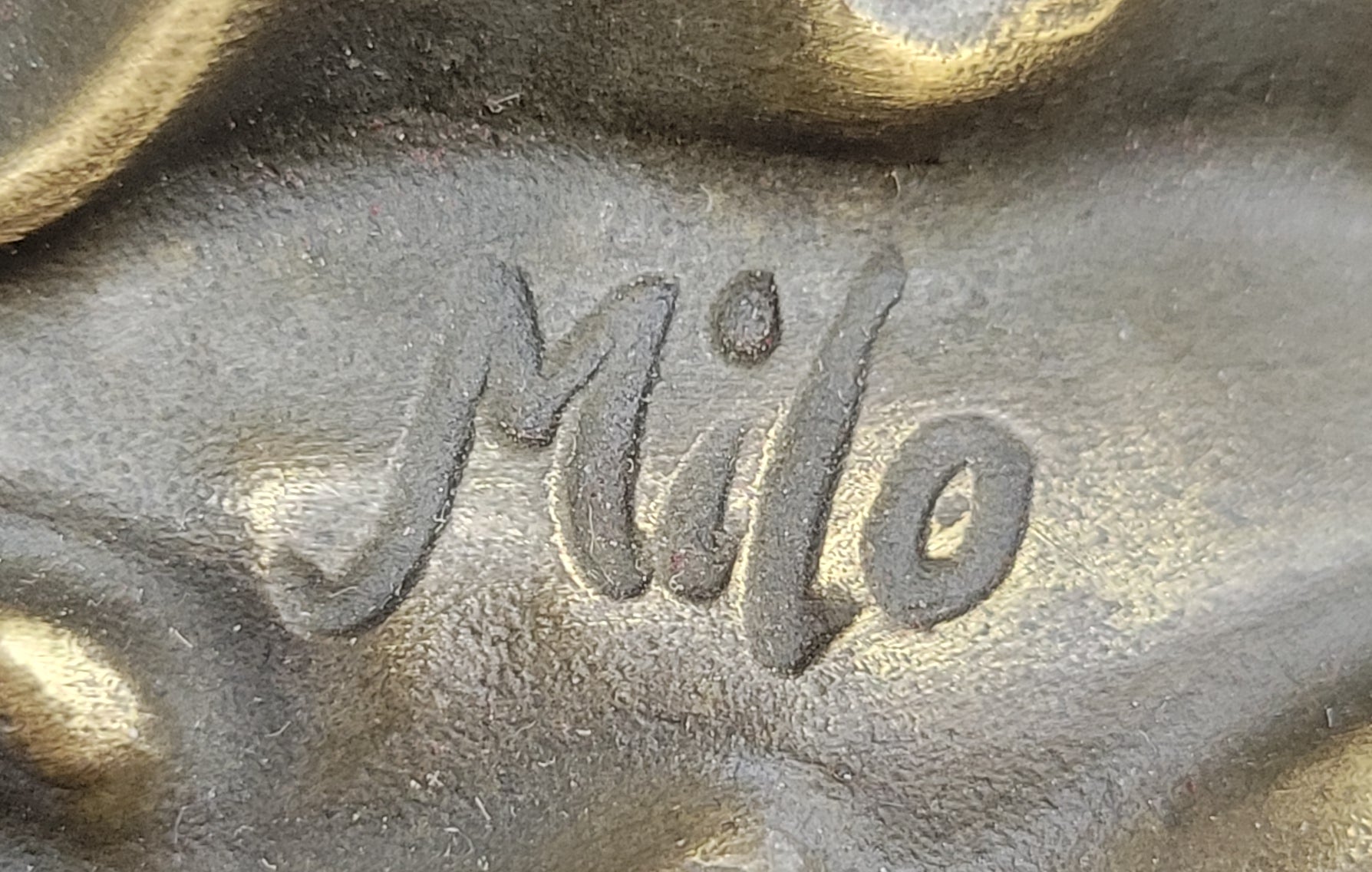 Mounted on a round black marble base, this sculpture not only offers stability but also elevates its overall aesthetic appeal. Signed by the talented artist Miguel Lopez, known as Milo, this piece is a true collector's item that will enhance any space with its charm and artistic flair.Bronze Dimensions with Marble Base: Height 14.5" X Width 7"